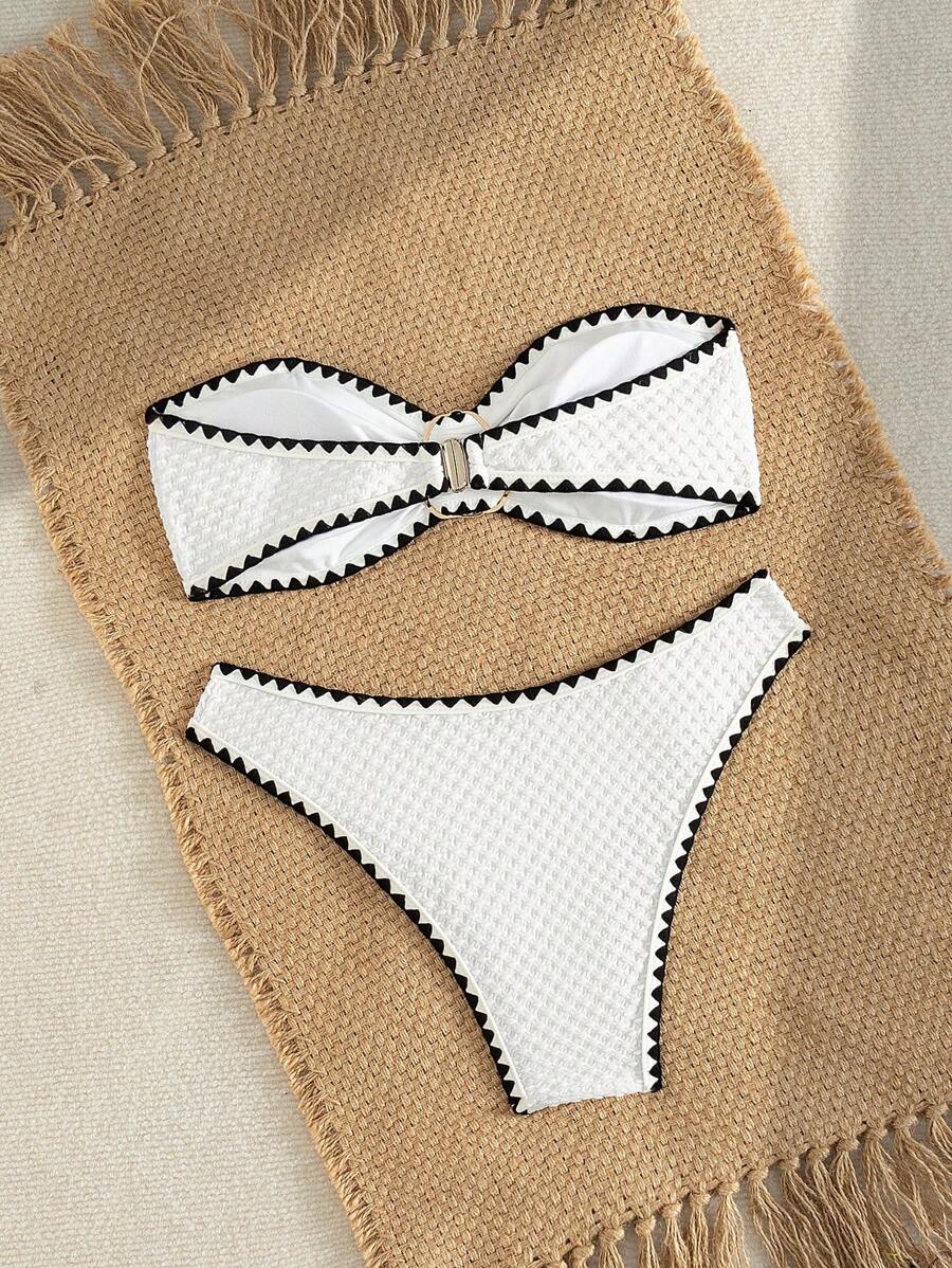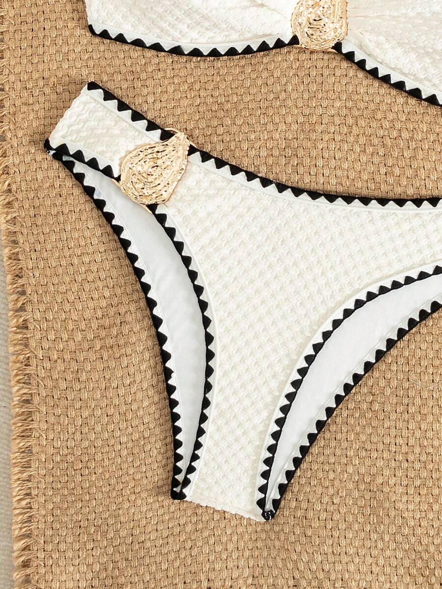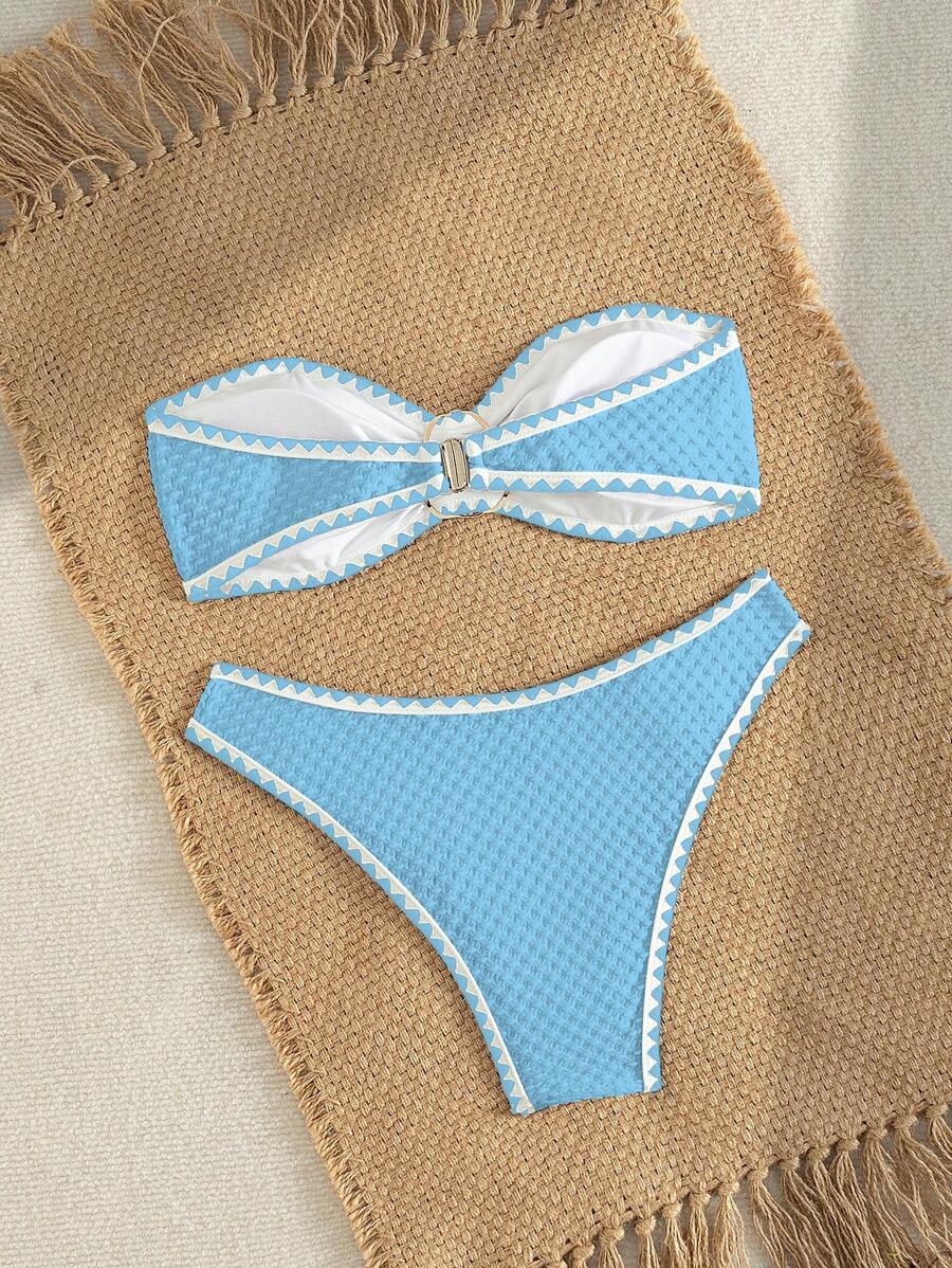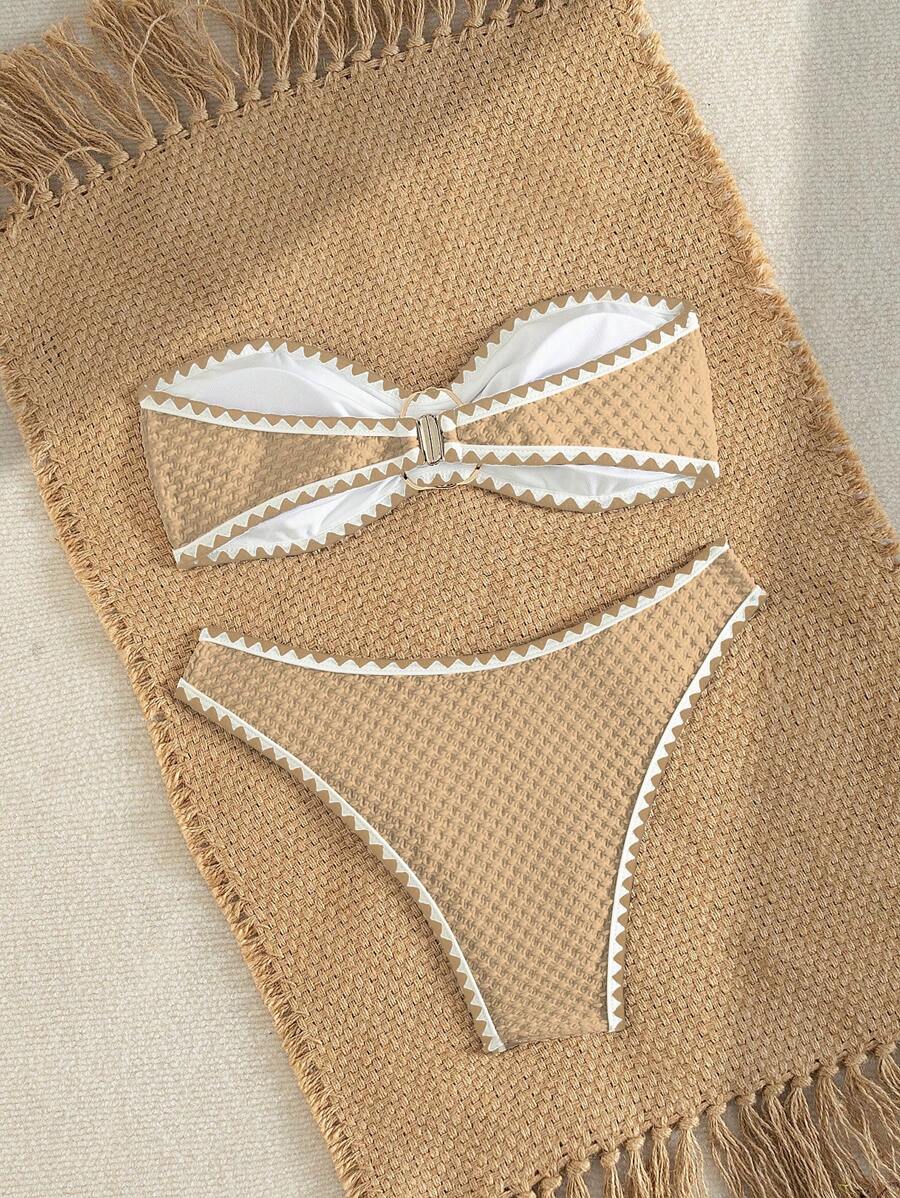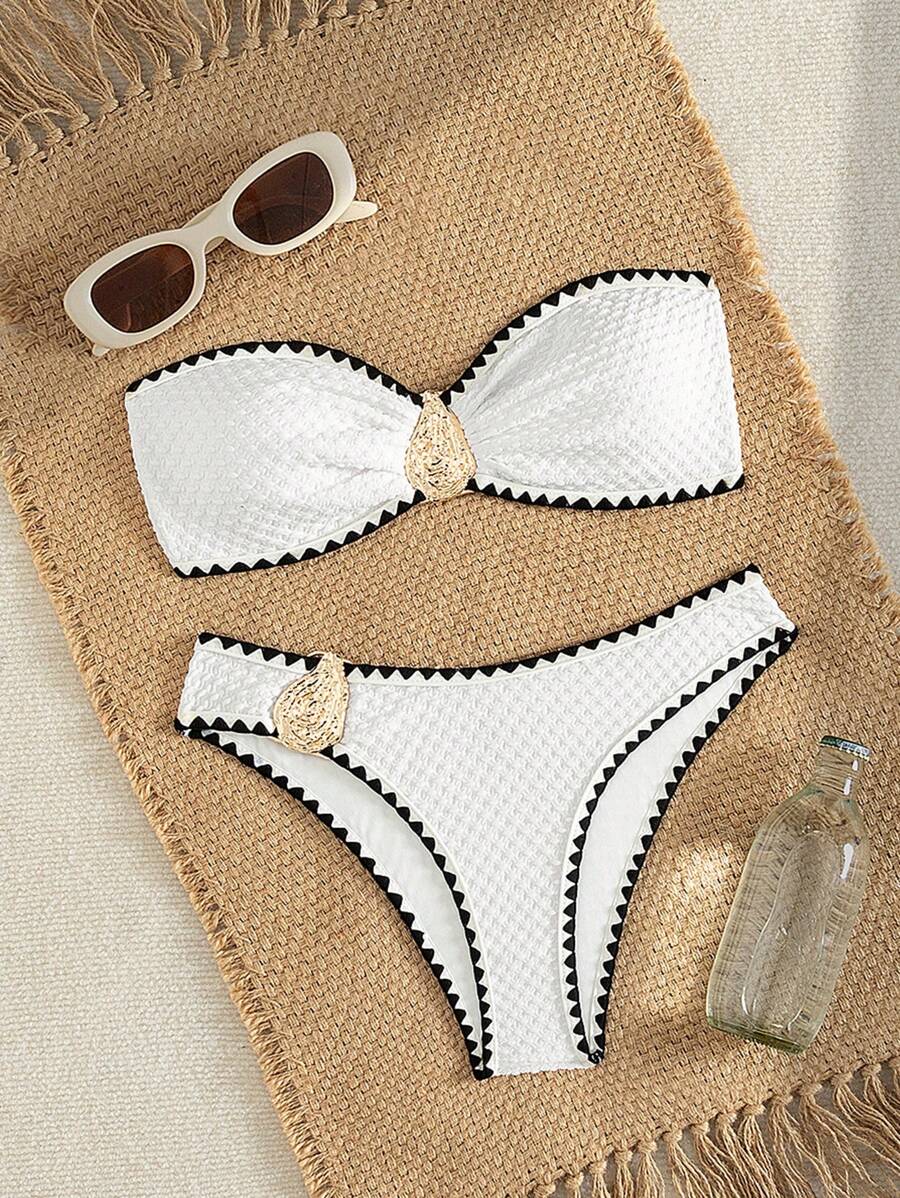 2 piezas conjunto de bikini brasier sin tirantes de unicolor con textura y accesorios metalicos, traje de bano sexy y elegante para vacaciones, playa, fiesta en la piscina para mujer, verano