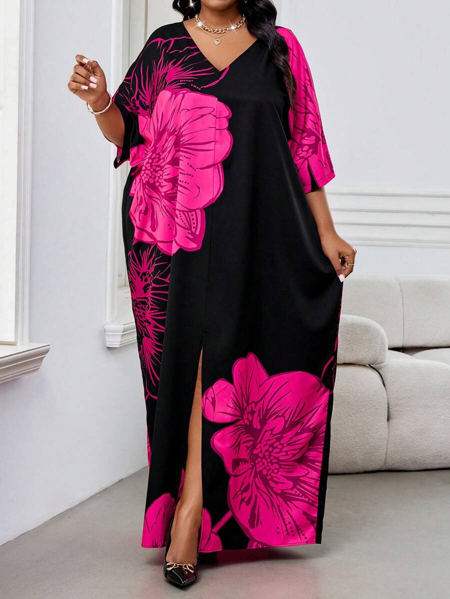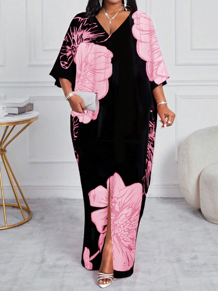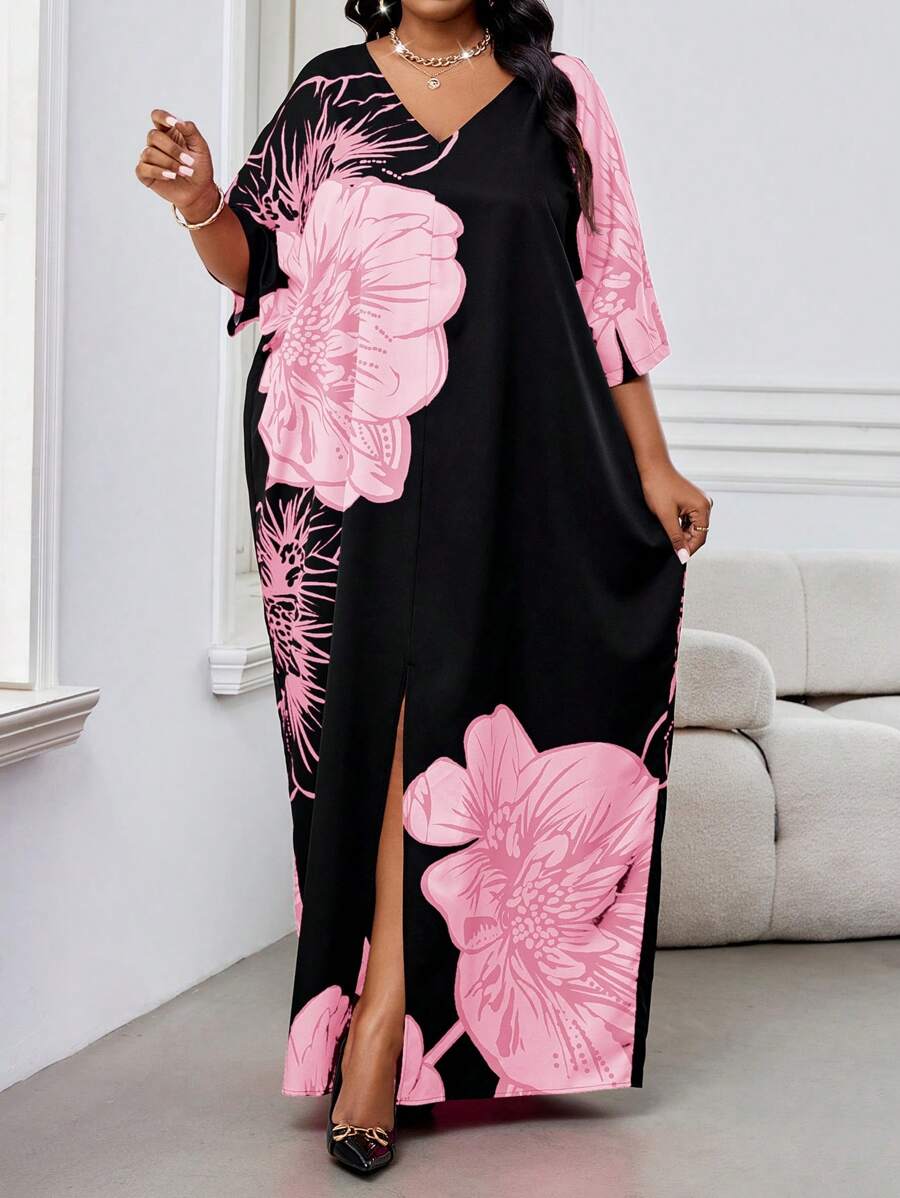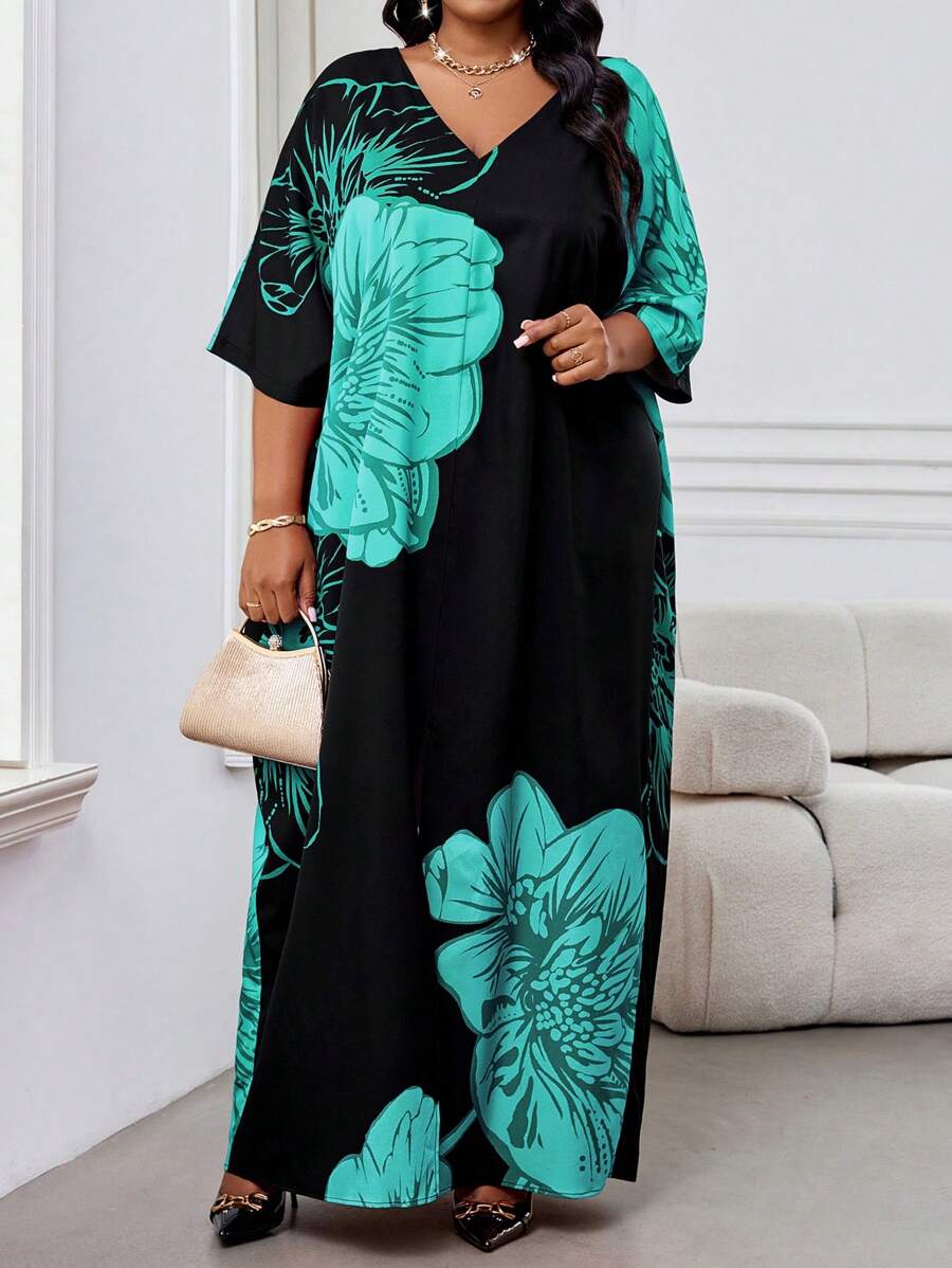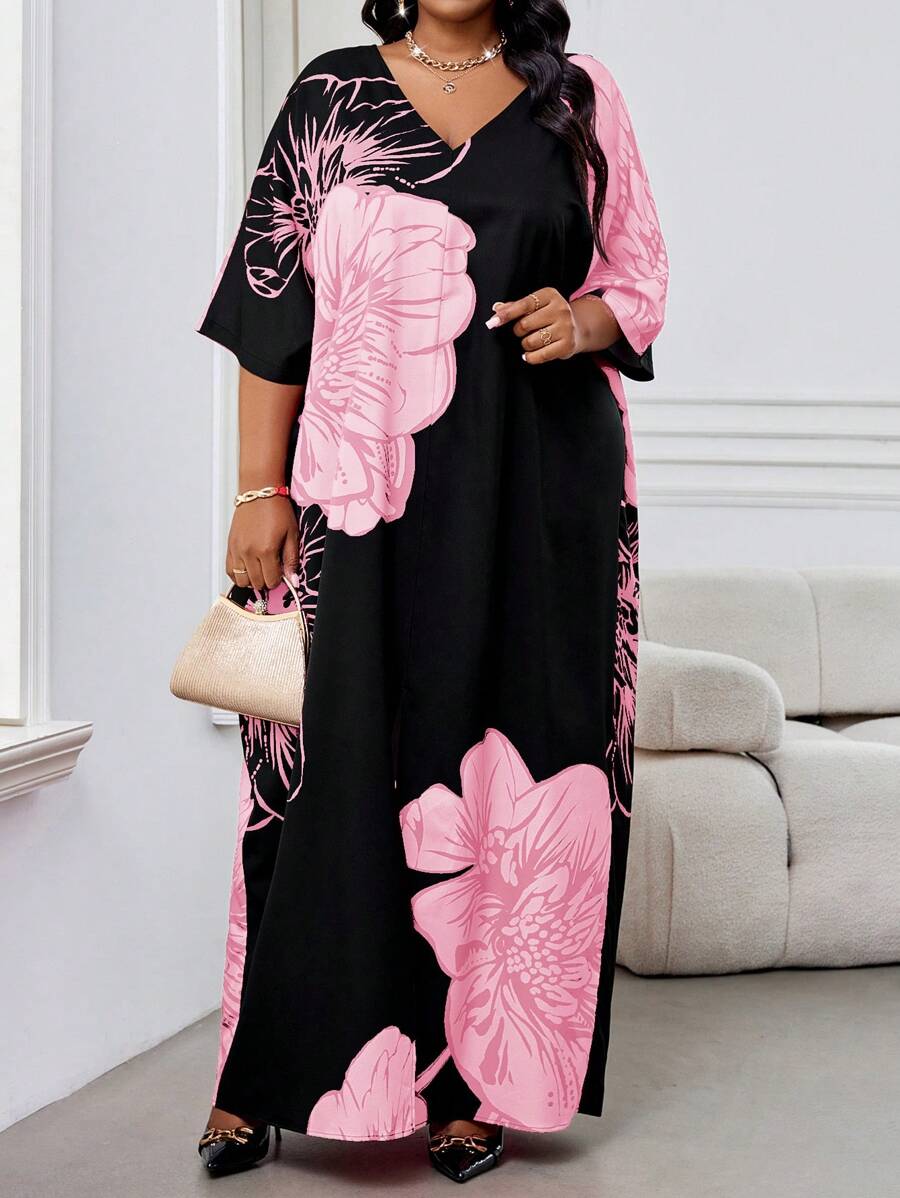 Vestido batas de punto recto con cuello en v elegante y casual de estilo bohemio en negro, vestido largo tipo kaftan para tallas grandes, vestido de pascua para mujeres, conjunto primaveral para mujer
