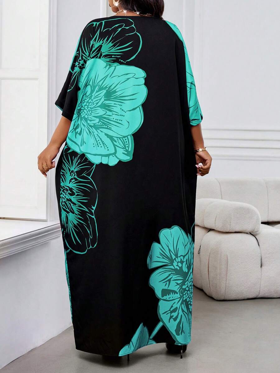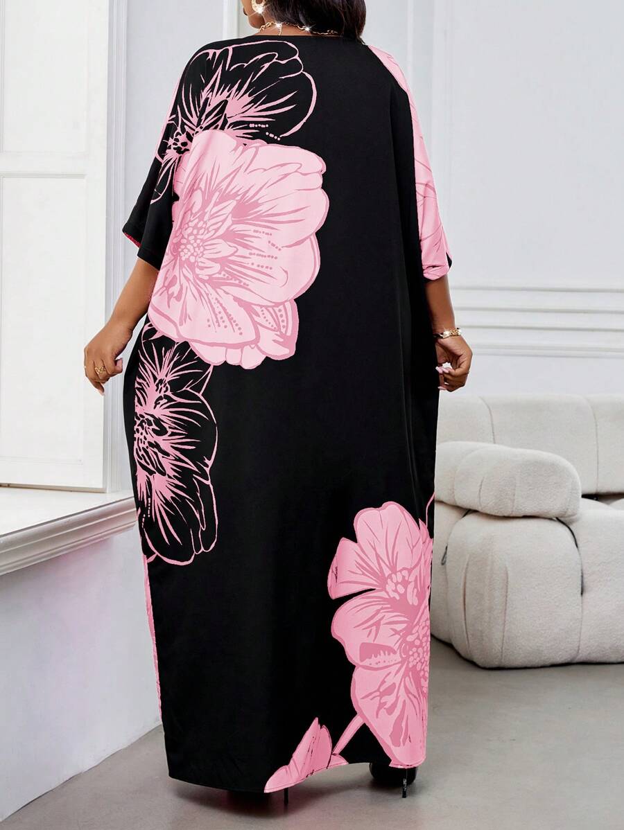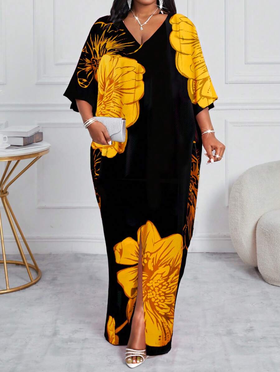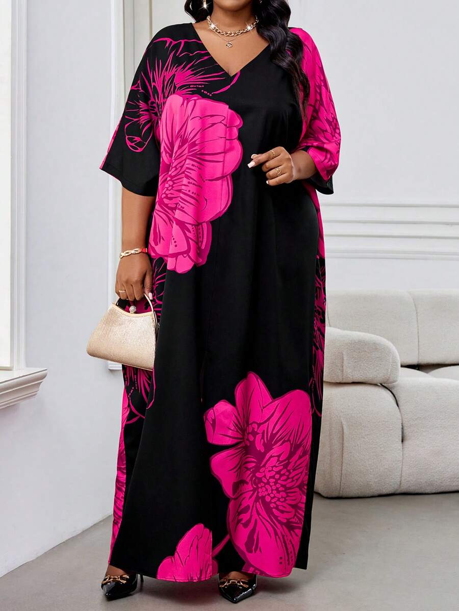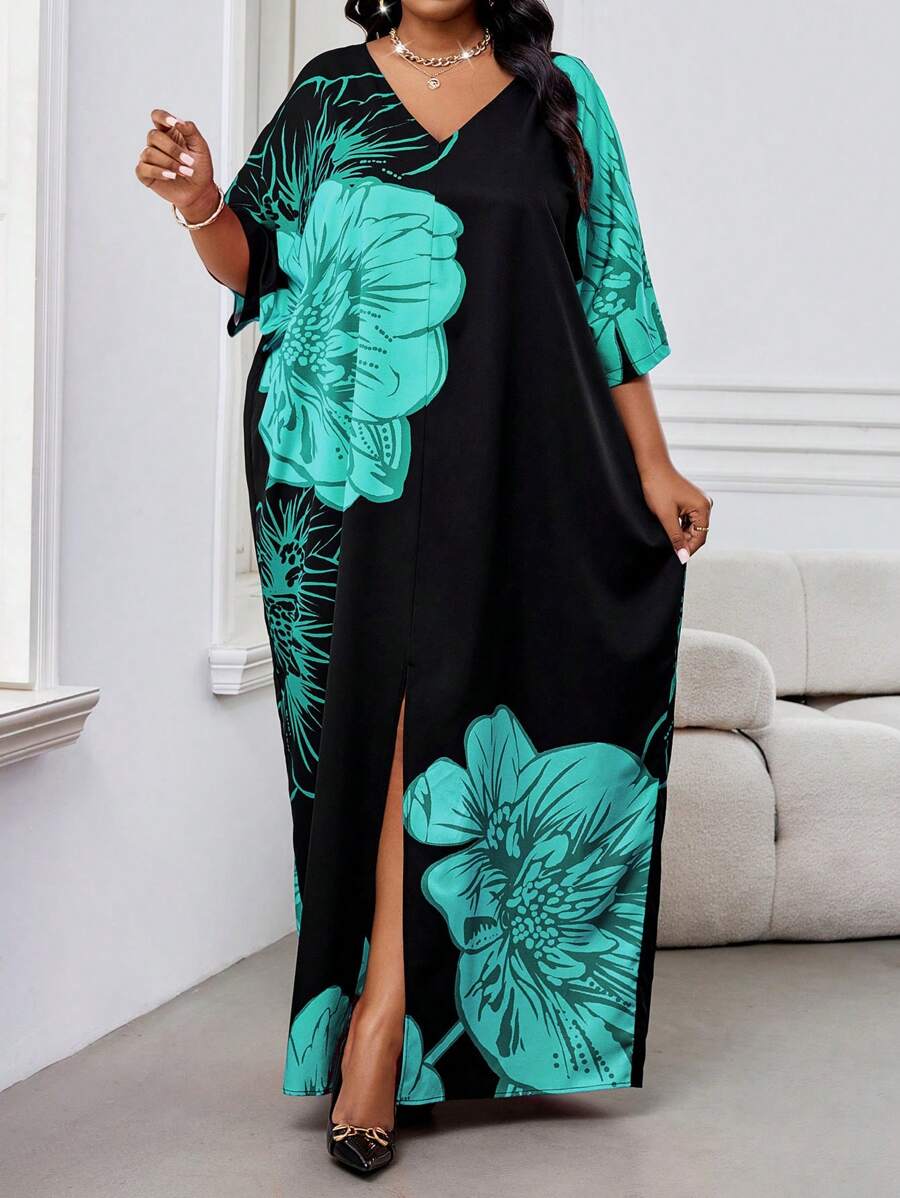 Vestido batas de punto recto con cuello en v elegante y casual de estilo bohemio en negro, vestido largo tipo kaftan para tallas grandes, vestido de pascua para mujeres, conjunto primaveral para mujer