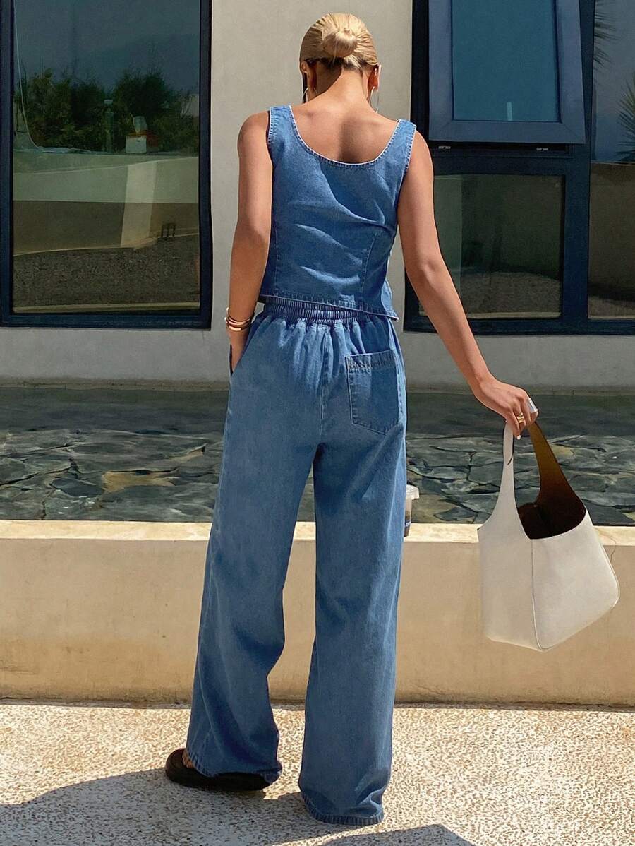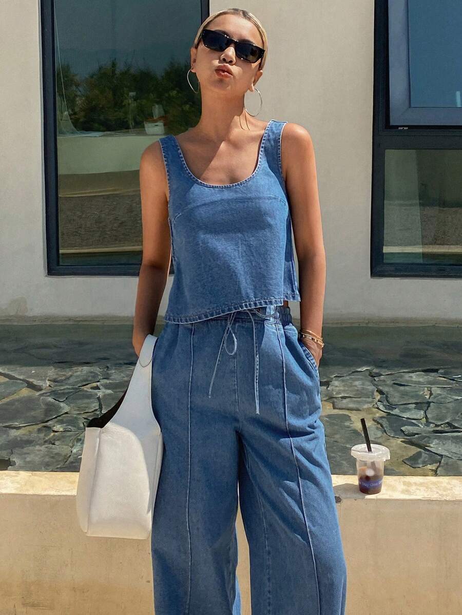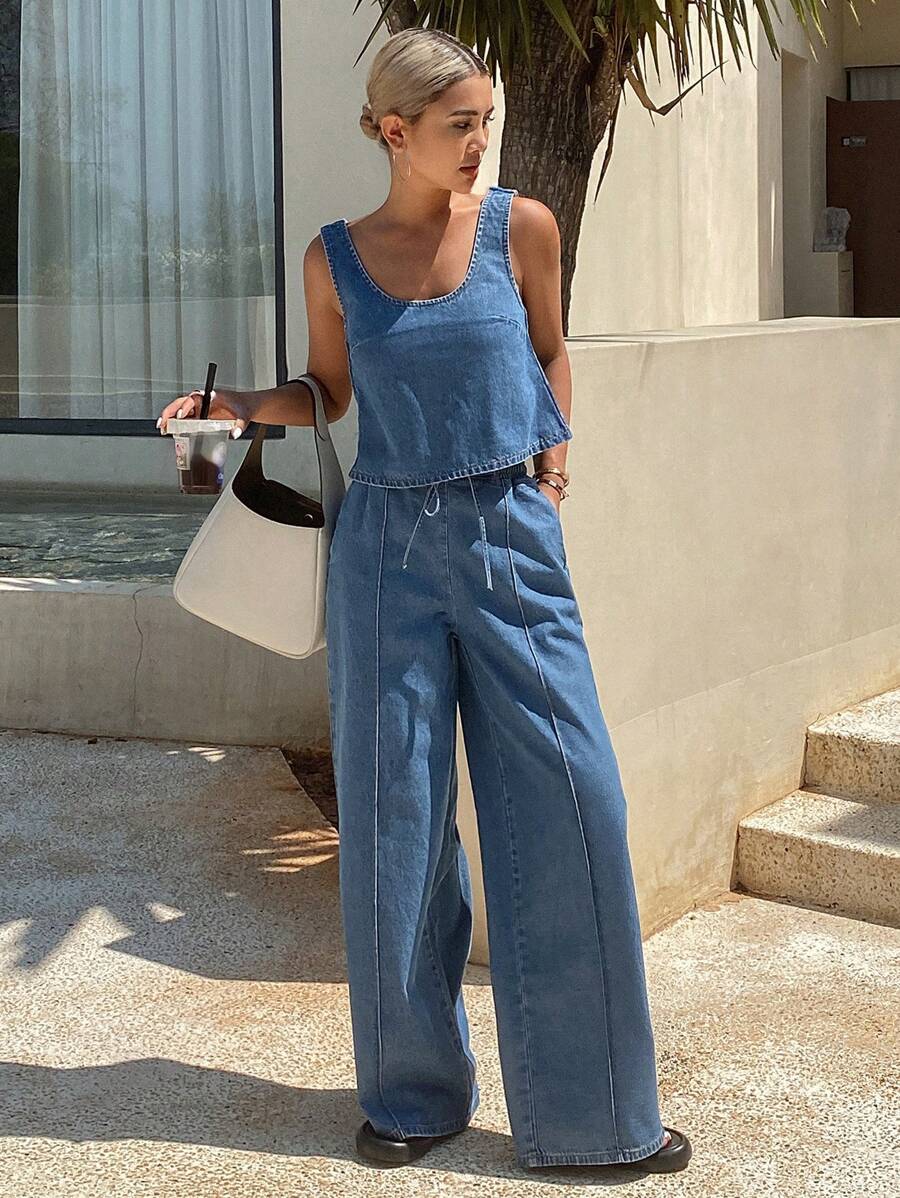 2 piezas conjunto de verano de mujer con camisola de mezclilla y pantalones de mezclilla con cordon en la cintura suelta, ropa casual de vacaciones, ropa de regreso a la escuela