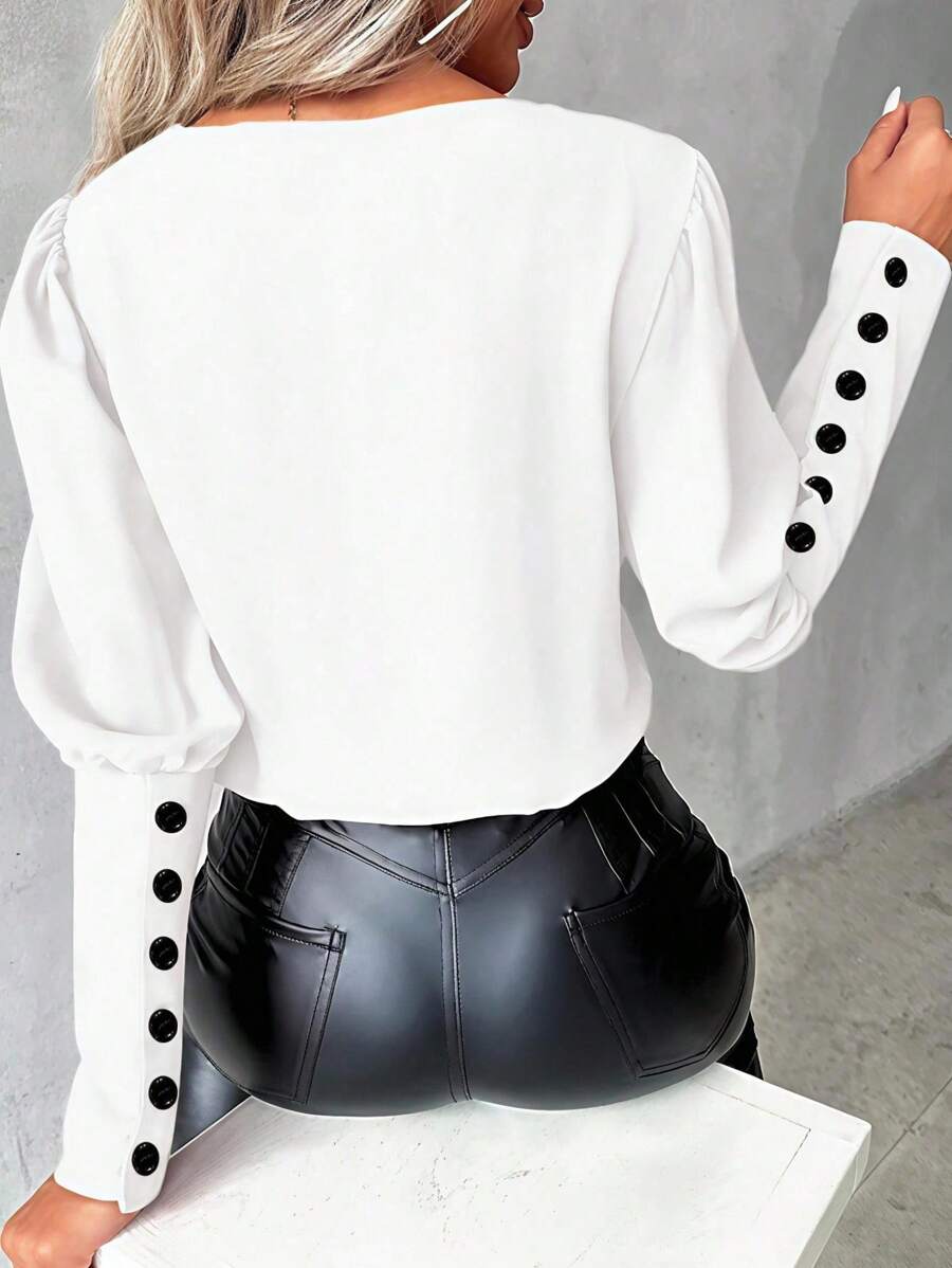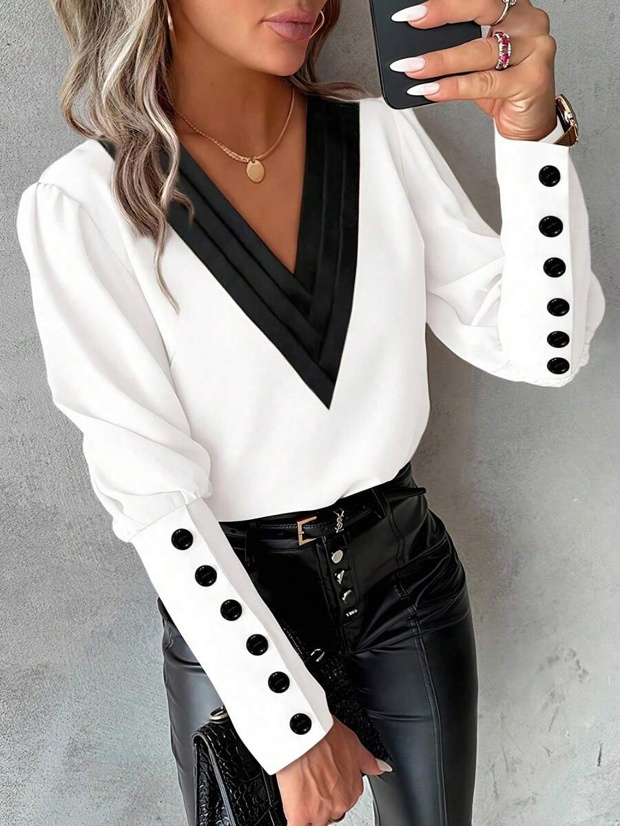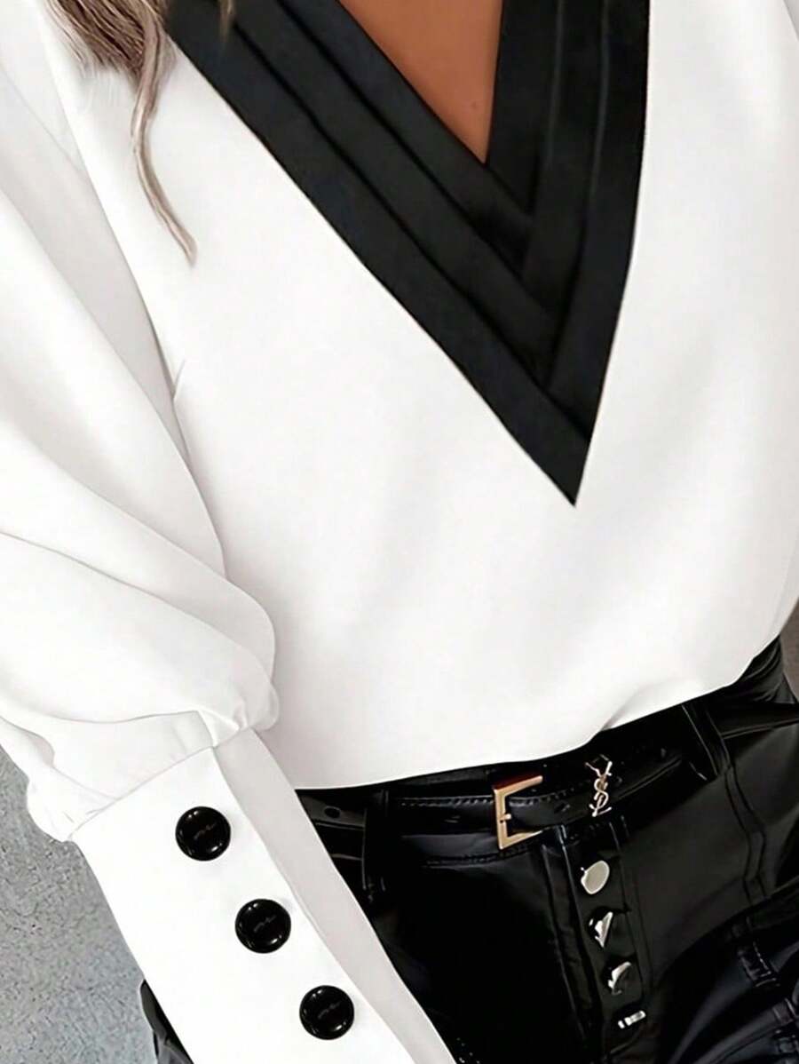 Xyvia blusa de mujer con cuello en v, manga farol y diseno de patchwork