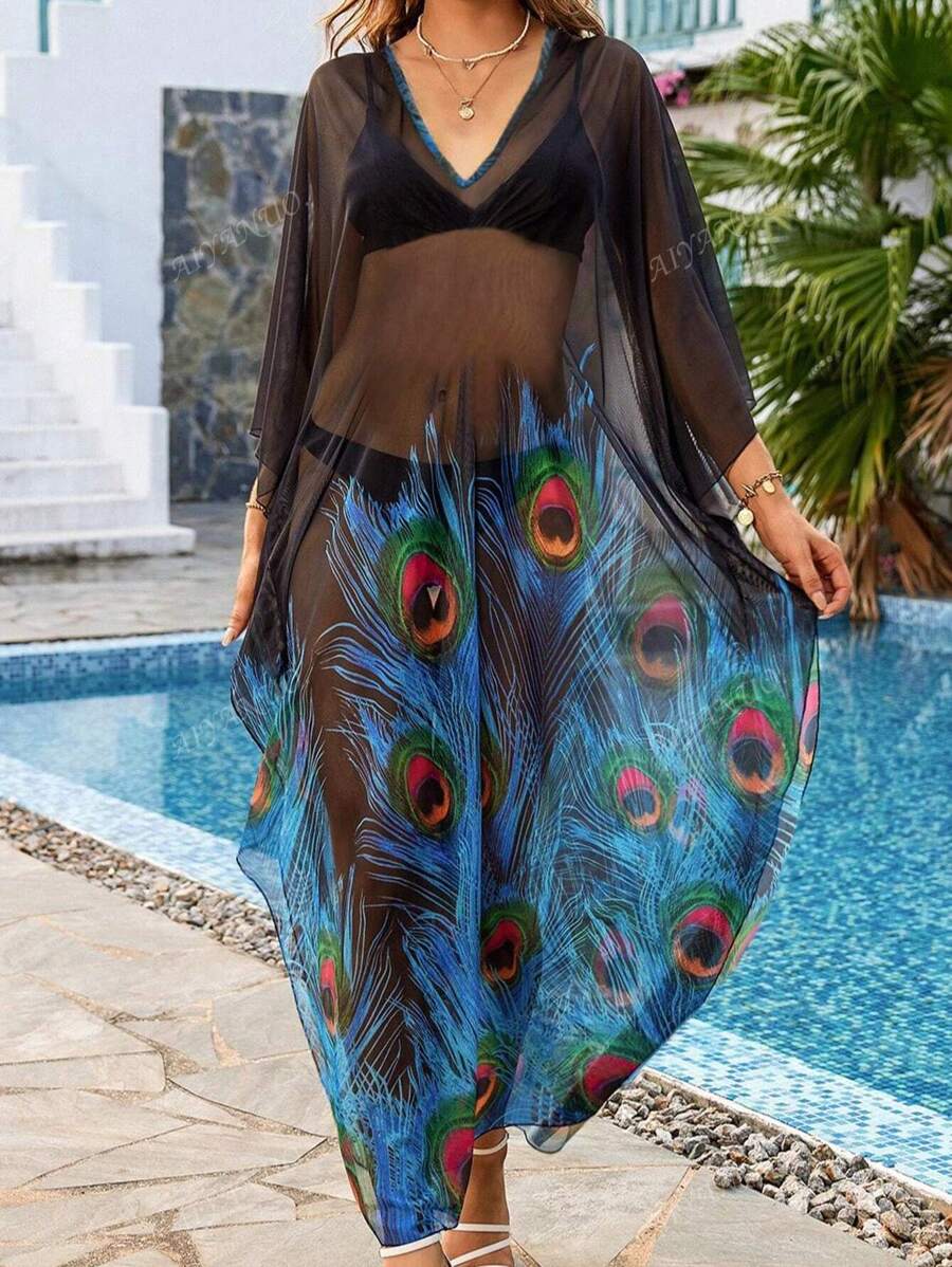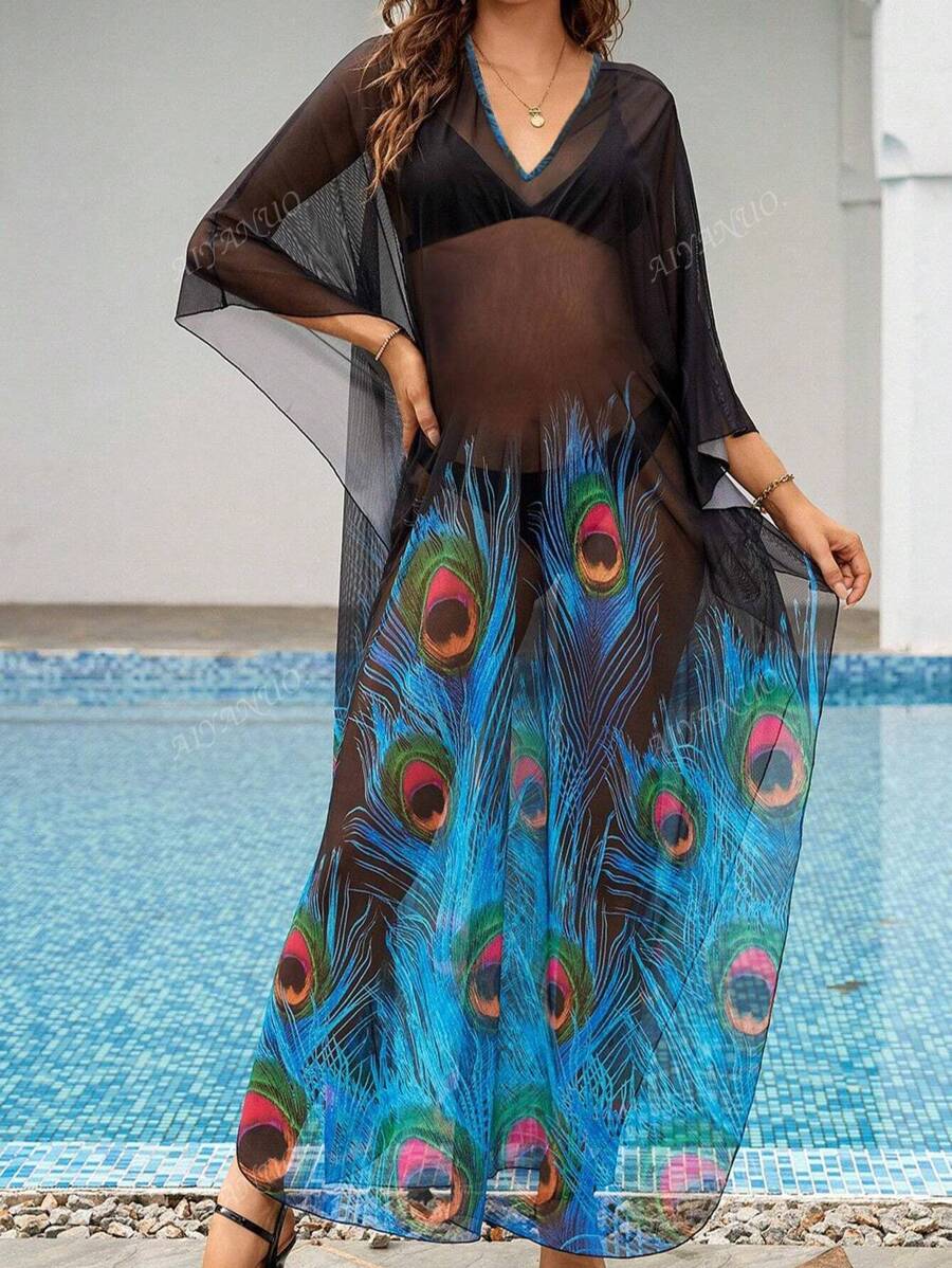 Vestido de cobertura transparente de gasa con estampado de plumas de pavo real, sexy y de talla grande para verano y playa