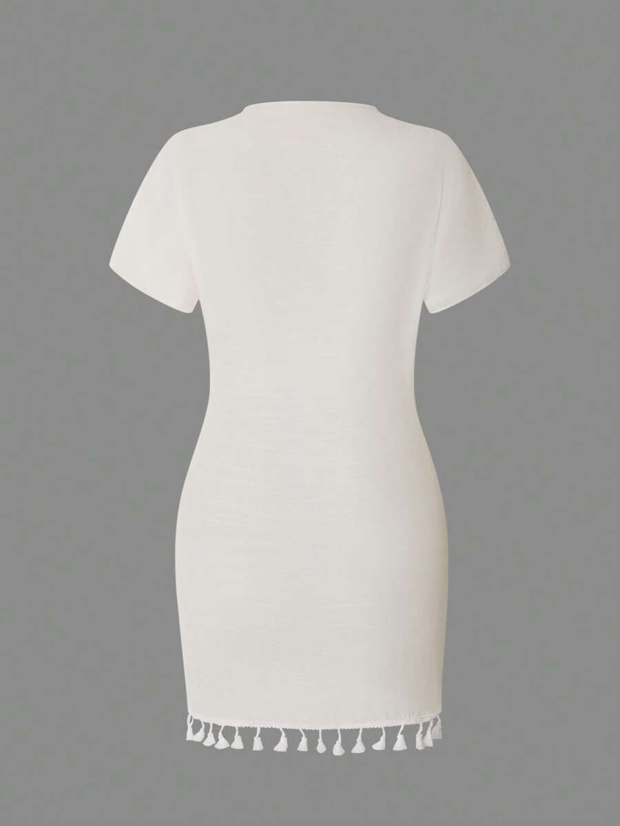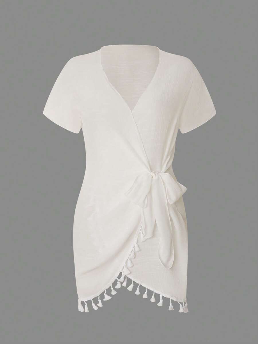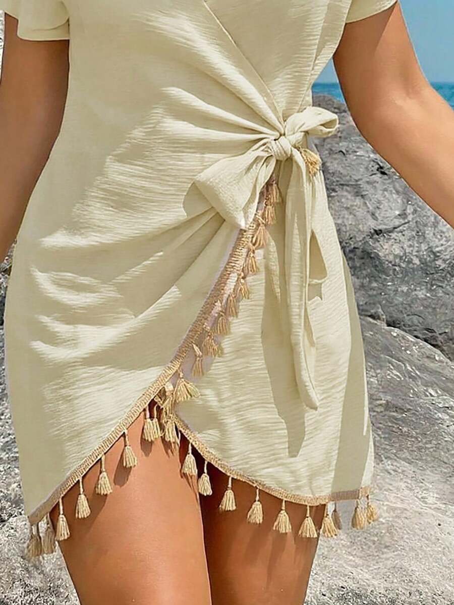 Vestido tipo pareo de verano nuevo con decoracion de flecos y lazada en la cintura para playa, vestido corto casual de gasa de manga corta para vacaciones de mujer