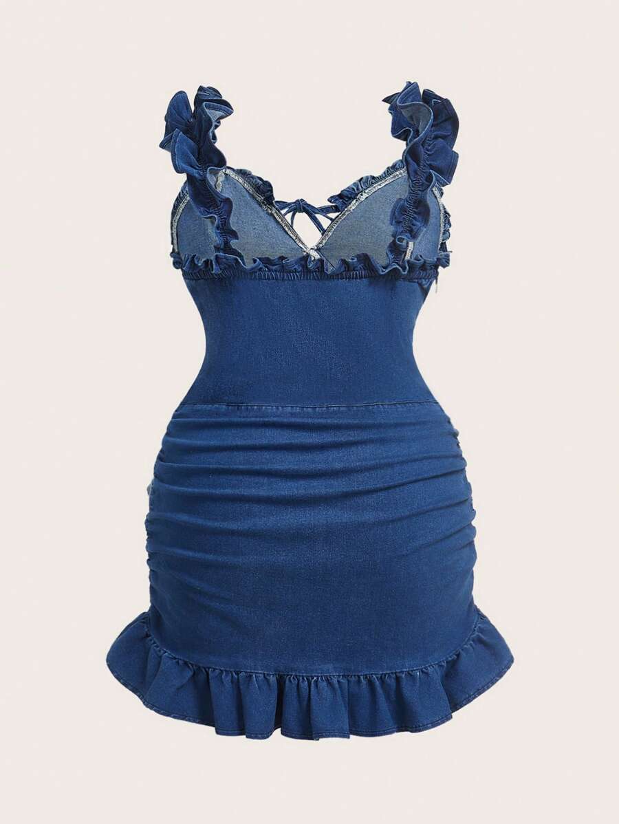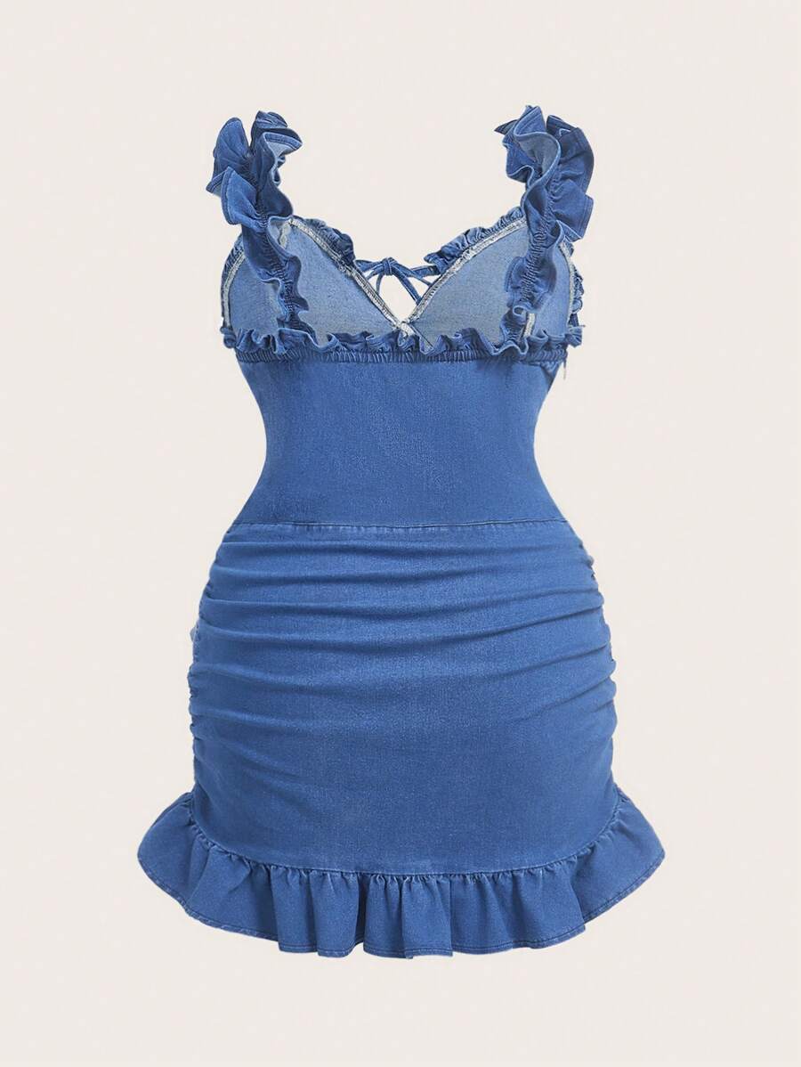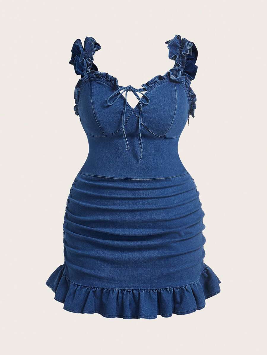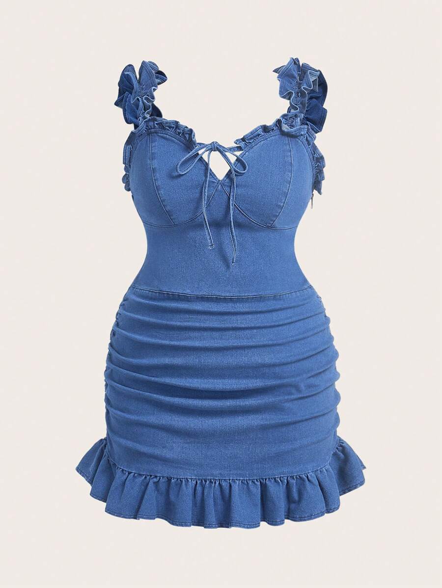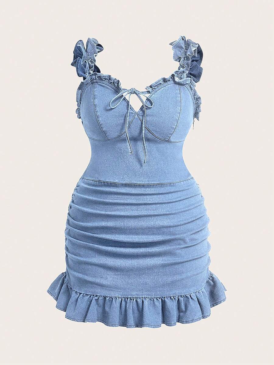 Vestido de mezclilla de talla grande de verano con dobladillo con volantes, corte ajustado, lazo elastico, y diseno romantico y a la moda