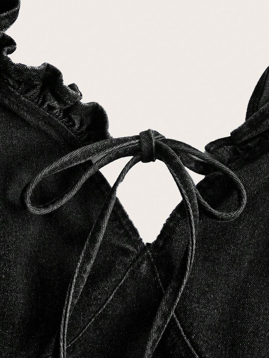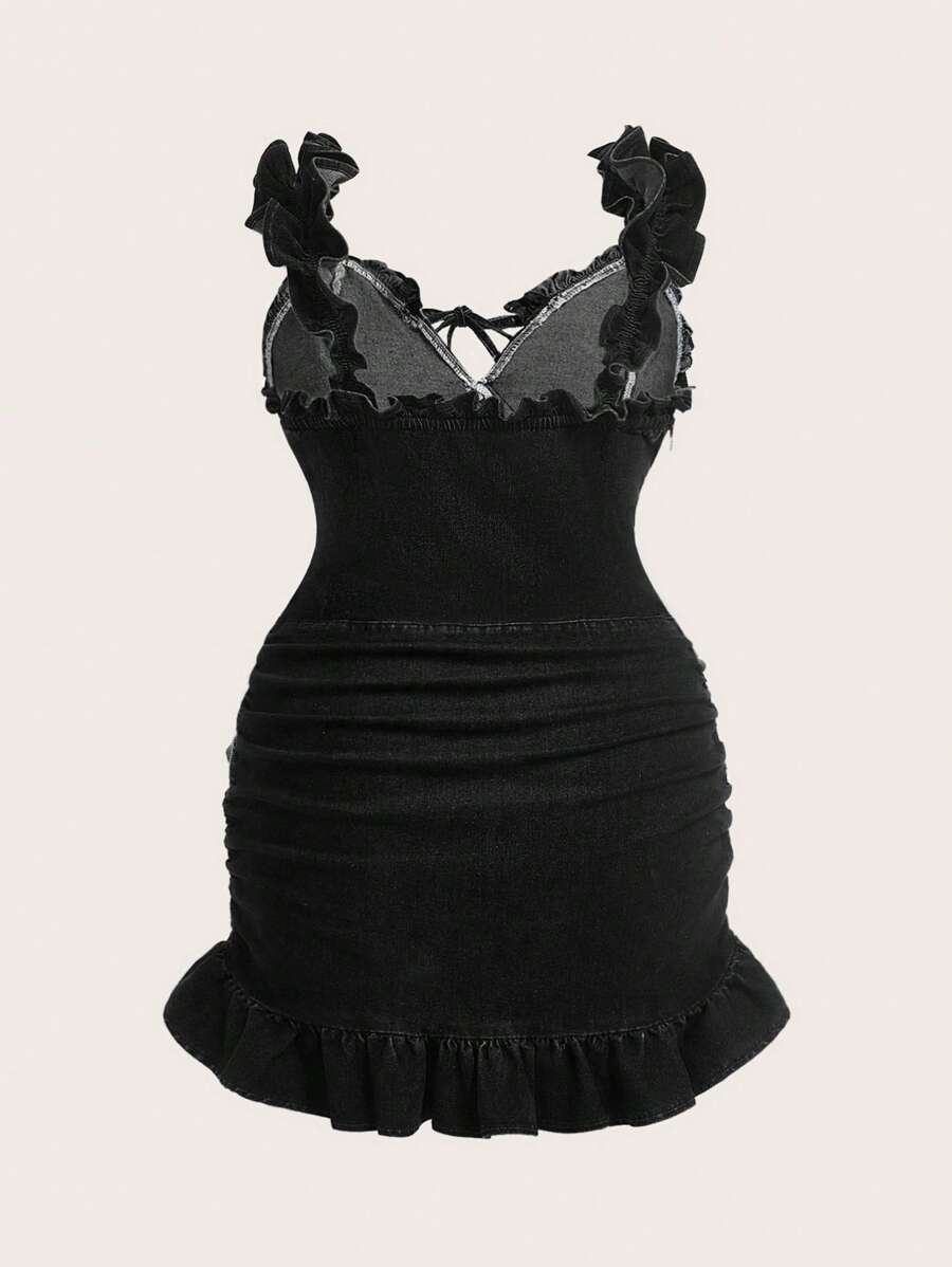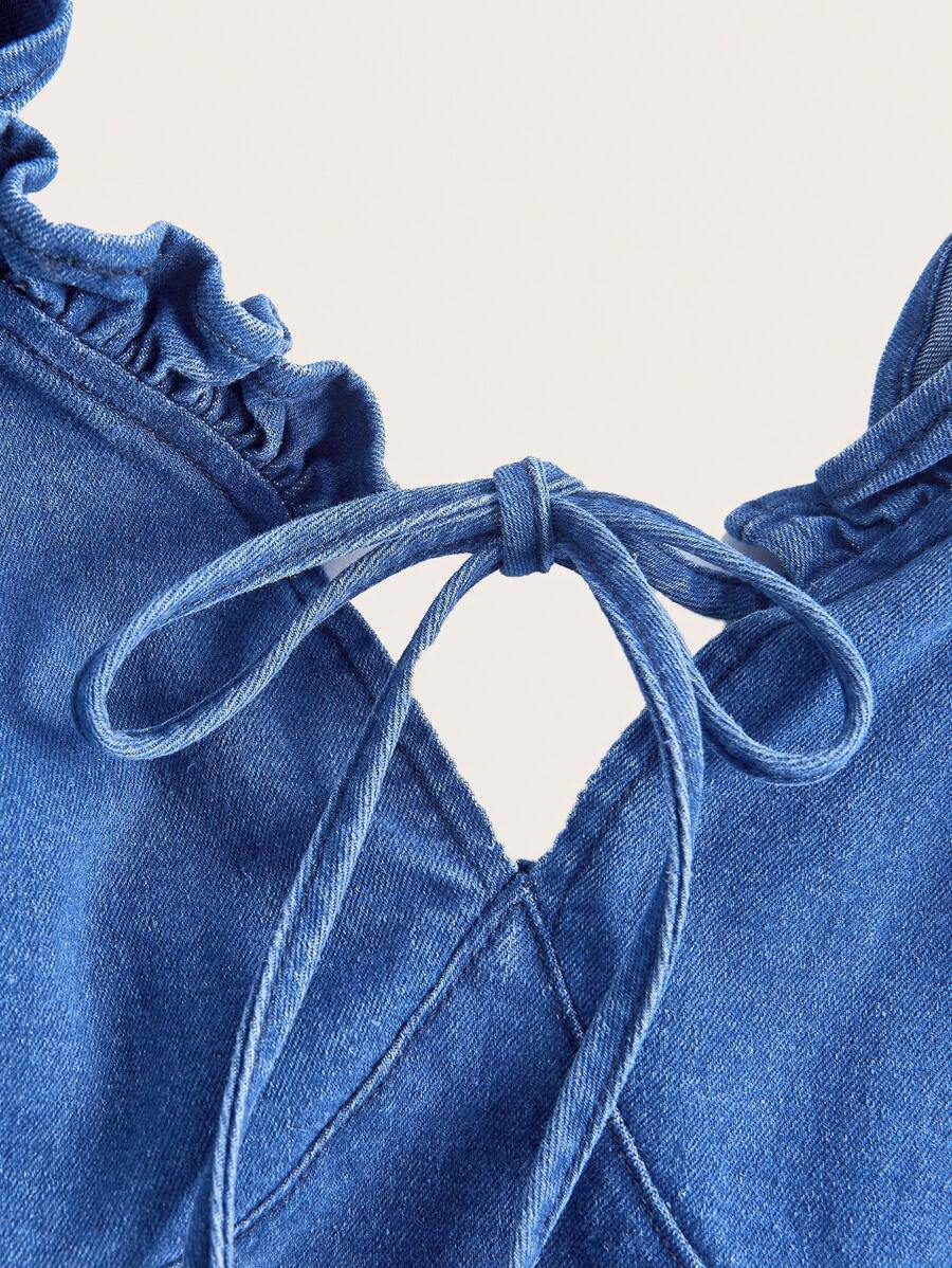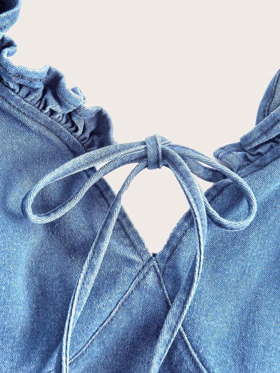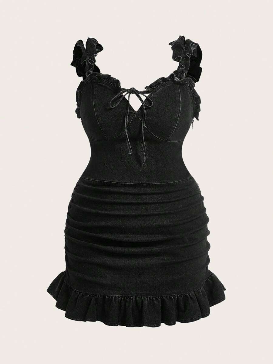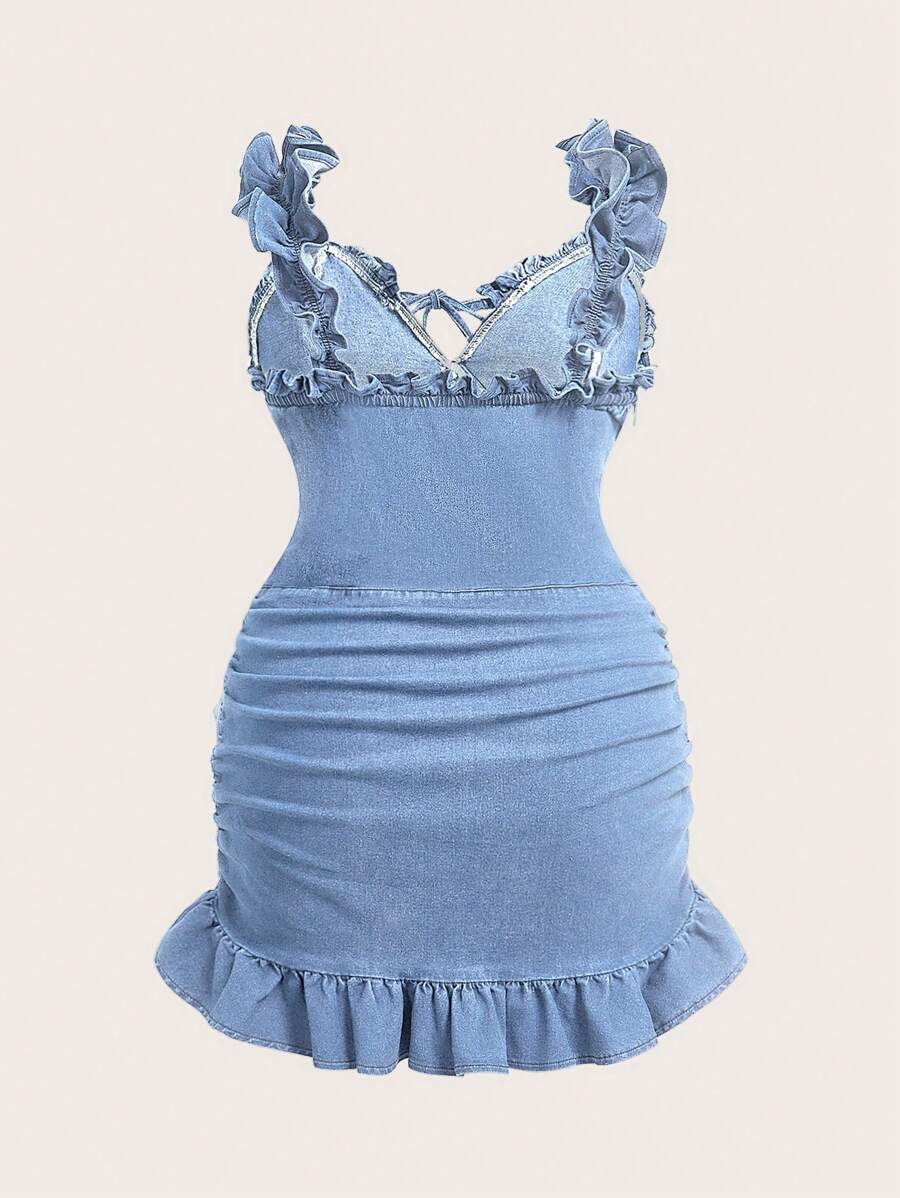 Vestido de mezclilla de talla grande de verano con dobladillo con volantes, corte ajustado, lazo elastico, y diseno romantico y a la moda