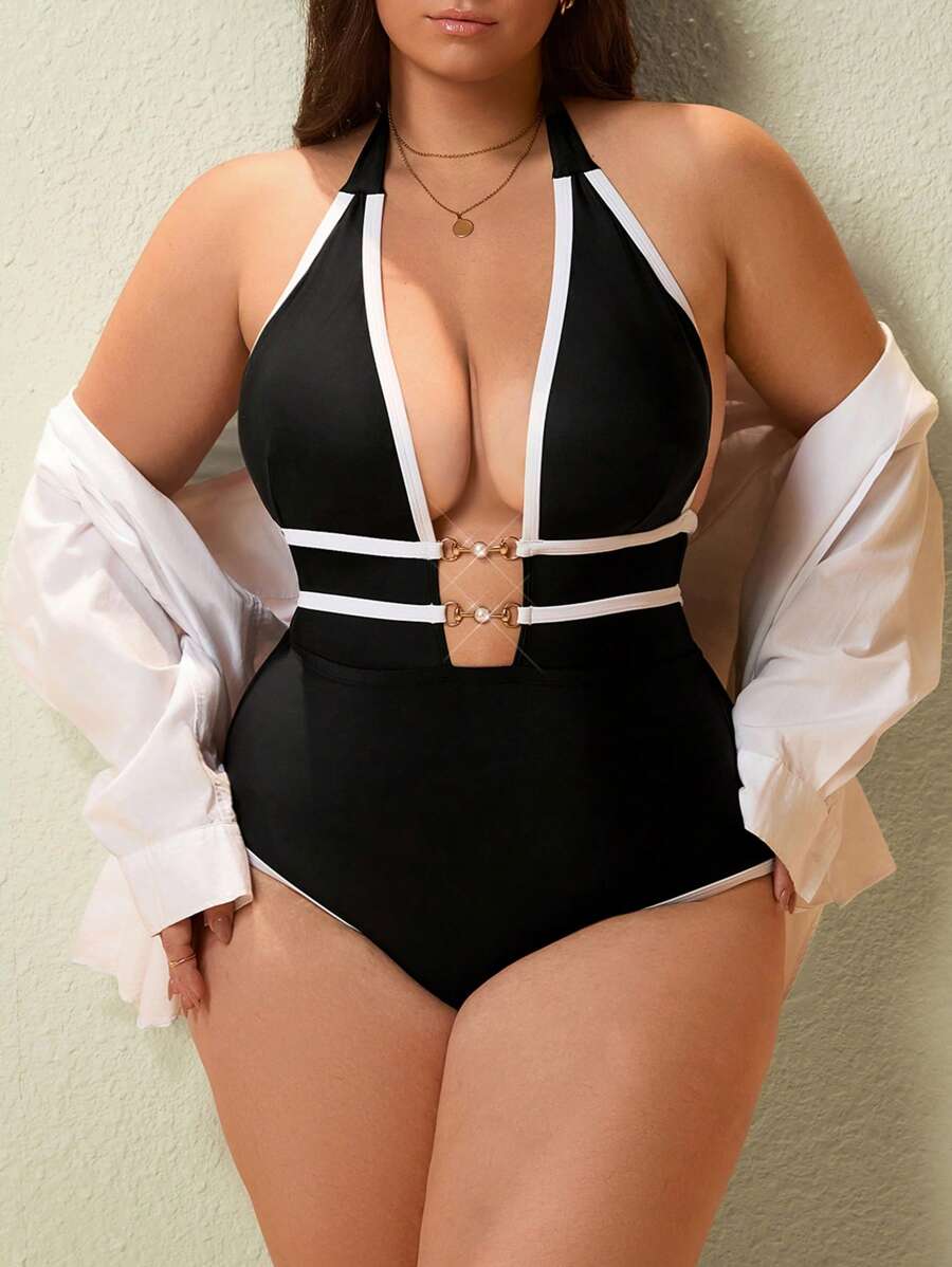 1 pieza traje de bano informal con cuello en v y contraste de color para mujer talla grande