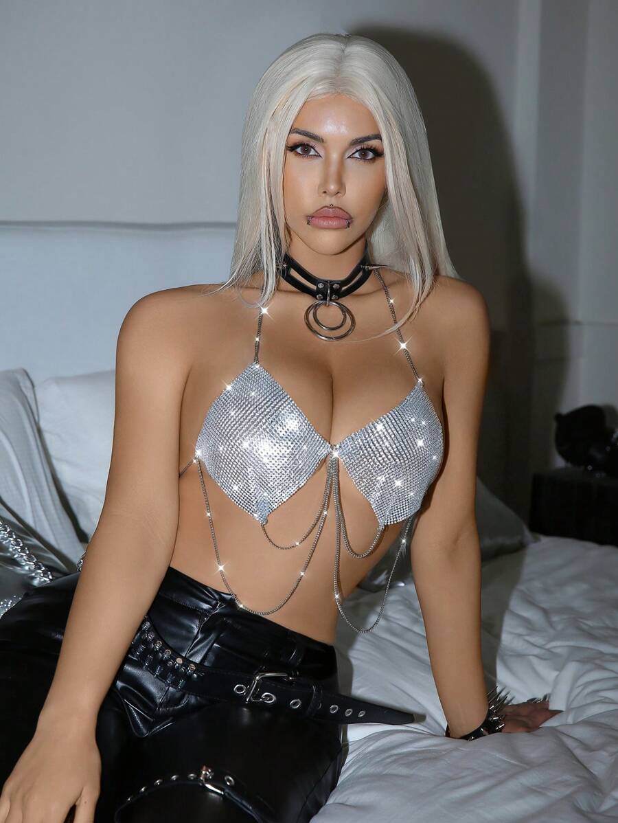 Altcore top corto con escote posterior y adorno de cadena metalica para mujer, para festival de musica