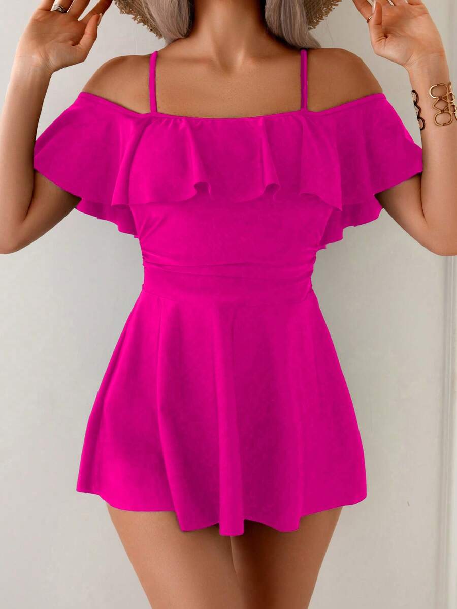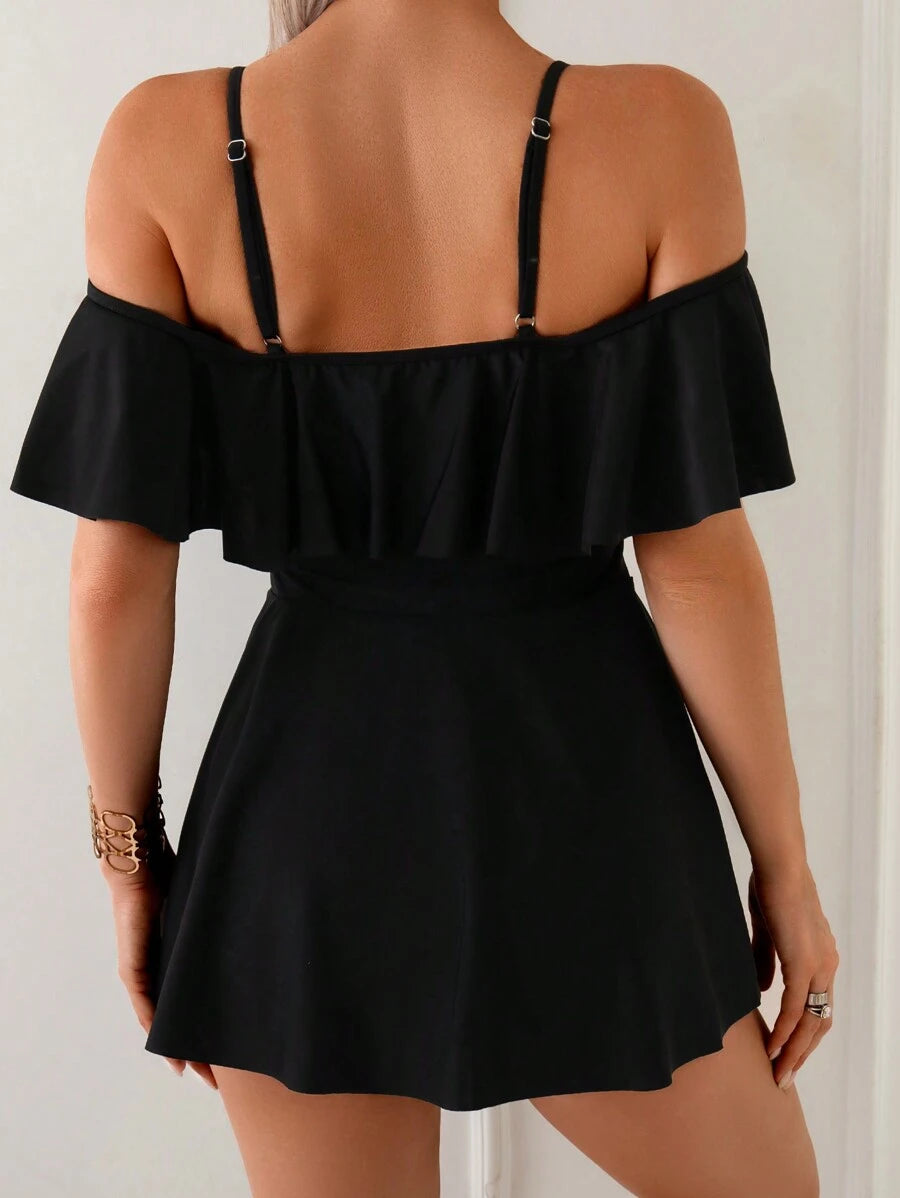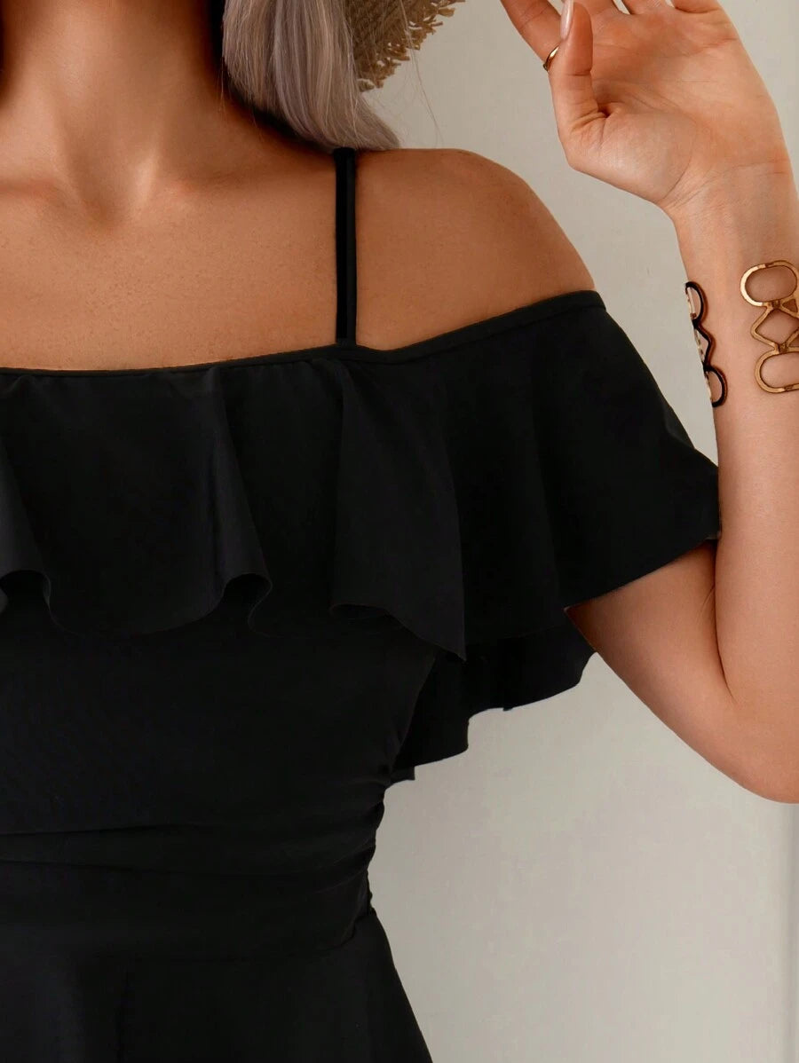 Vestido negro elegante y sexy para la playa con tirantes de espagueti y cuello con volantes, perfecto para vacaciones de verano