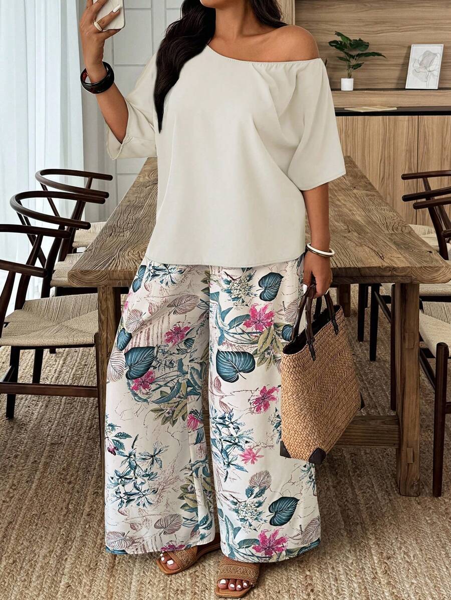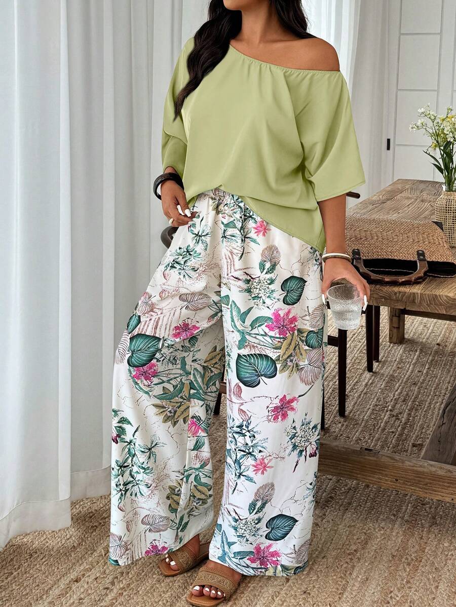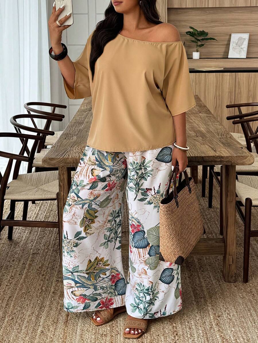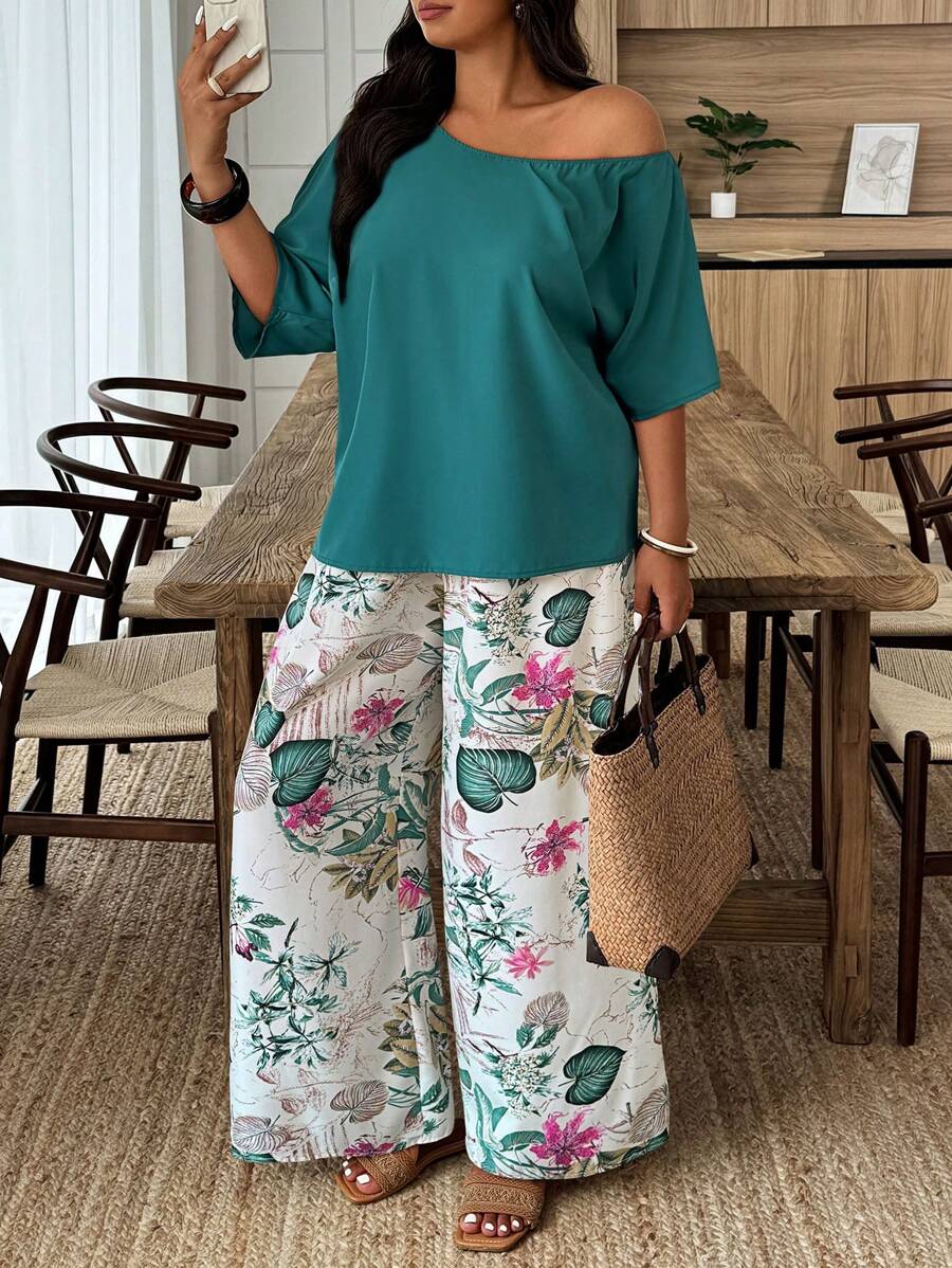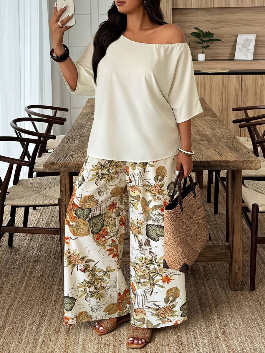Weeklong conjunto informal de 2 piezas con estampado aleatorio, talla grande, para vacaciones