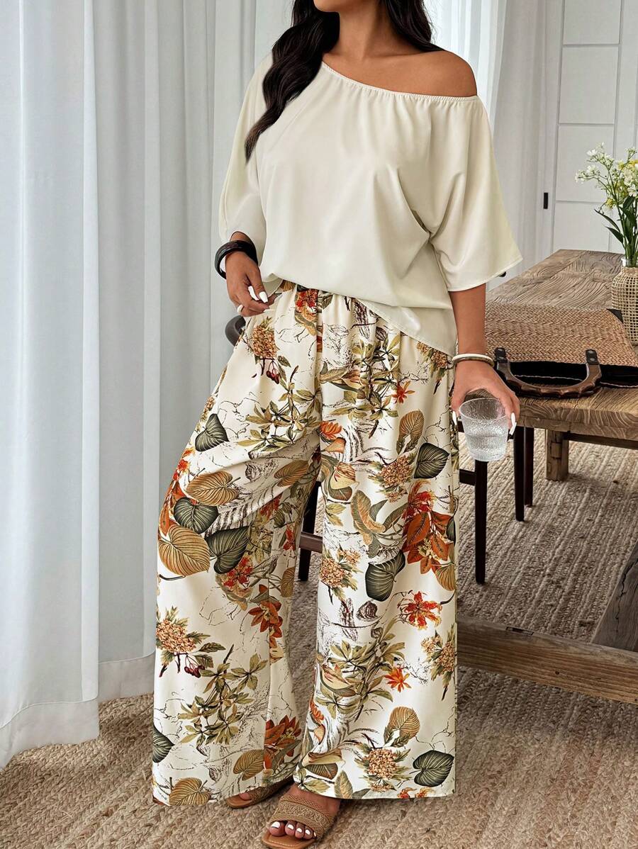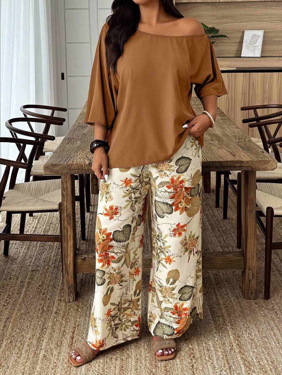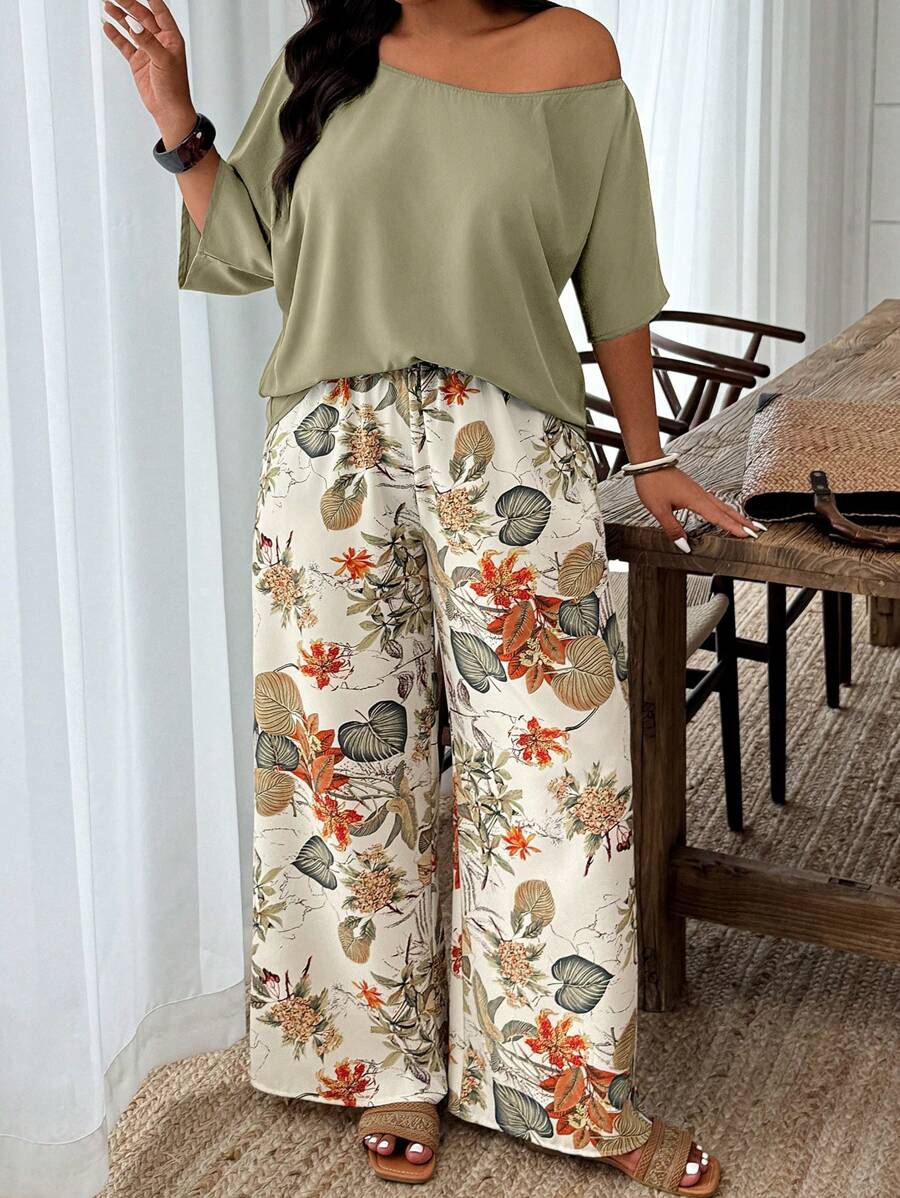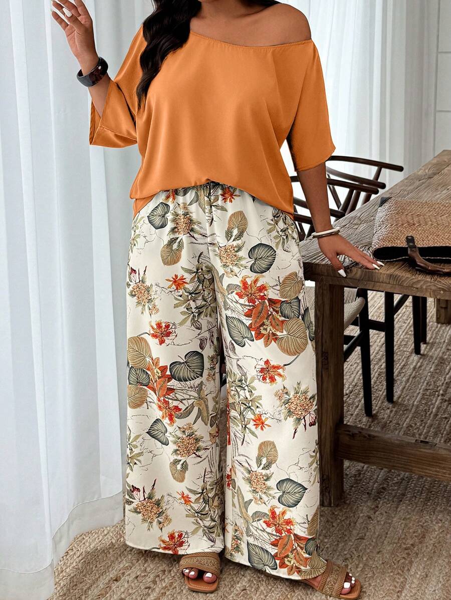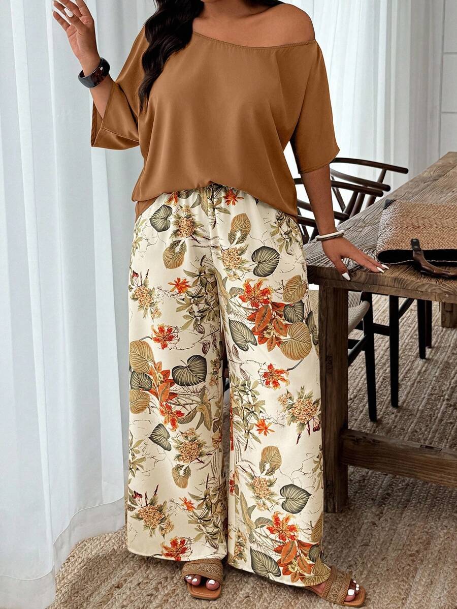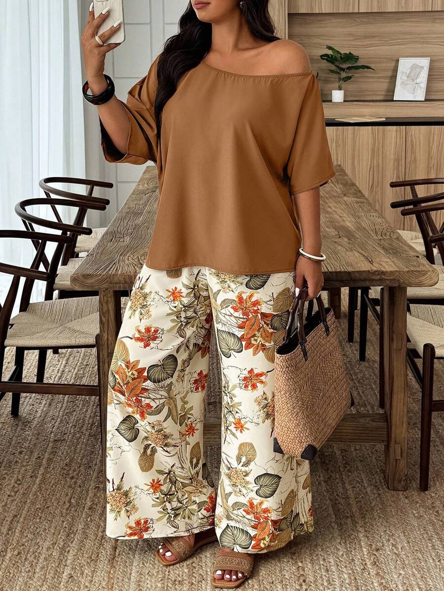 Weeklong conjunto informal de 2 piezas con estampado aleatorio, talla grande, para vacaciones