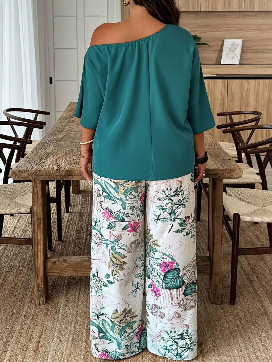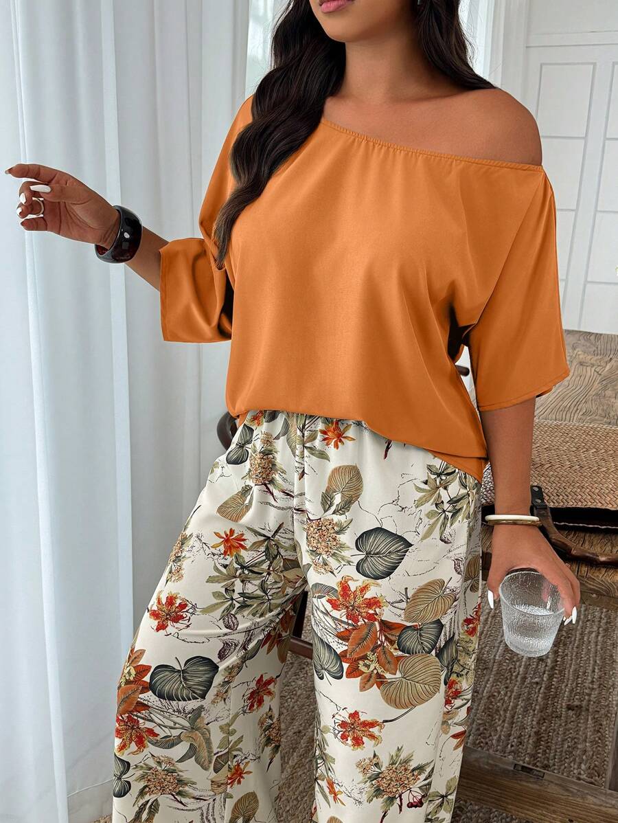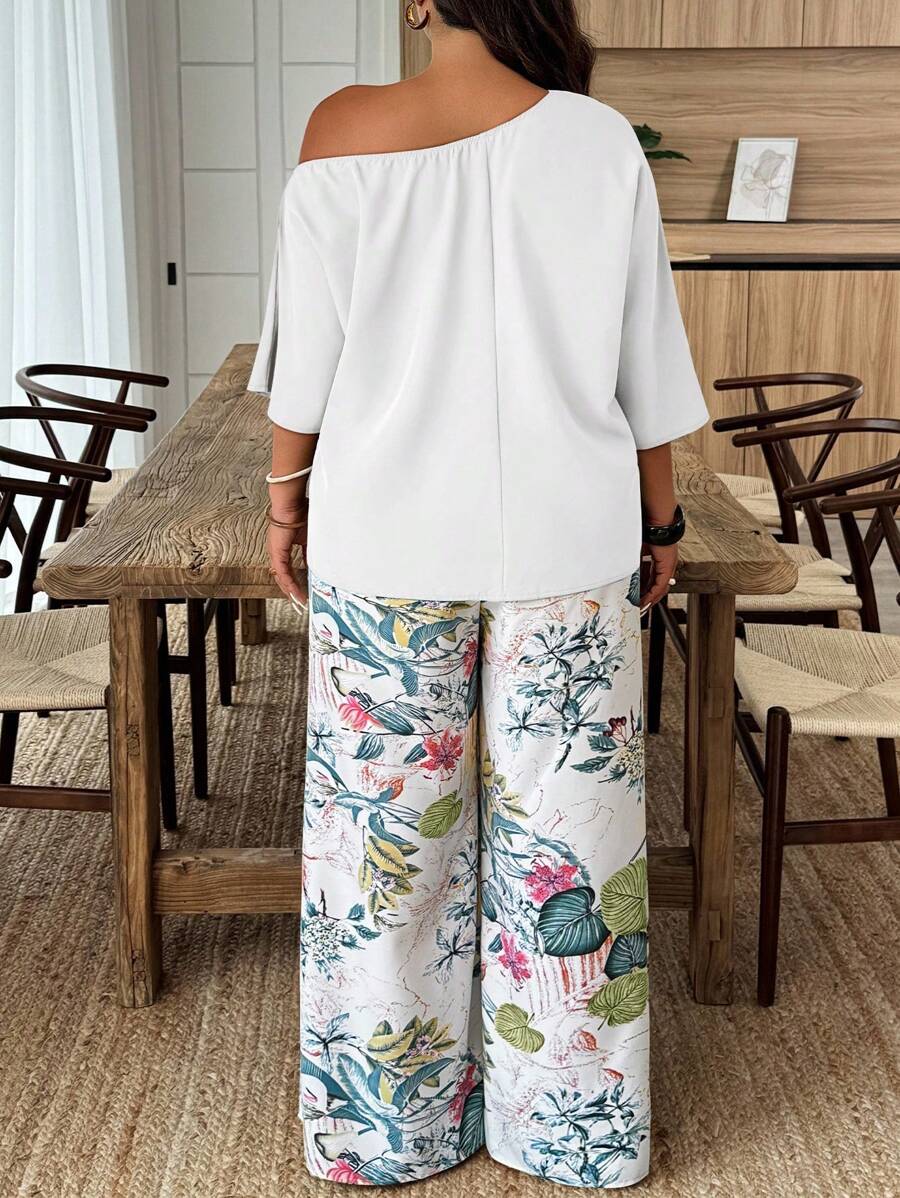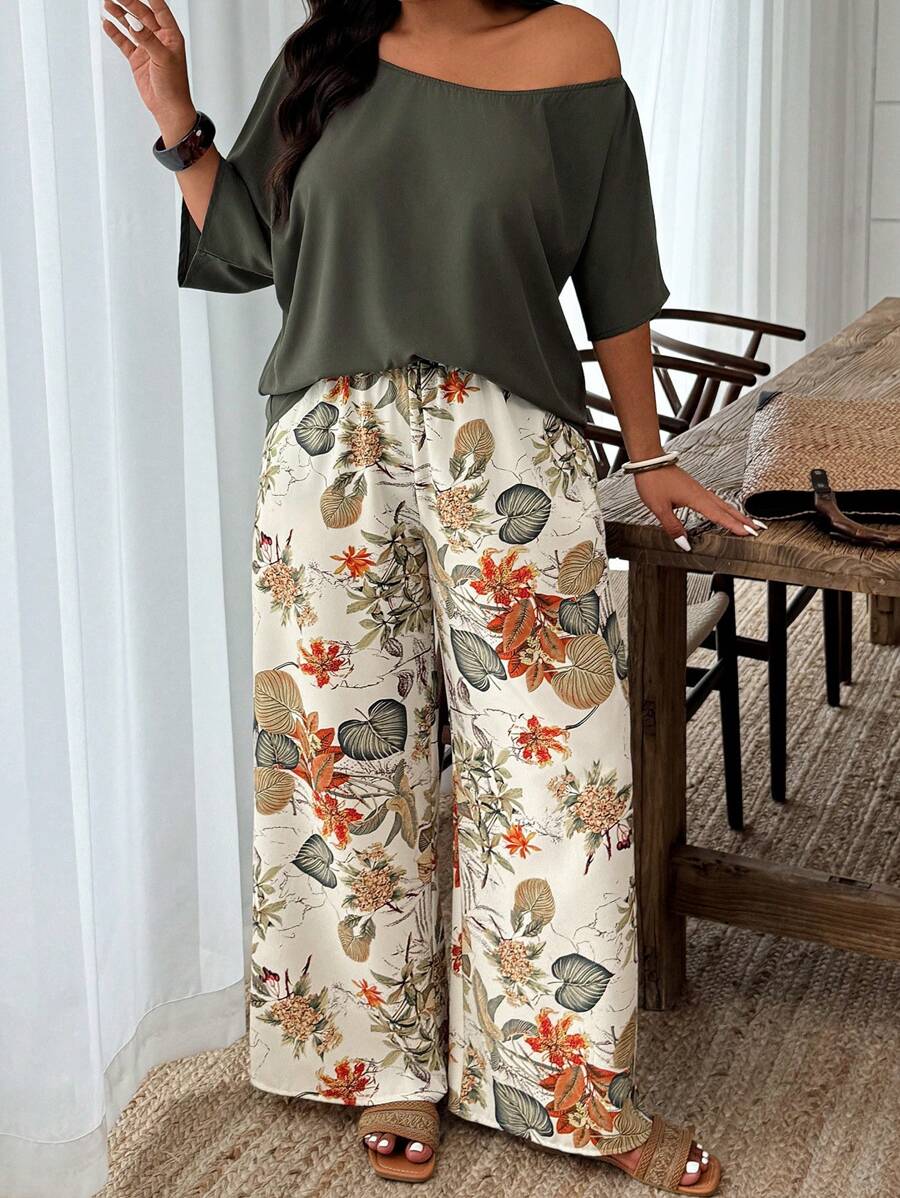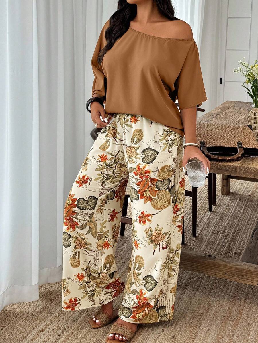 Weeklong conjunto informal de 2 piezas con estampado aleatorio, talla grande, para vacaciones