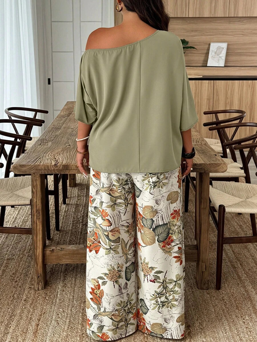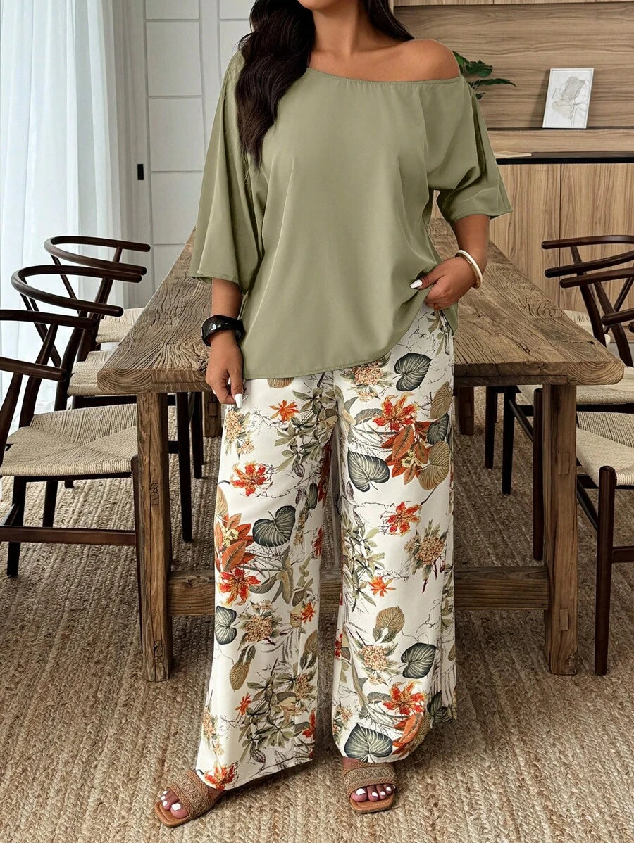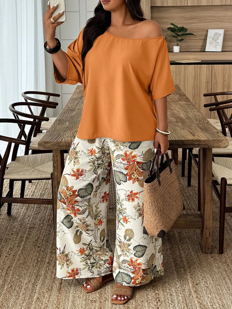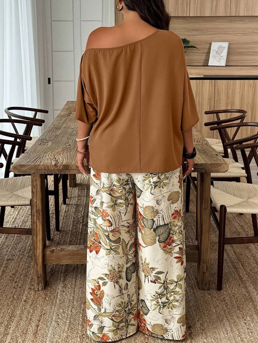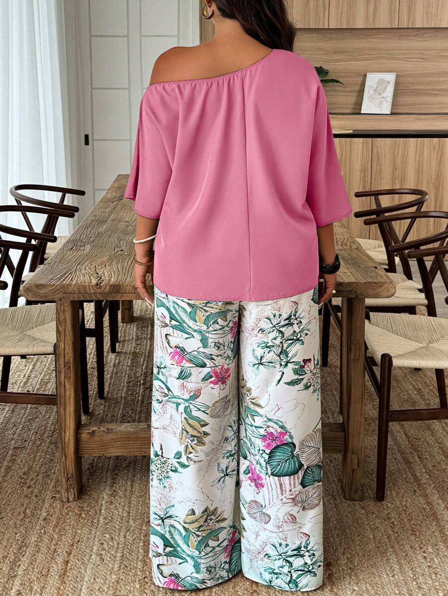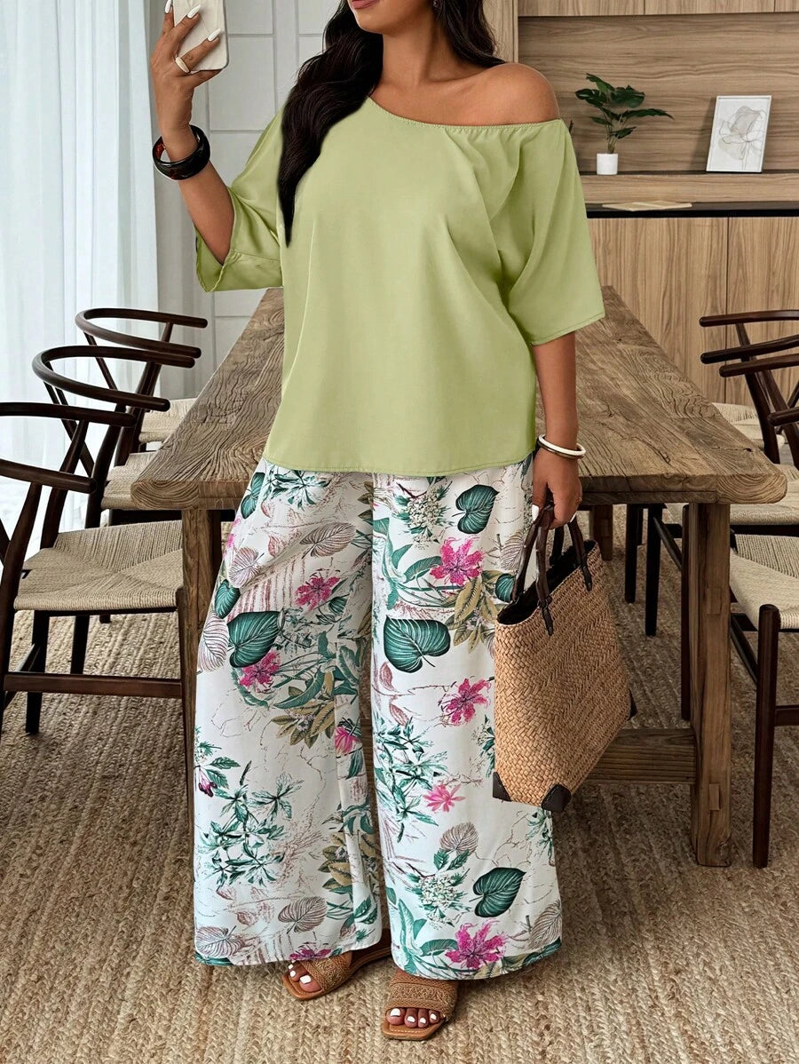 Weeklong conjunto informal de 2 piezas con estampado aleatorio, talla grande, para vacaciones