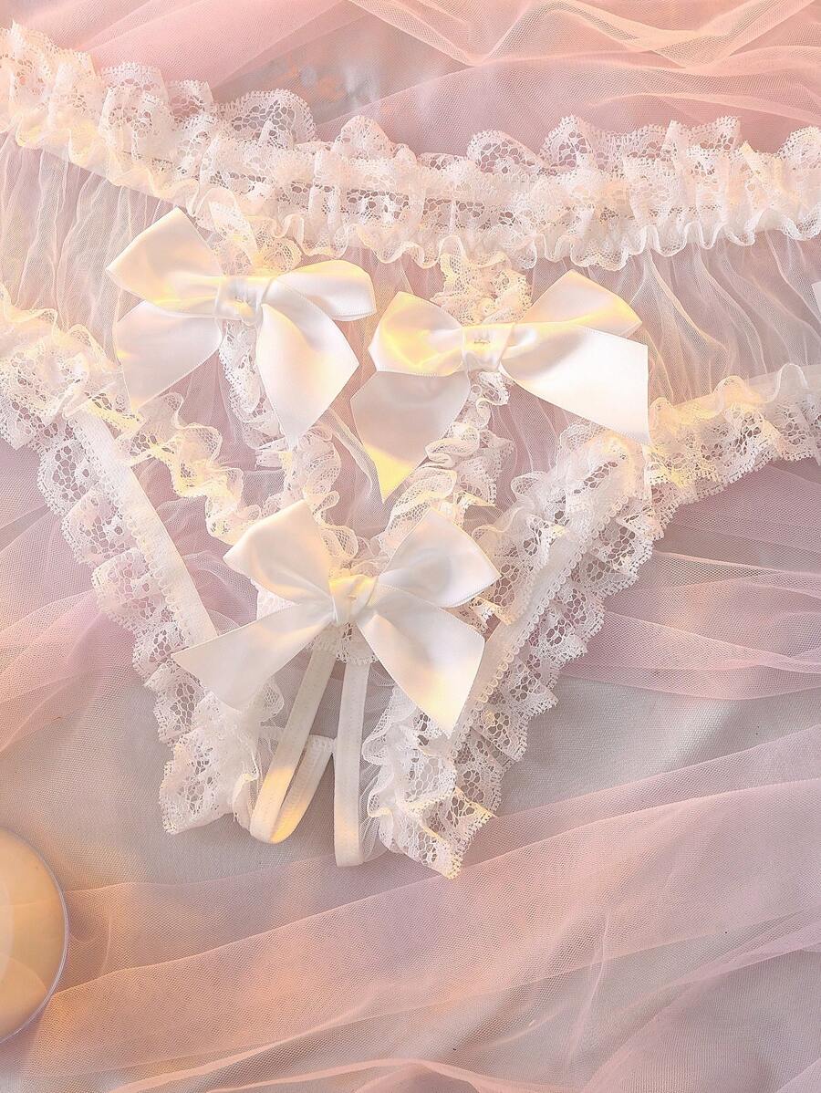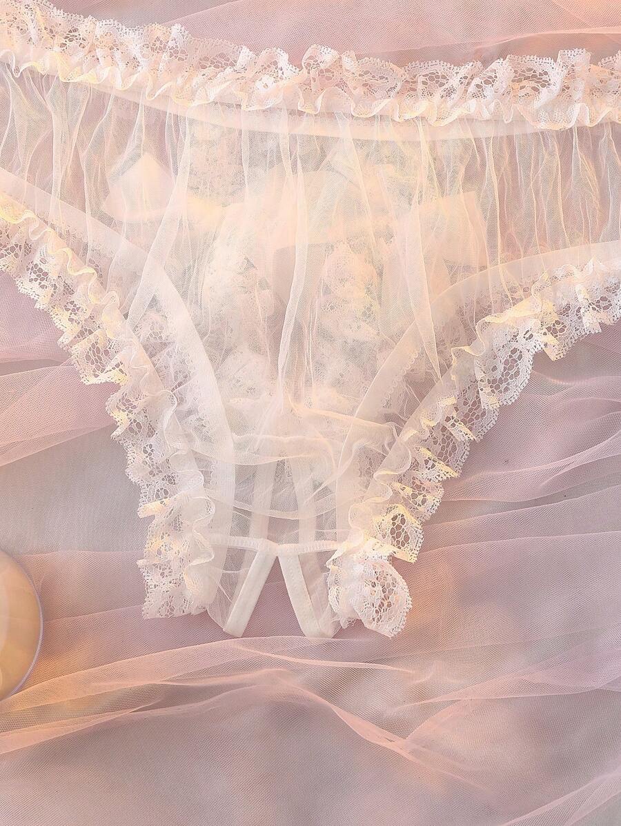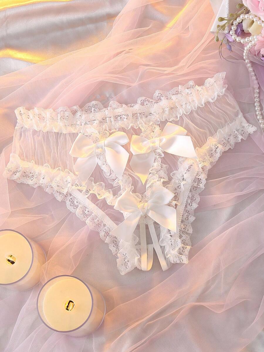 Pantalones cortos con volantes de encaje floral transparente y lazo