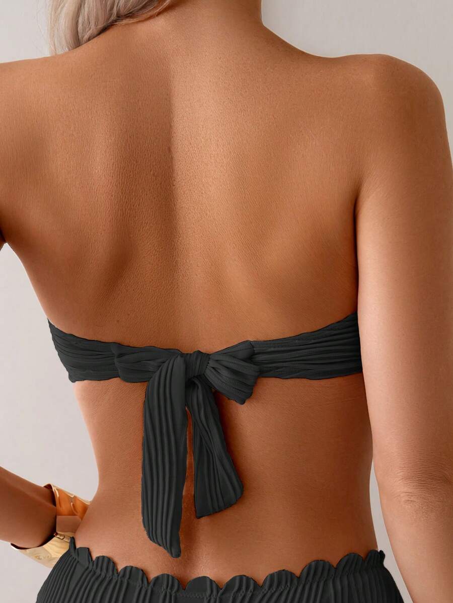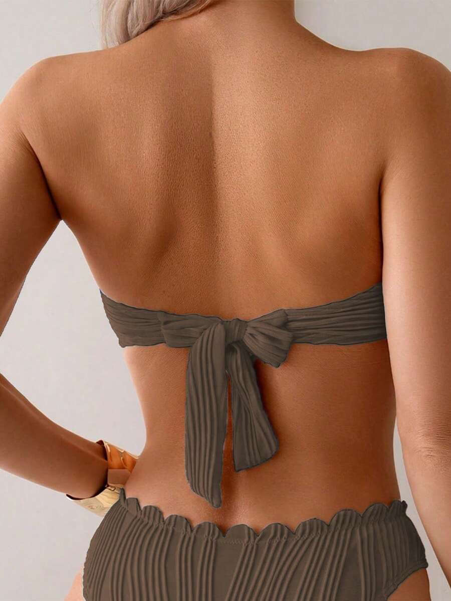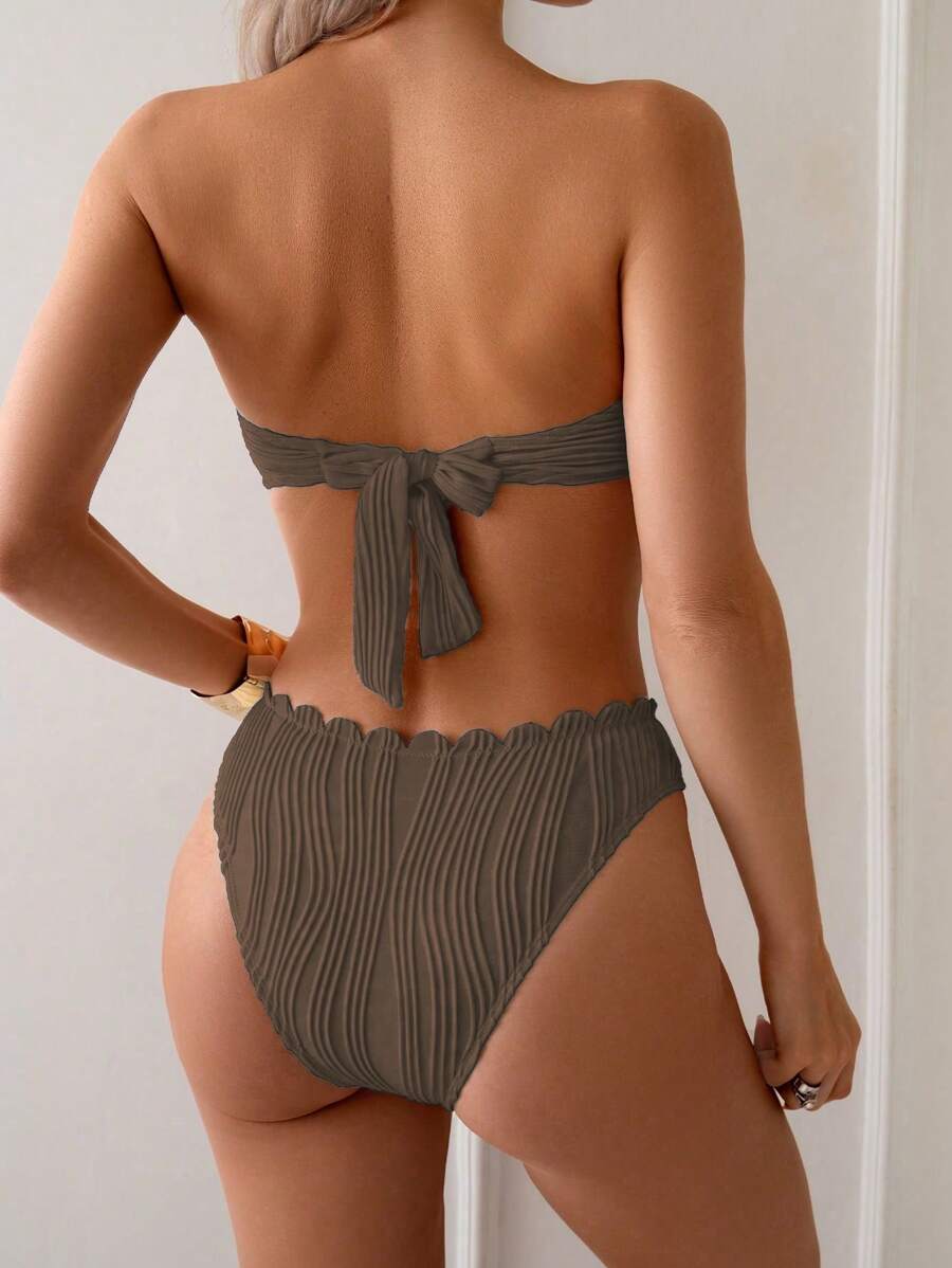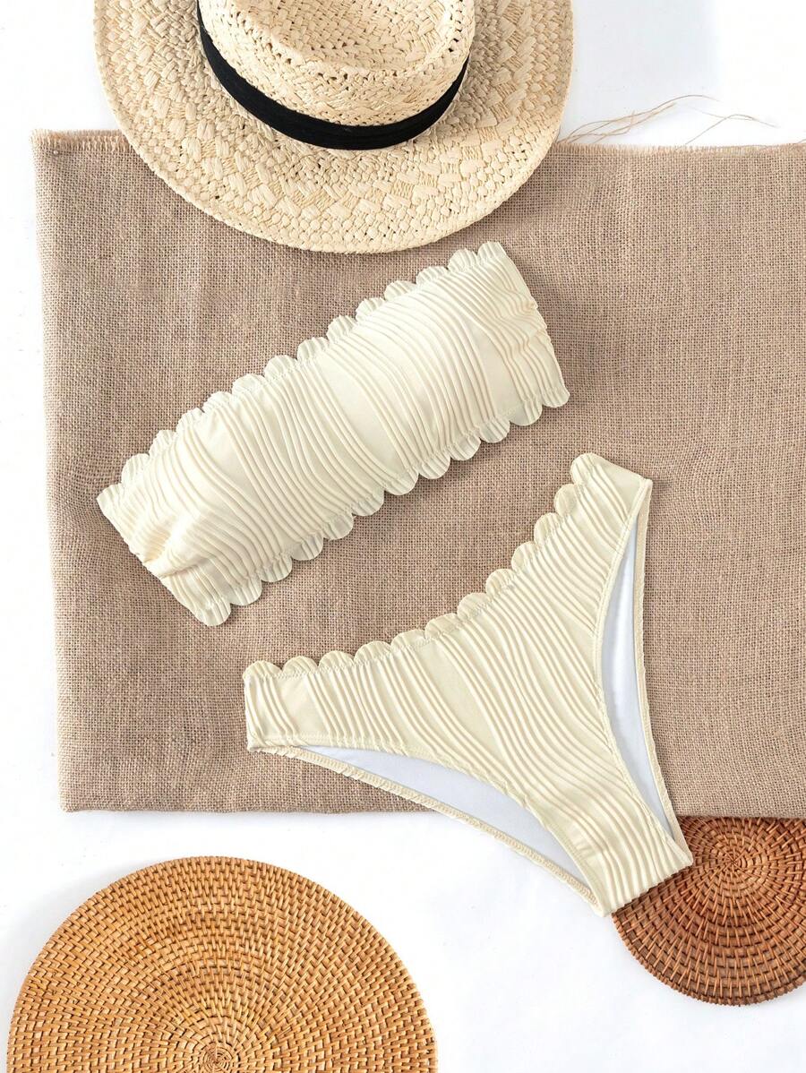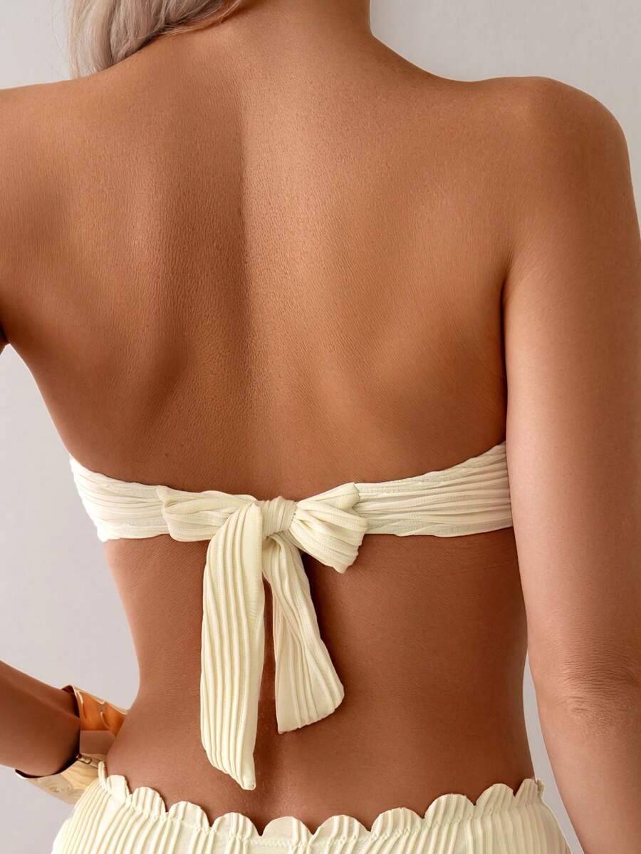2 piezas conjunto de bikini de unicolor estilo primavera, traje de bano sin espalda con adorno de concha marina para mujer