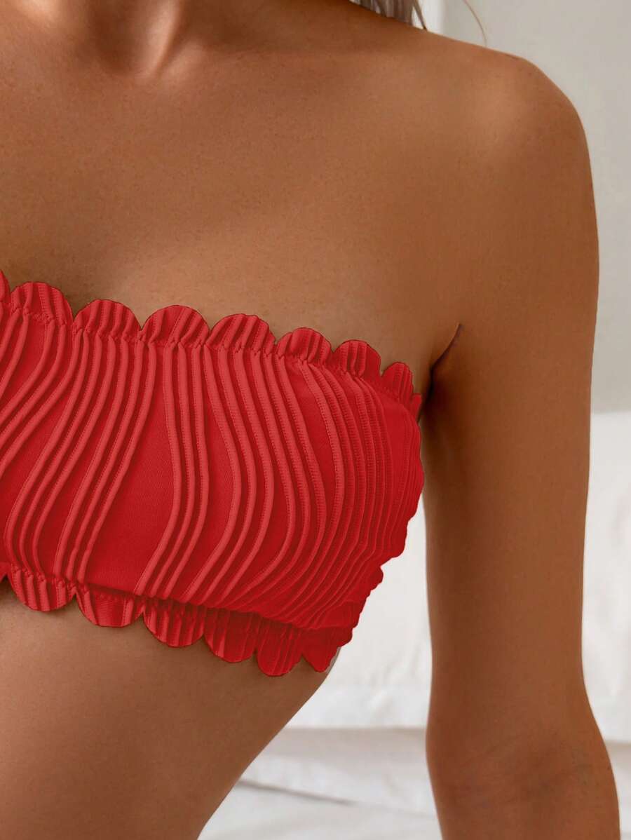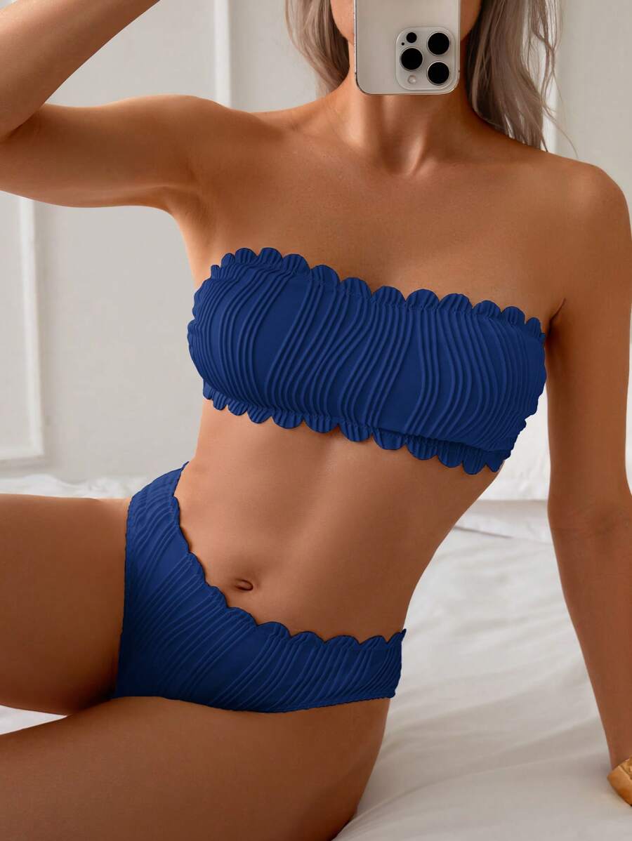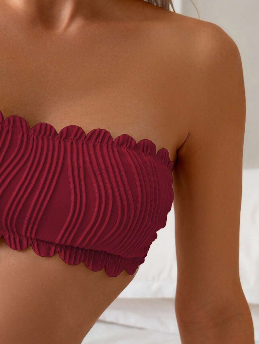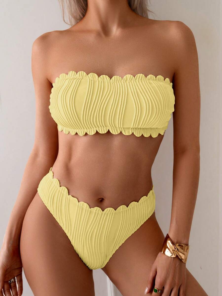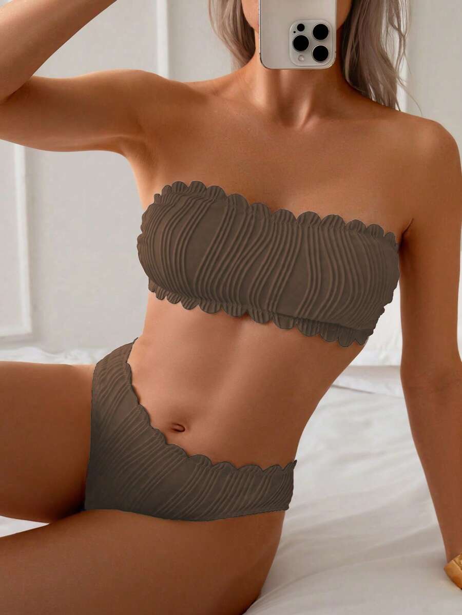 2 piezas conjunto de bikini de unicolor estilo primavera, traje de bano sin espalda con adorno de concha marina para mujer
