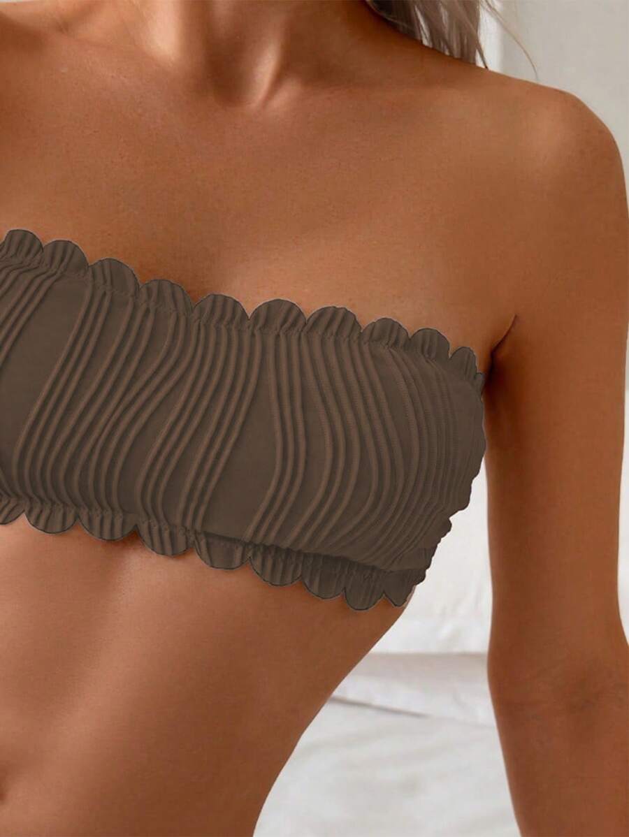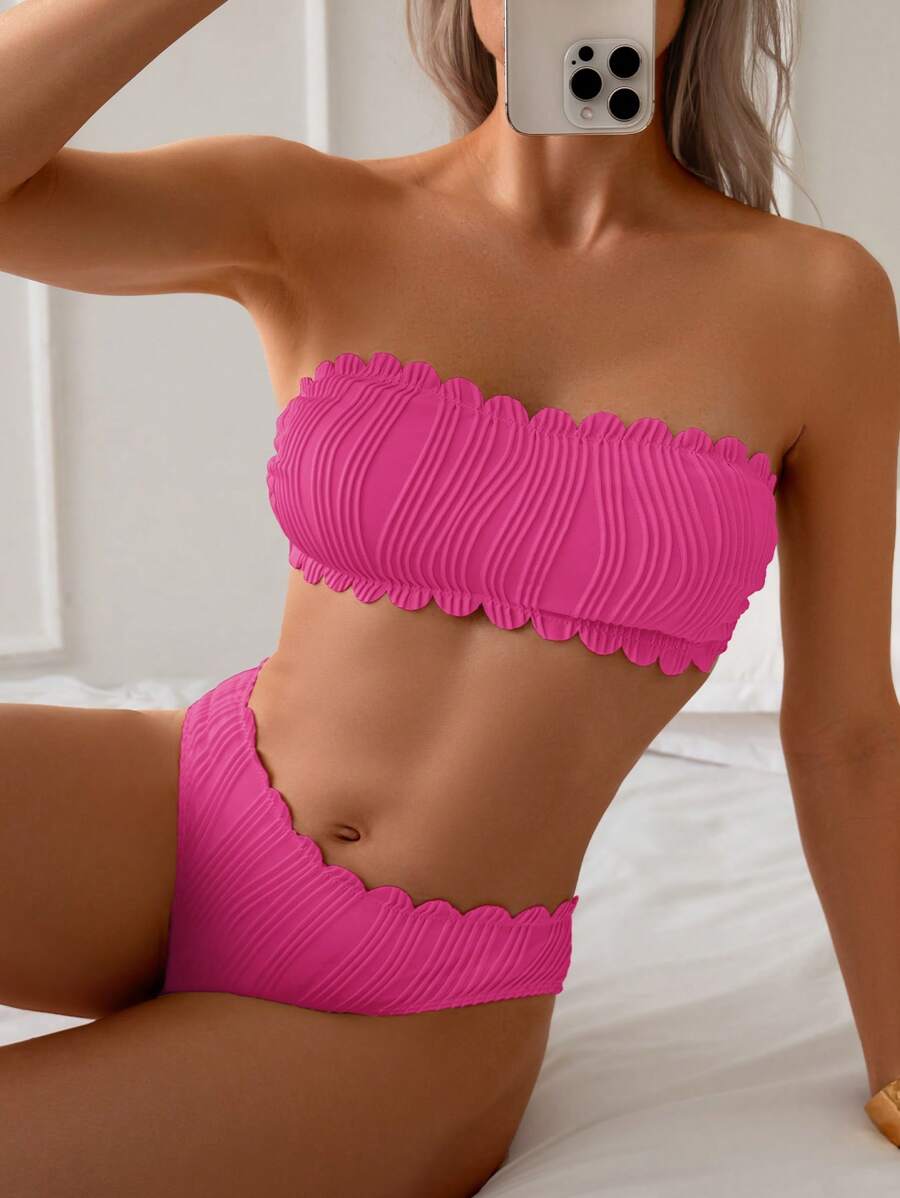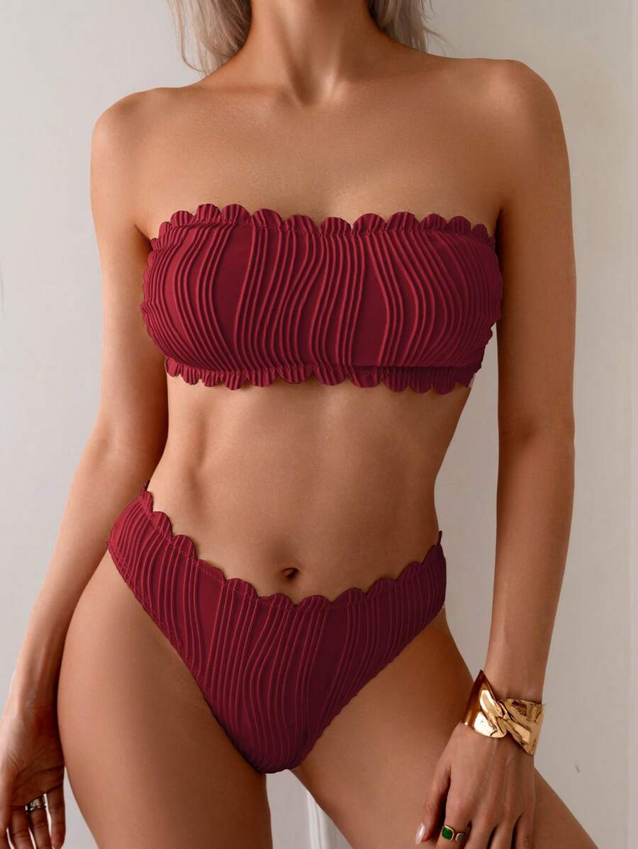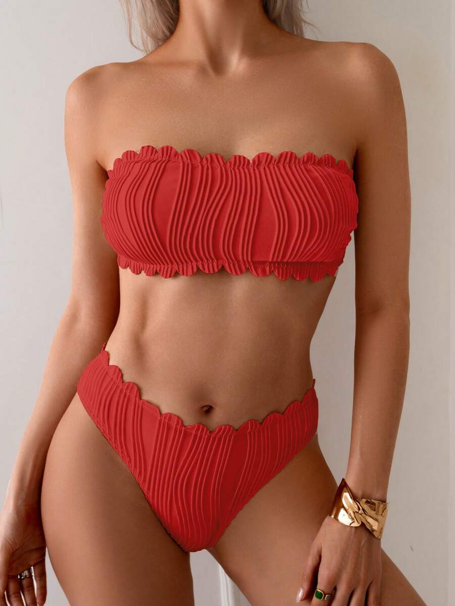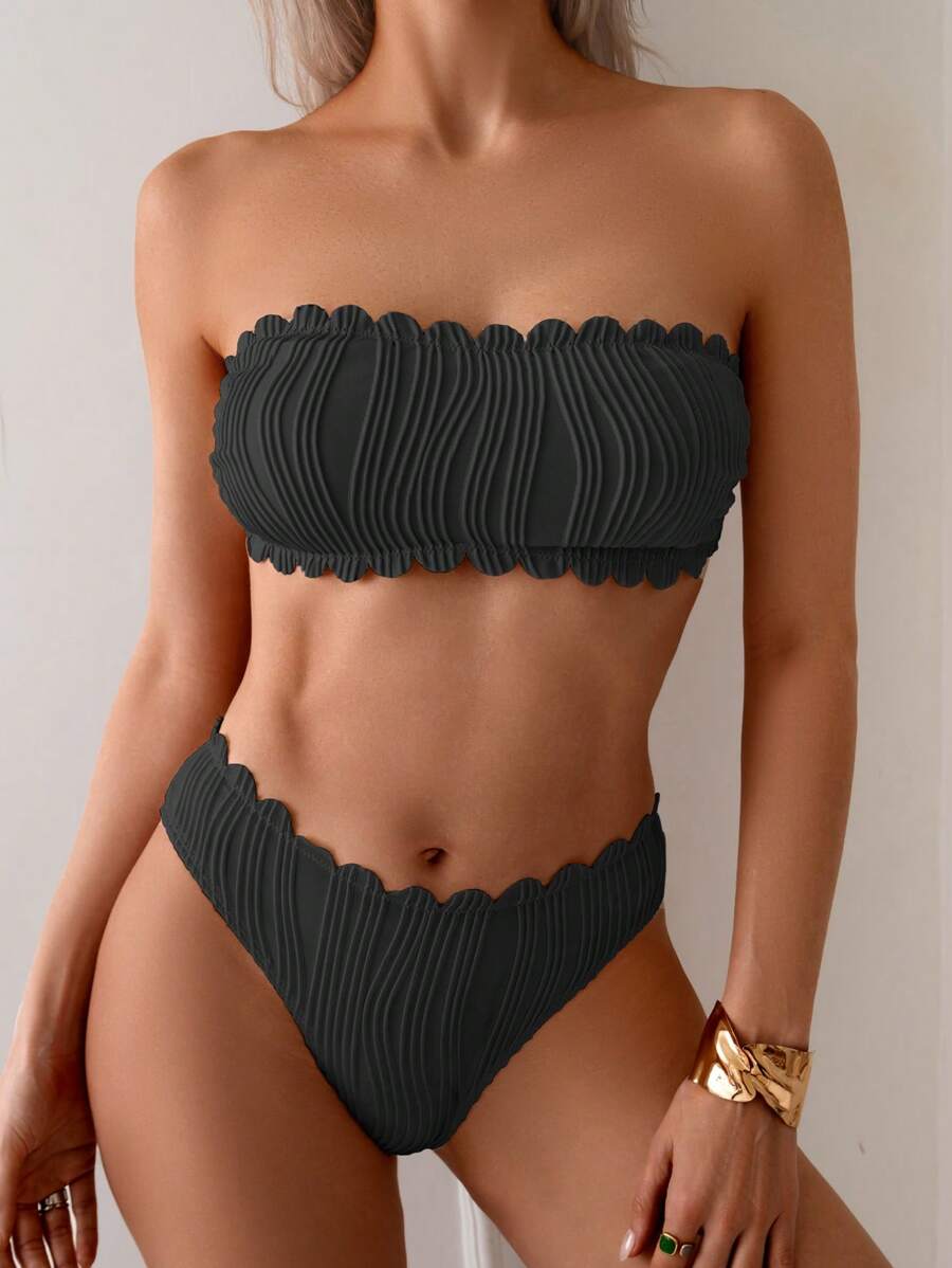 2 piezas conjunto de bikini de unicolor estilo primavera, traje de bano sin espalda con adorno de concha marina para mujer