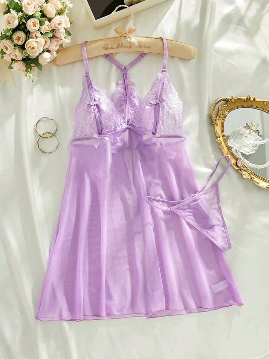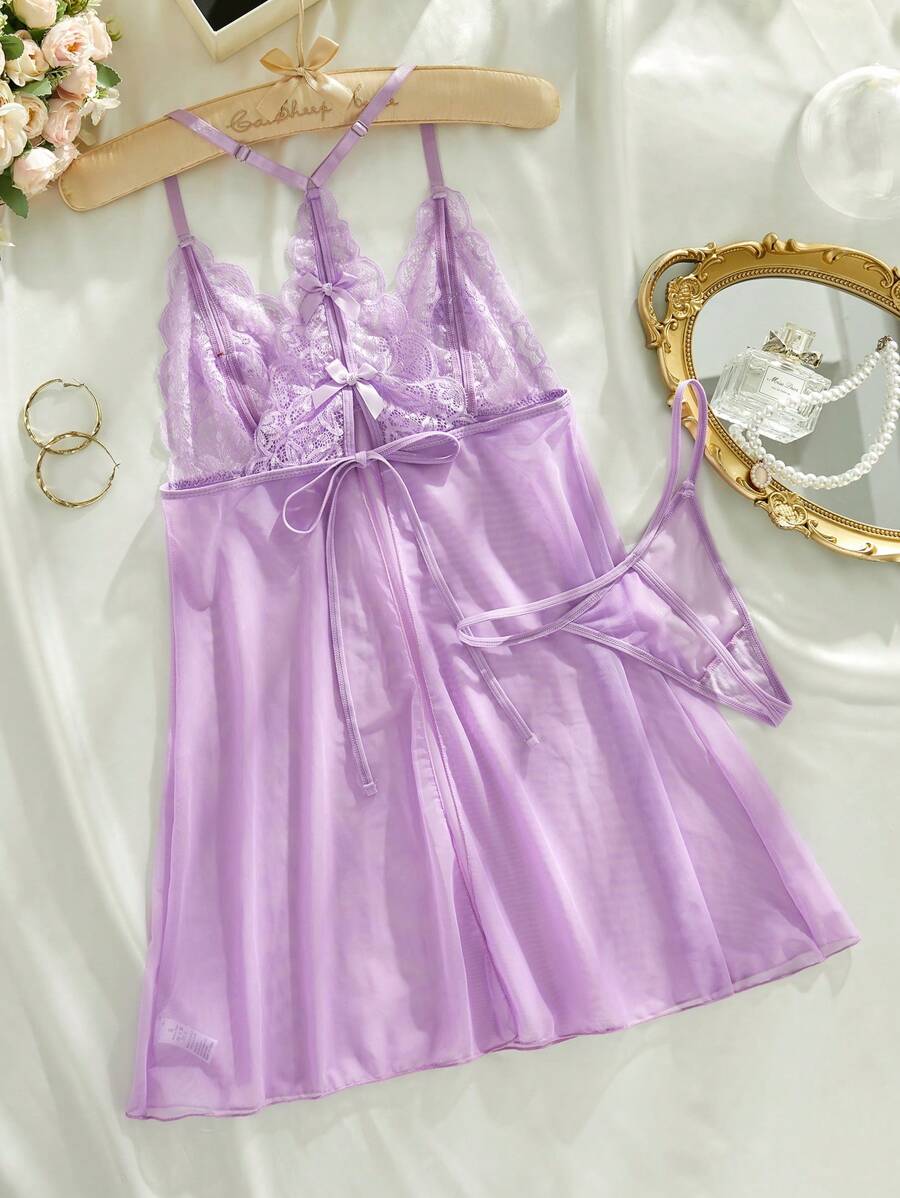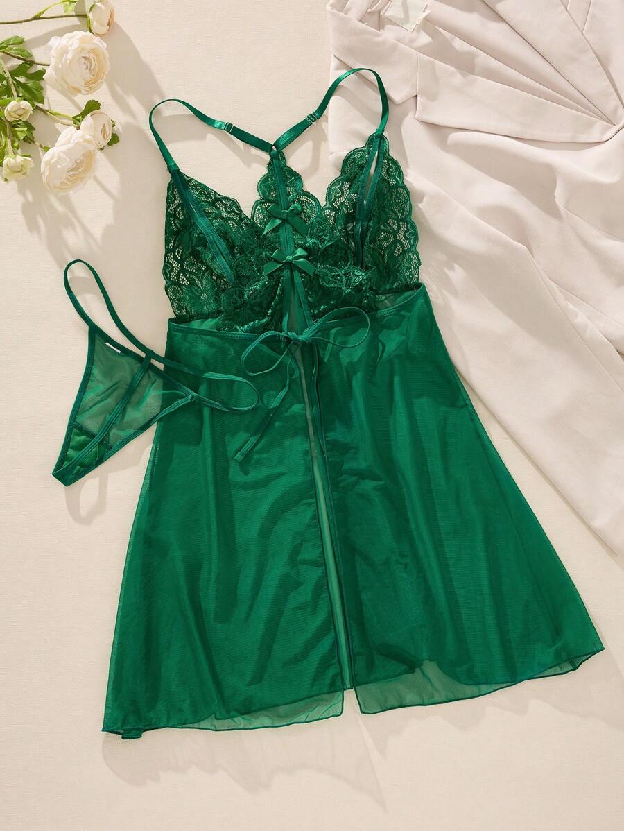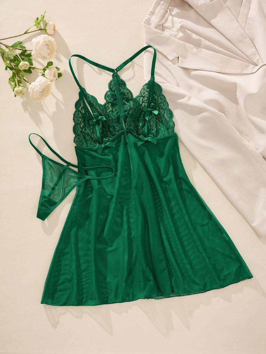 2 piezas camison de mujer con encaje sexy y parches, escote en la espalda, lazo