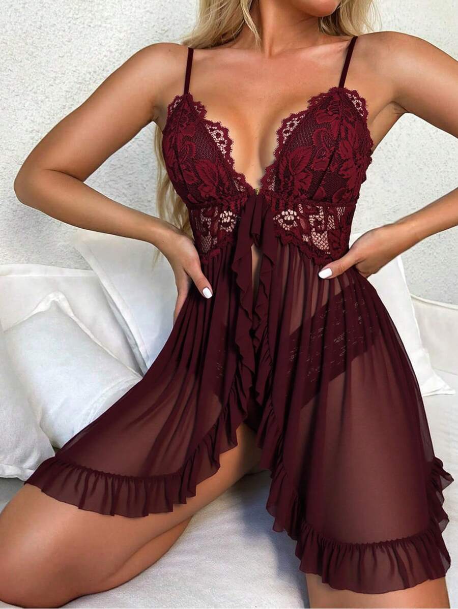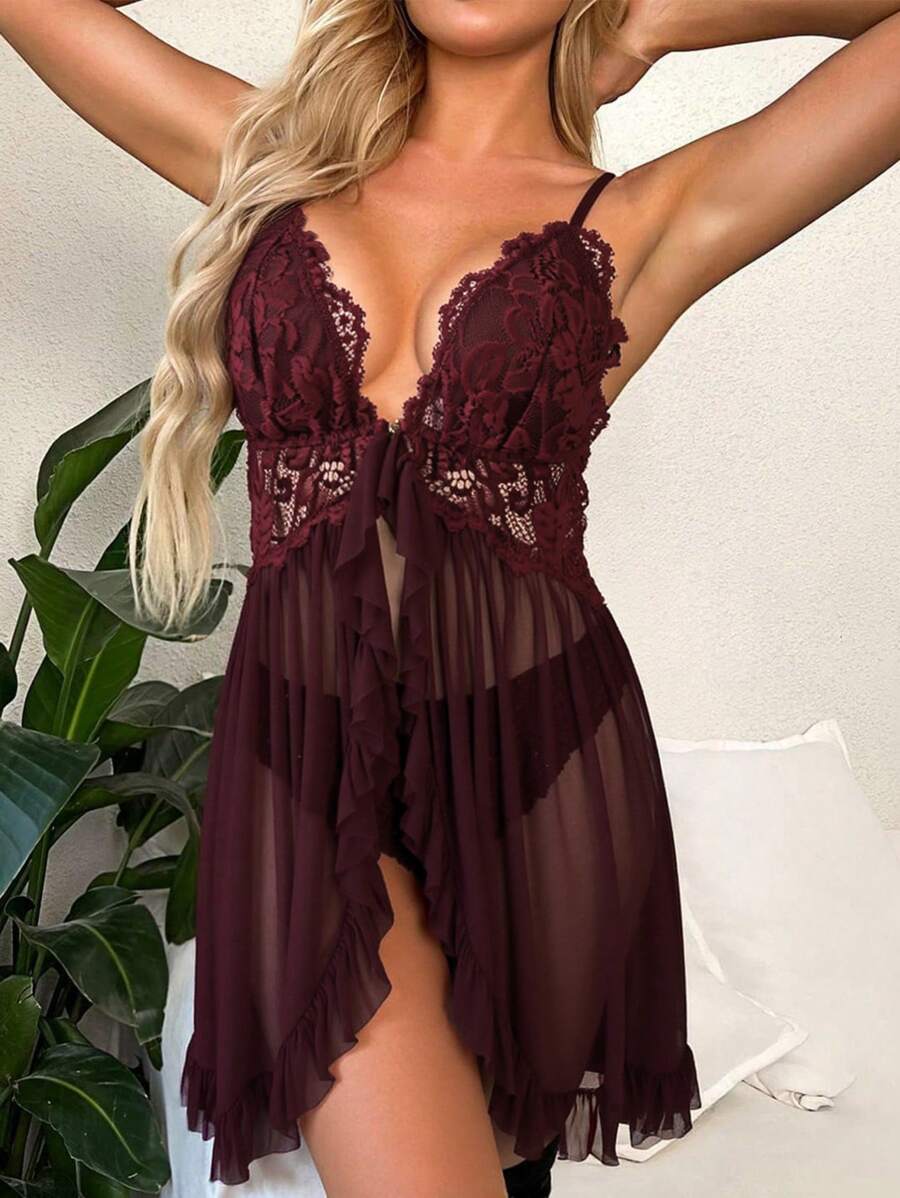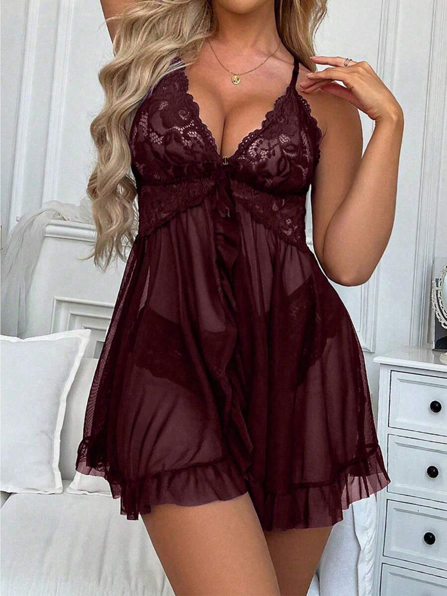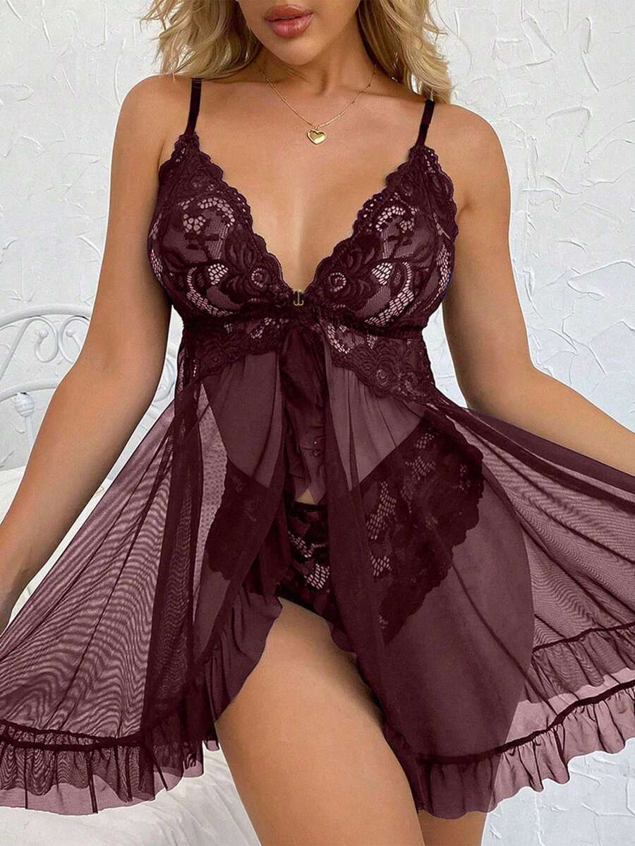 2 piezas conjunto de lenceria sexy para mujer, vestido de lenceria sexy con parches de encaje frances romantico de unicolor, adecuado para ropa de dormir sexy, camiseta de encaje, adecuado para uso en el hogar (marron)
