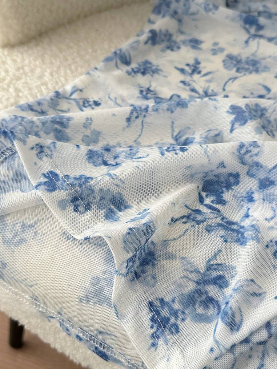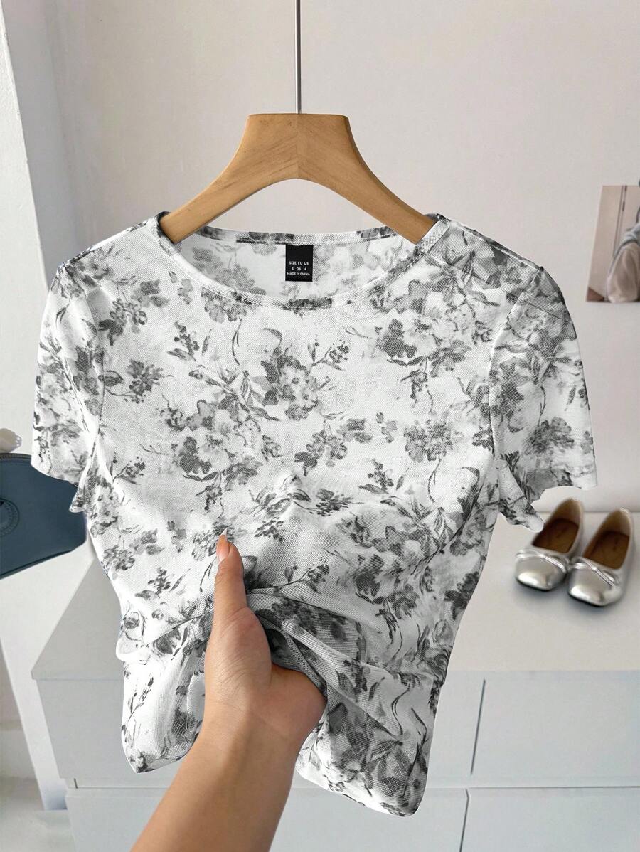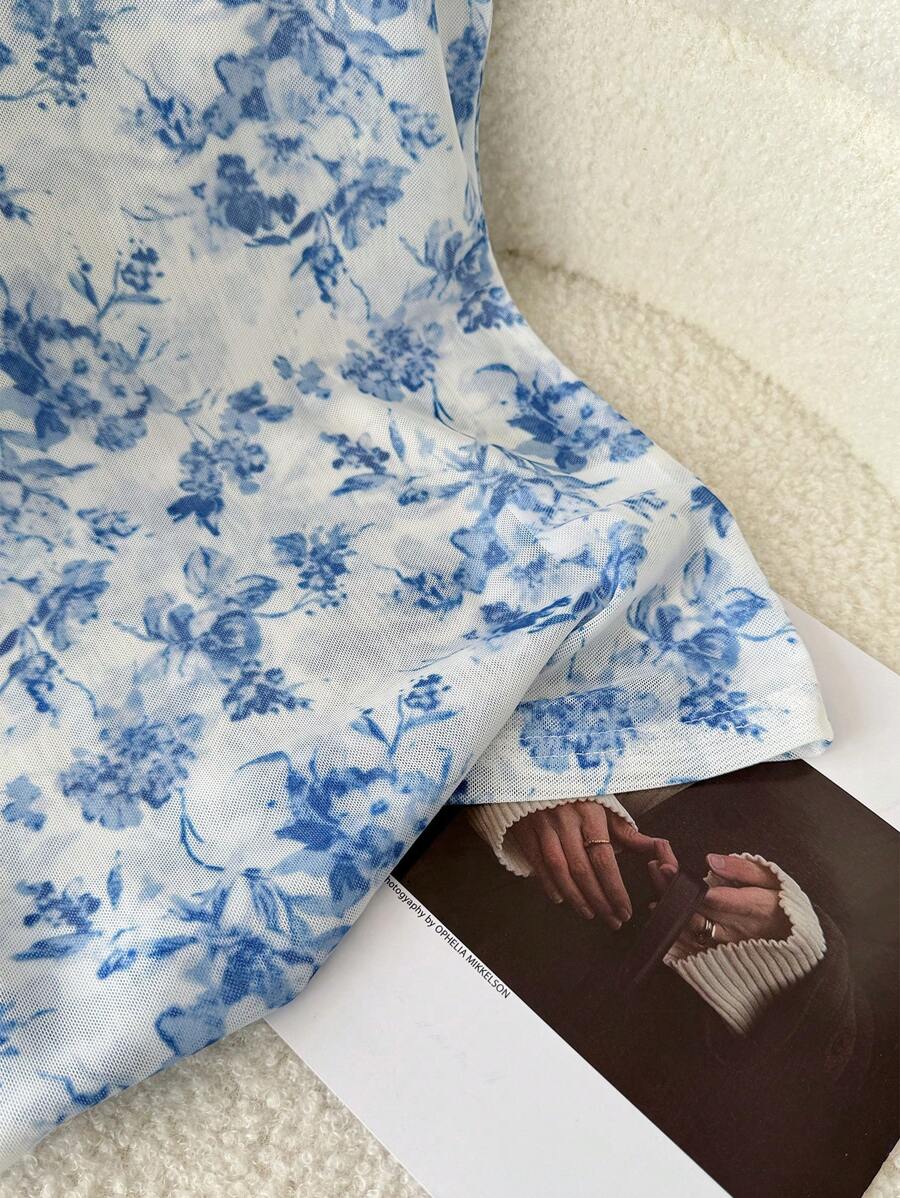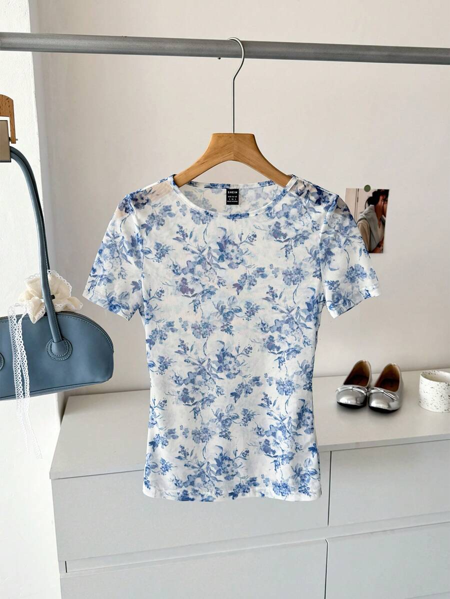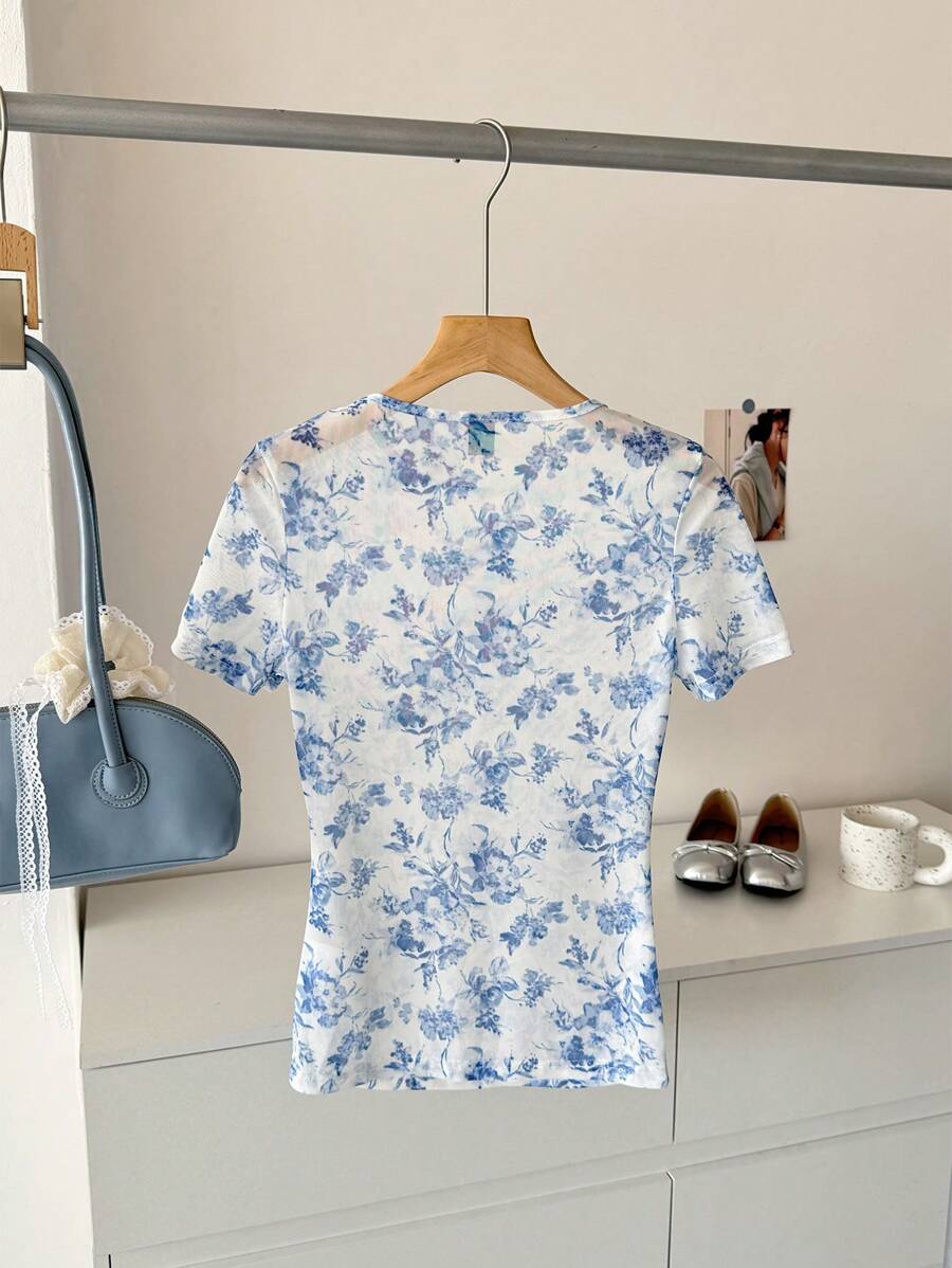 Camiseta para mujer de cuello redondo de manga corta de tela de gasa con estampado azul y blanco, para uso casual, de vacaciones y diario, para primavera y verano