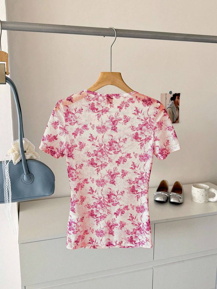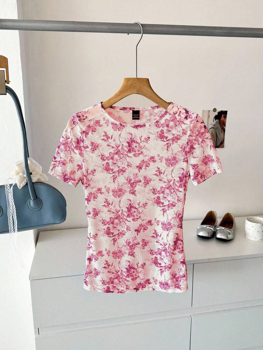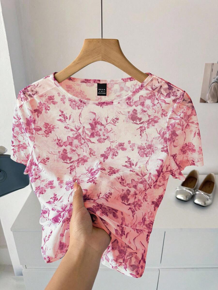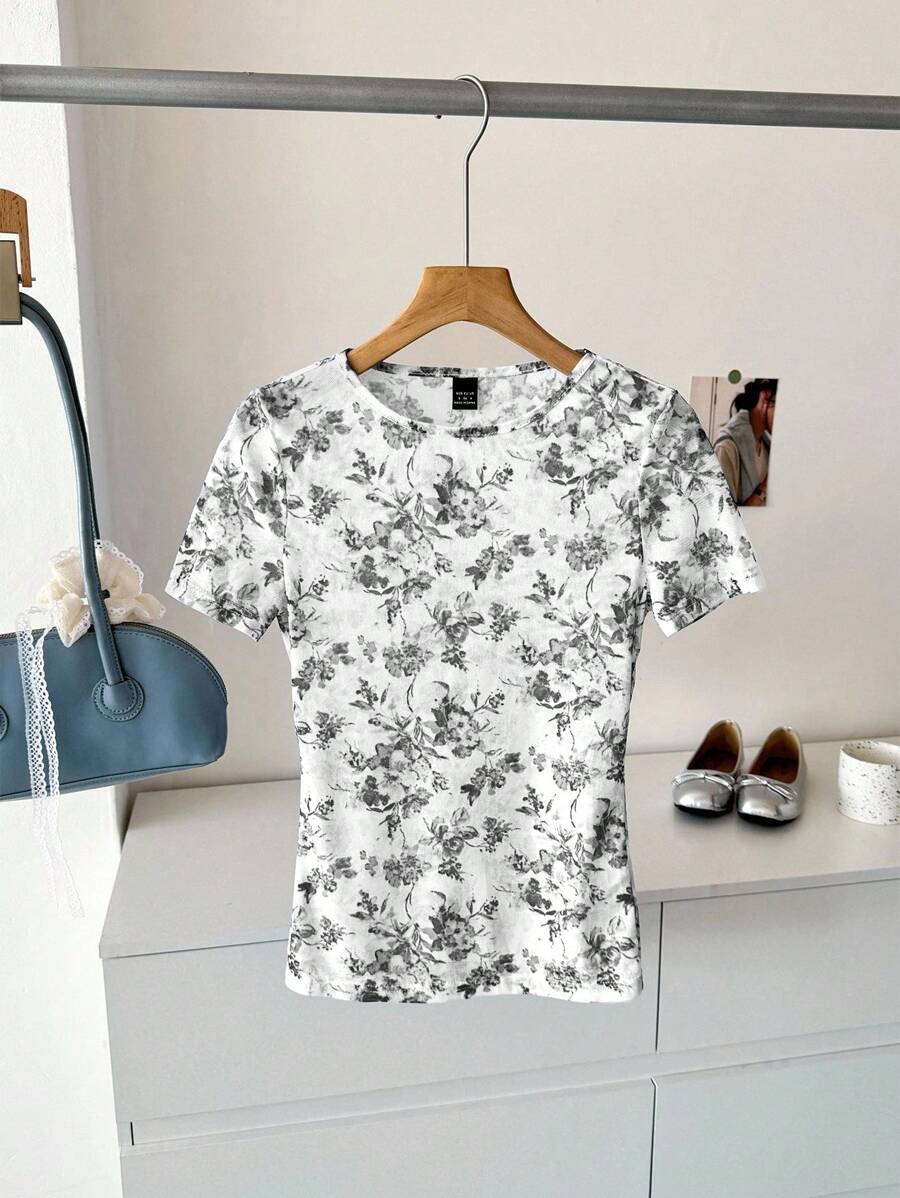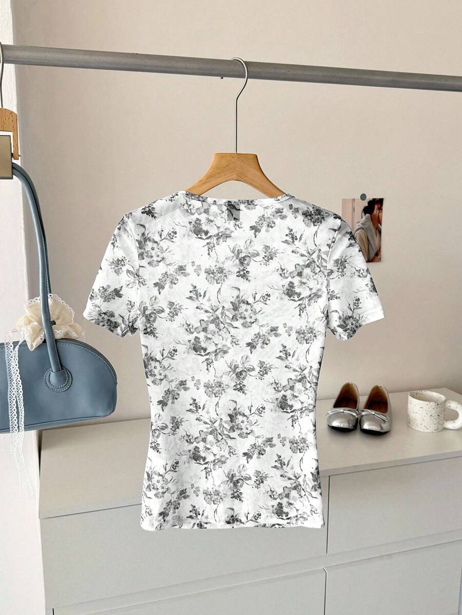 Camiseta para mujer de cuello redondo de manga corta de tela de gasa con estampado azul y blanco, para uso casual, de vacaciones y diario, para primavera y verano