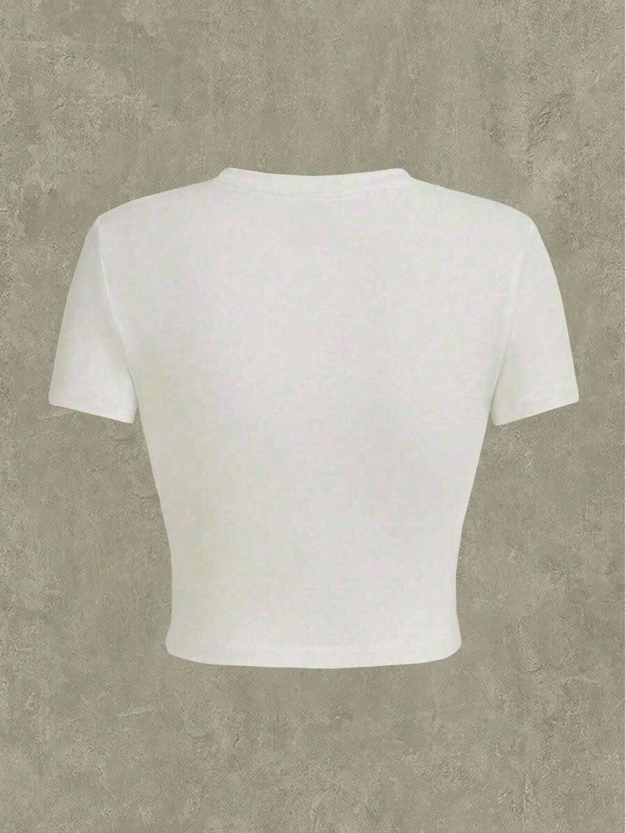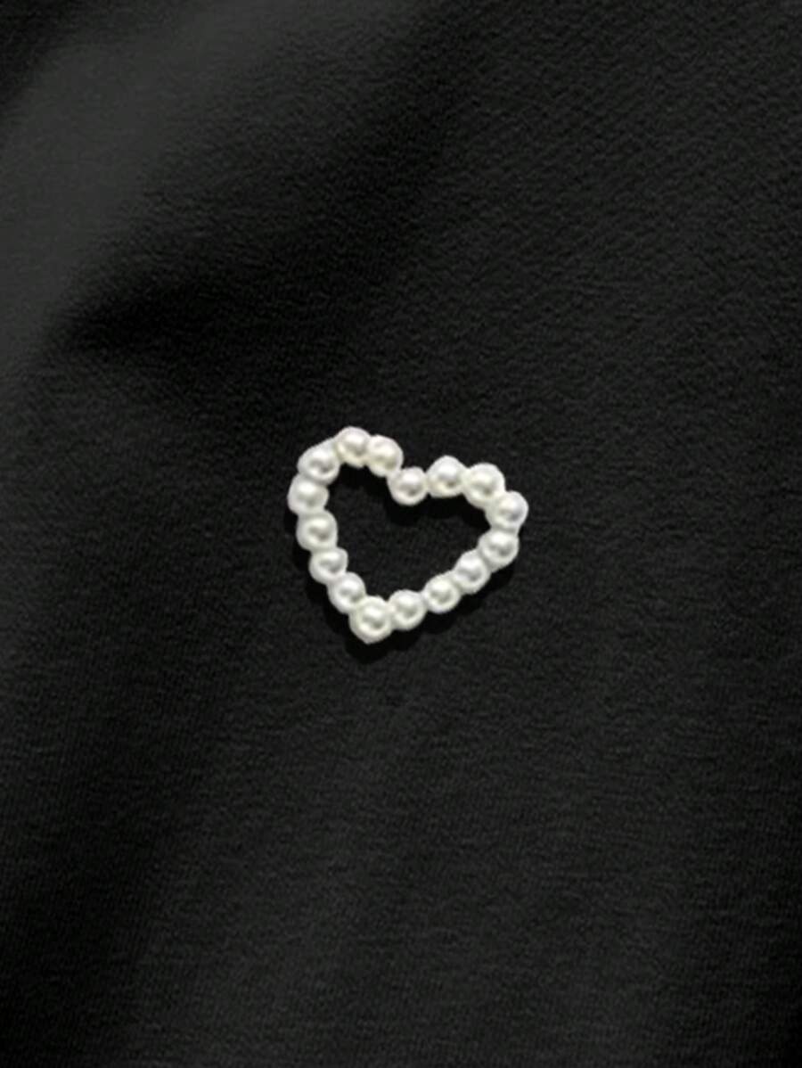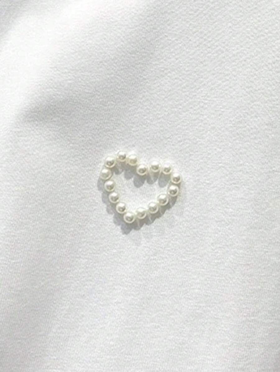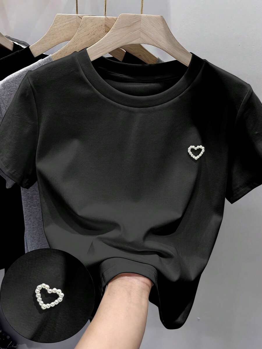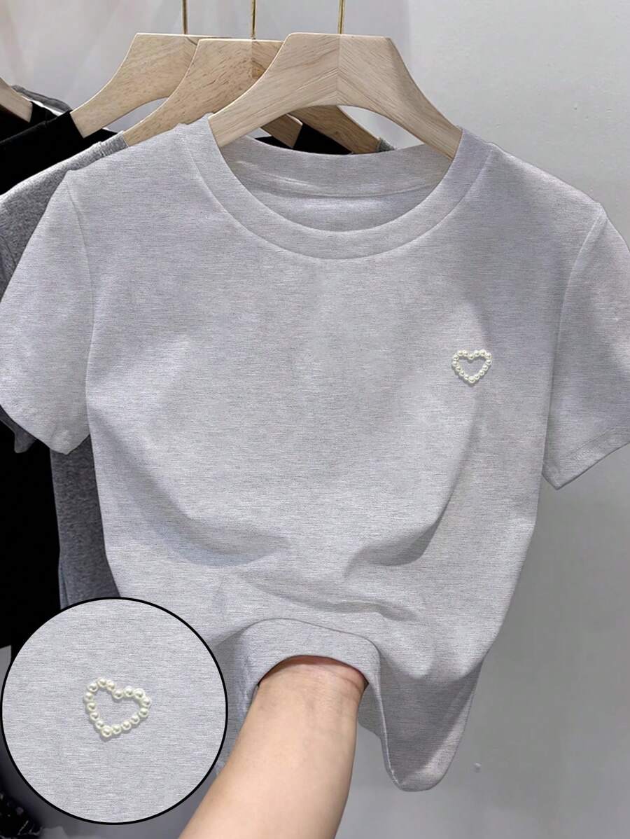 Camiseta de manga corta con cuello redondo, de verano, con perlas falsas en forma de corazon, estilo minimalista para mujer