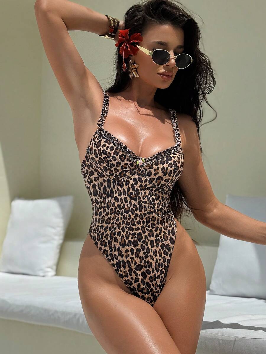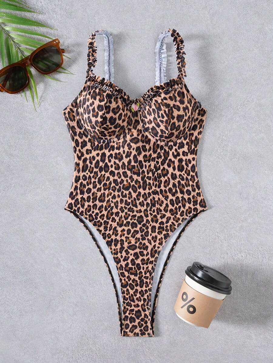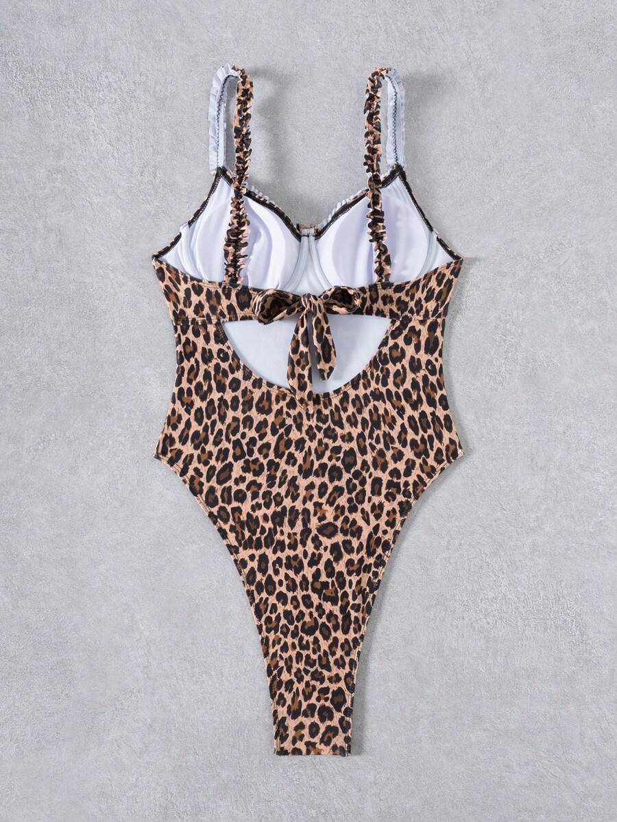 1 pieza traje de bano entero con fruncido frontal de acero y lazo en la espalda de mujer con estampado