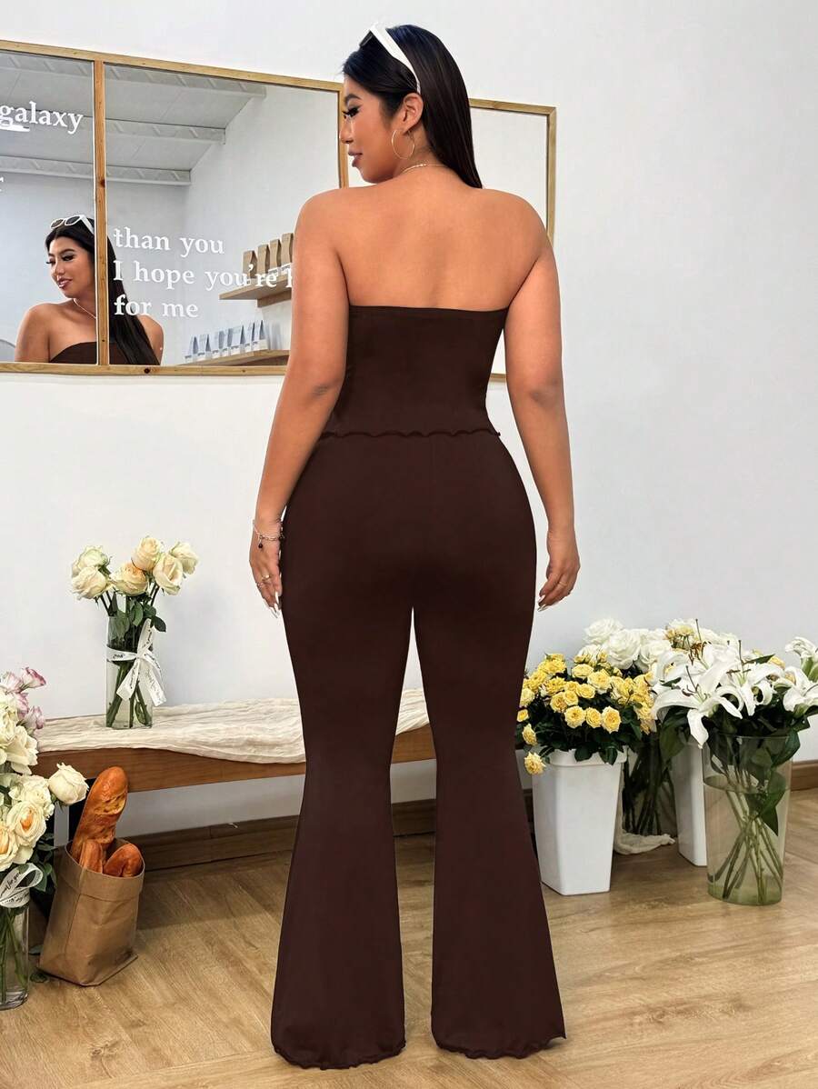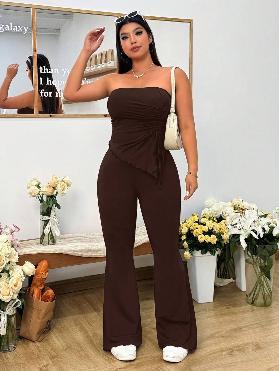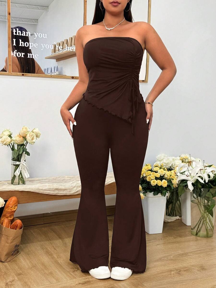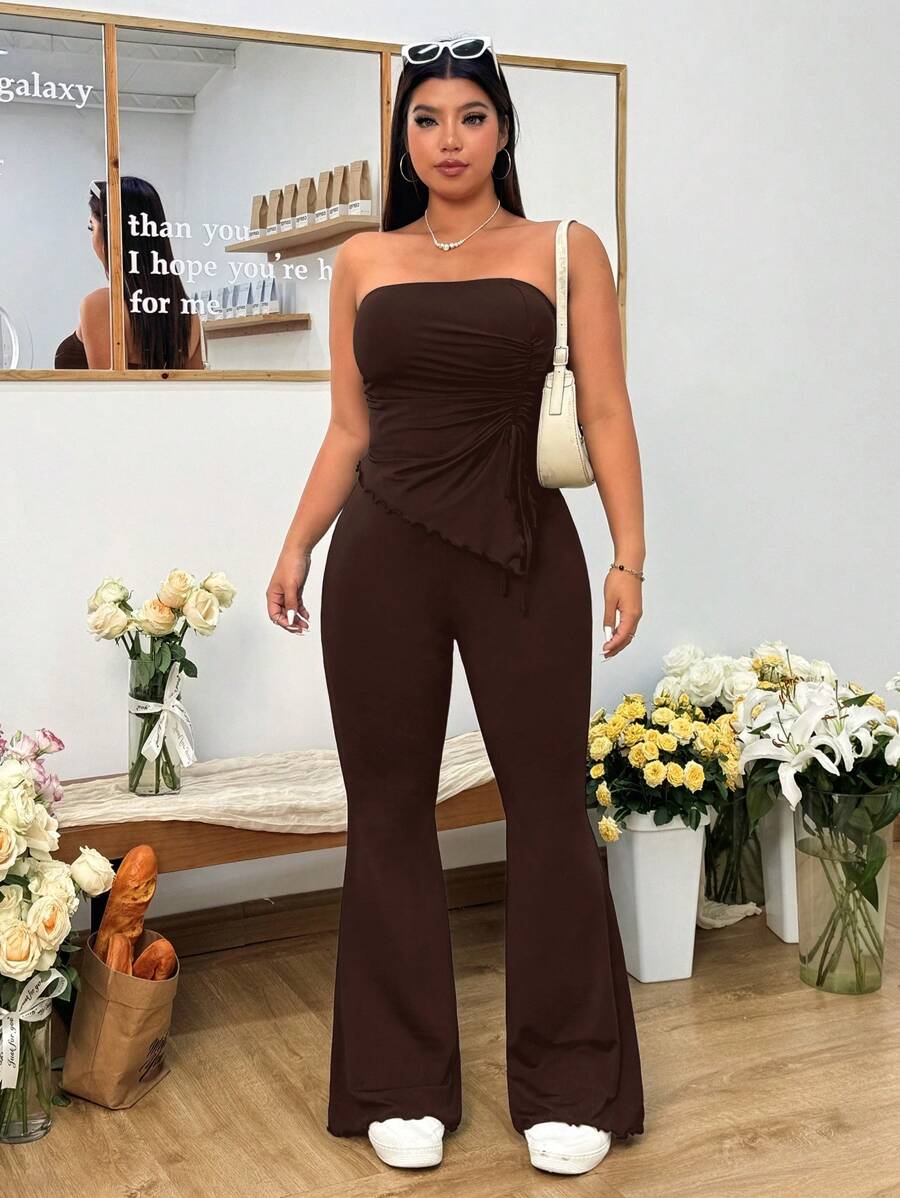 2 piezas conjunto de top tubo y jeans acampanados de talla grande en color marron, para primavera/verano