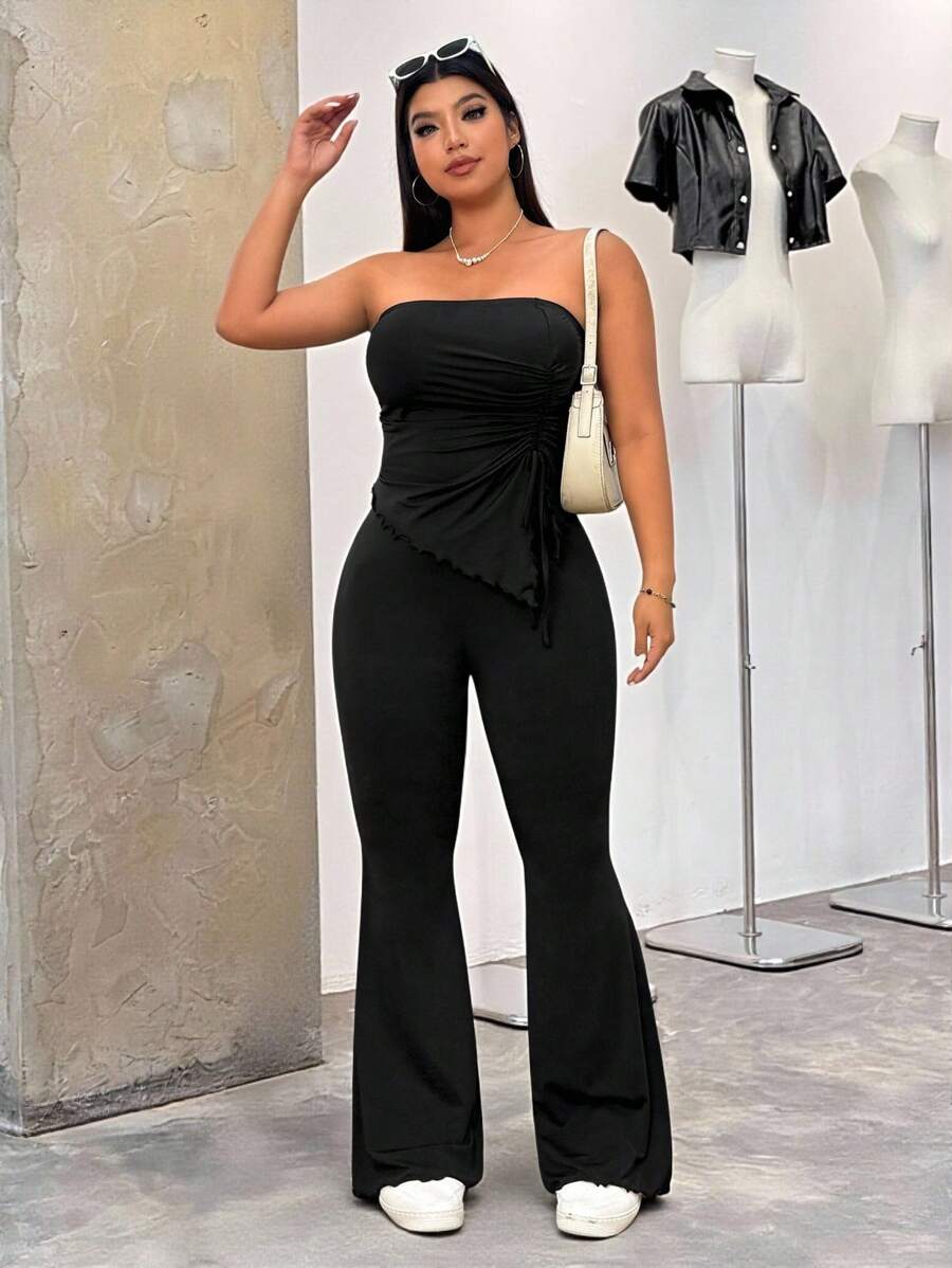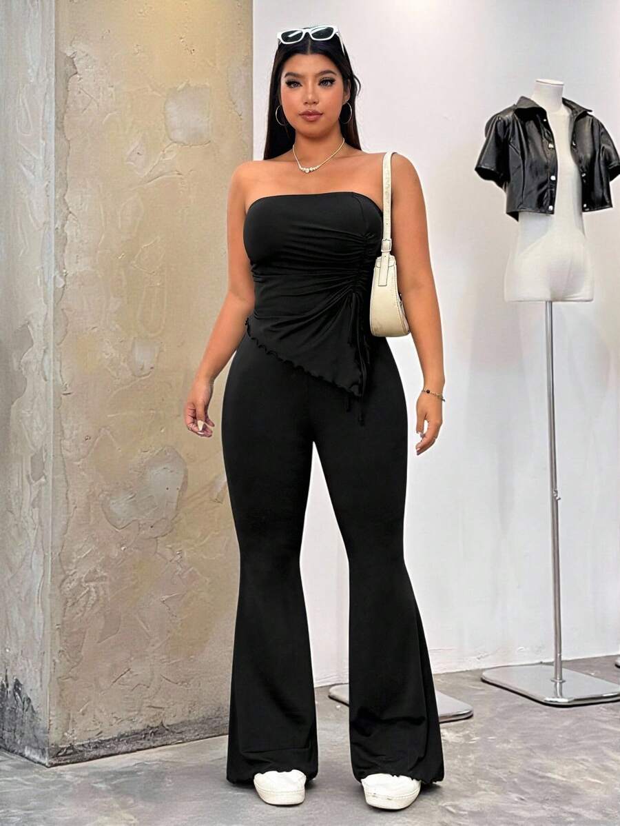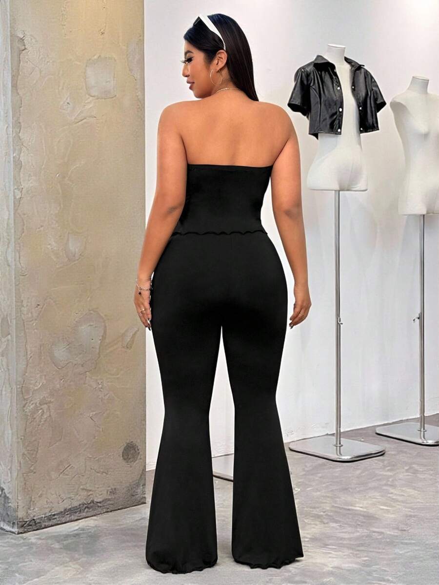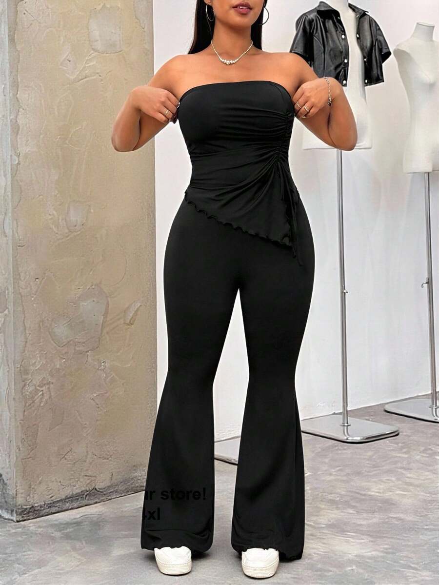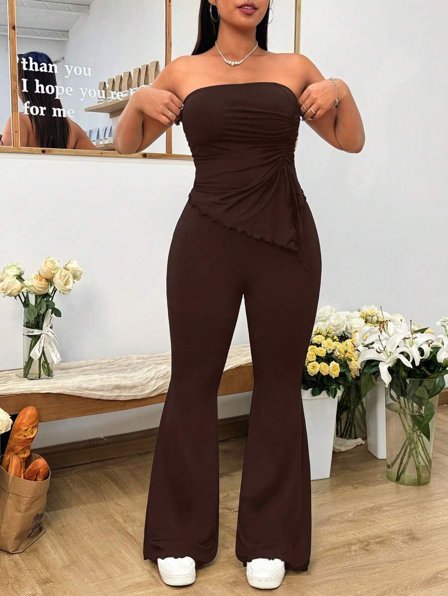 2 piezas conjunto de top tubo y jeans acampanados de talla grande en color marron, para primavera/verano