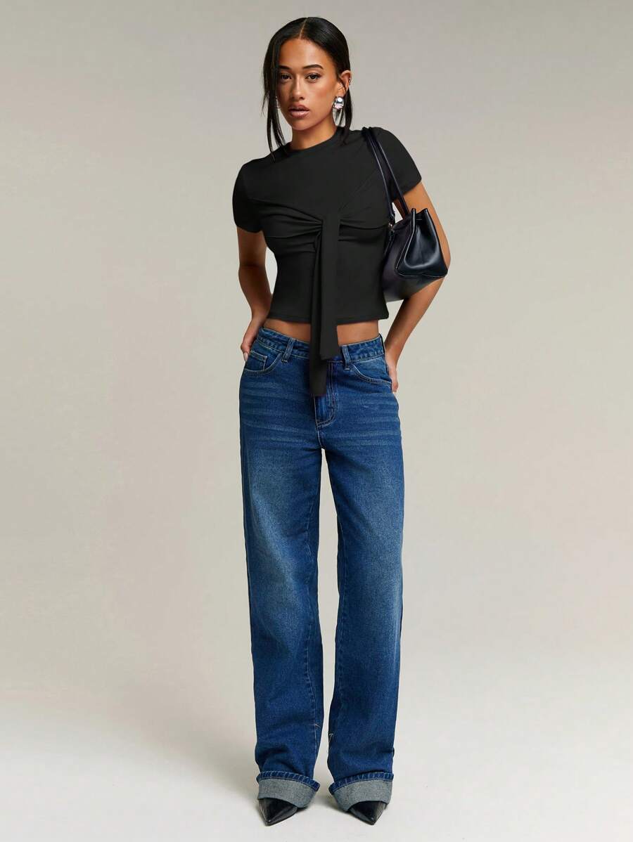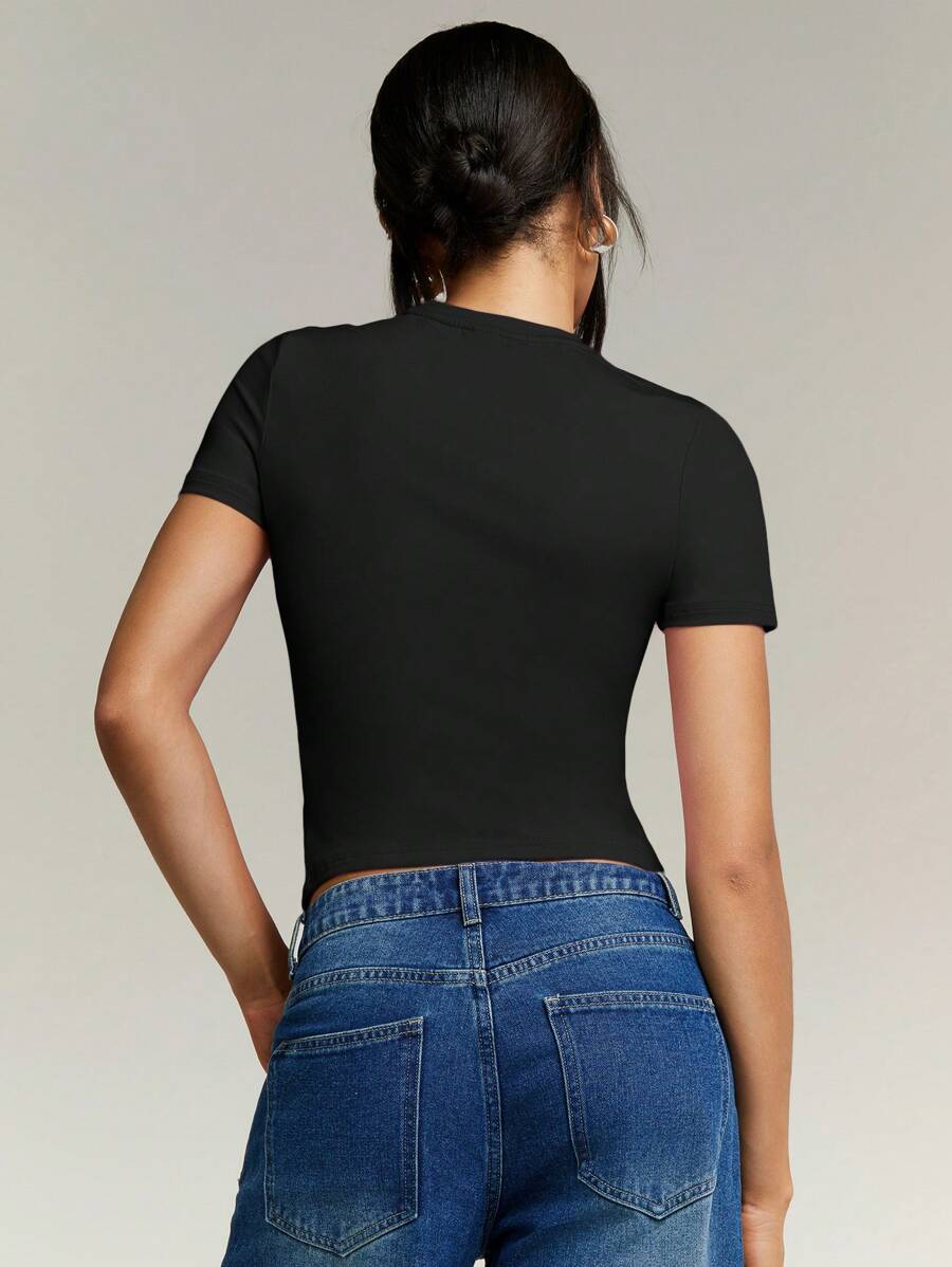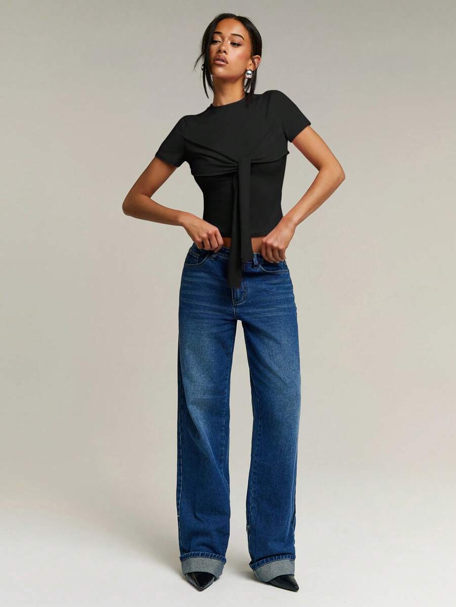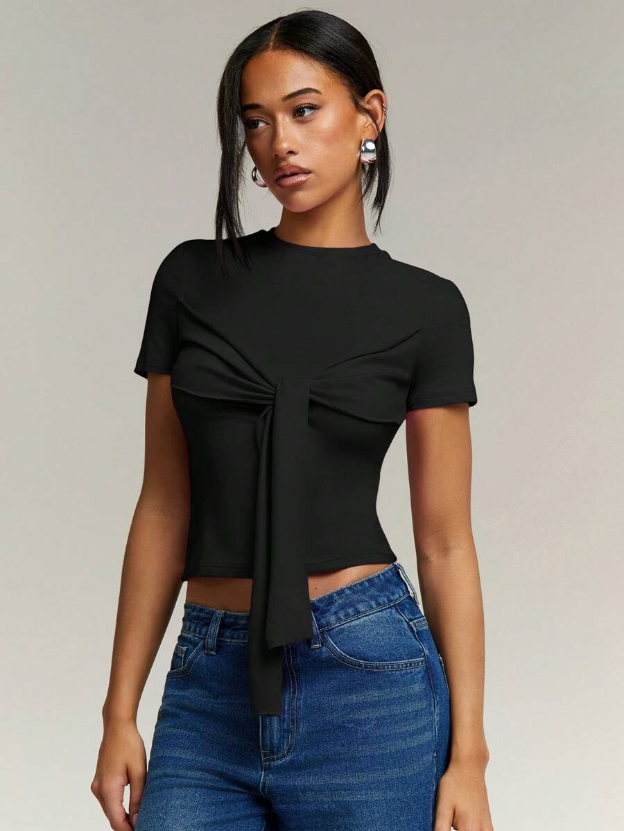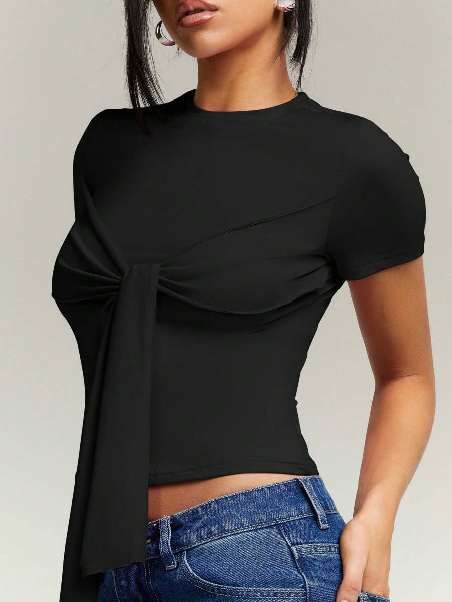 Athiral camiseta casual de mujer de manga corta con cuello redondo y nudo, de unicolor de verano