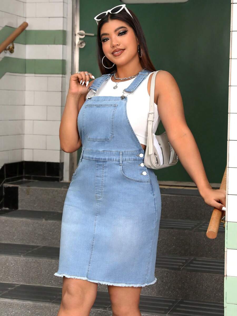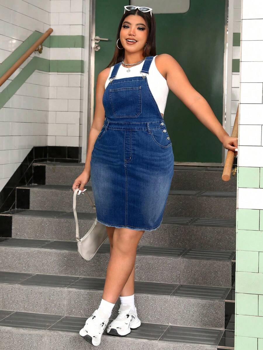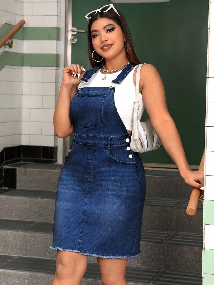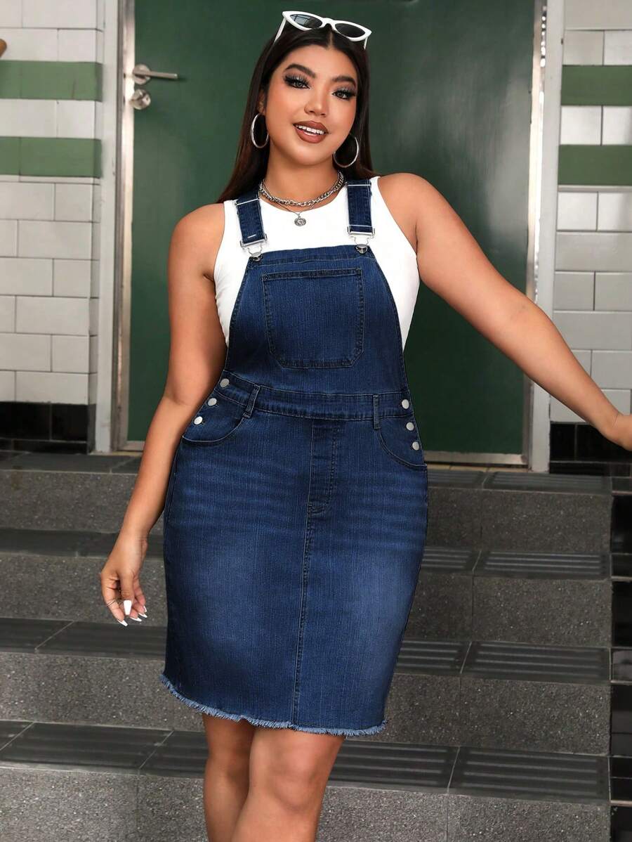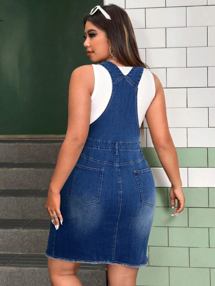 Vestido peto de mezclilla con borde deshilachado para mujer de talla grande, estilo escolar casual