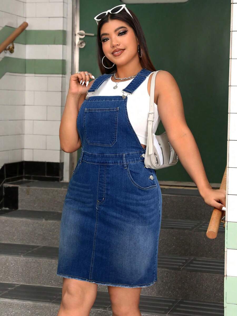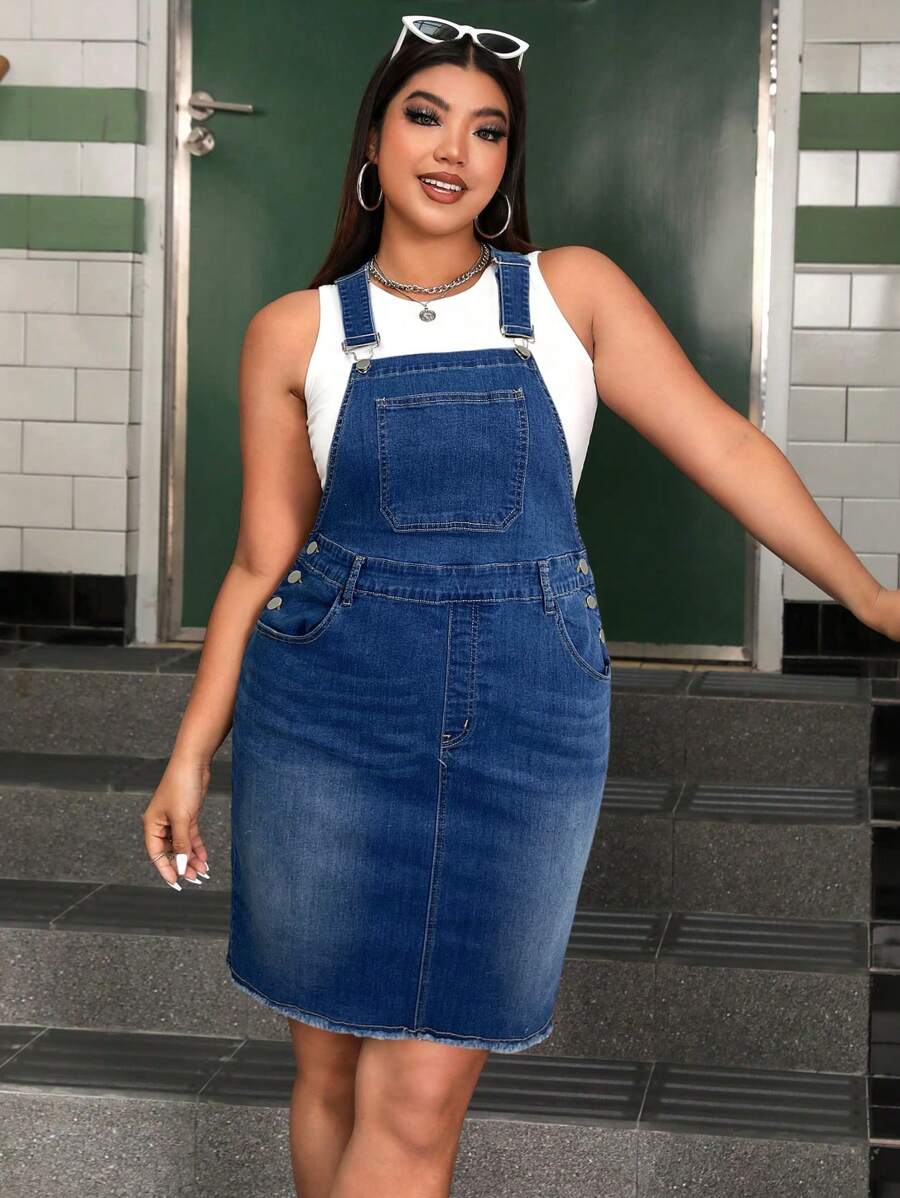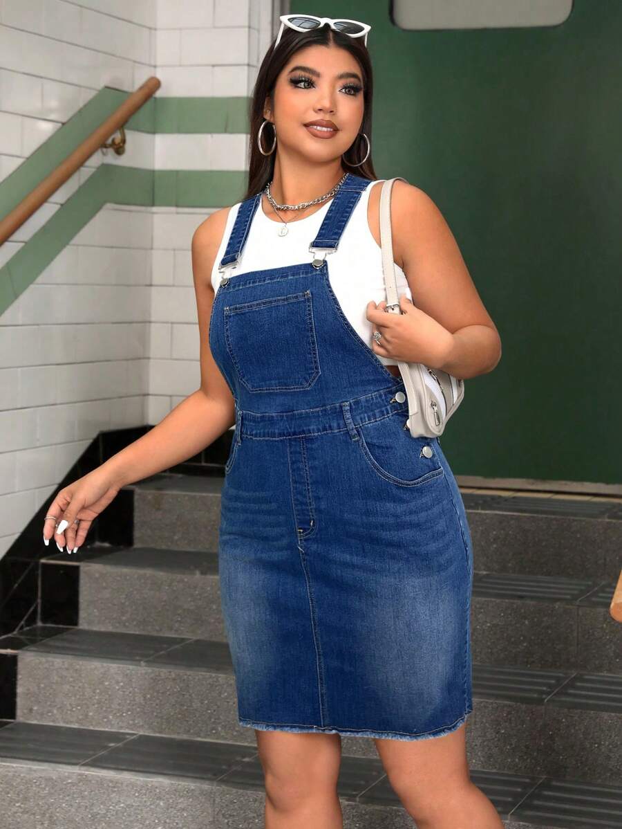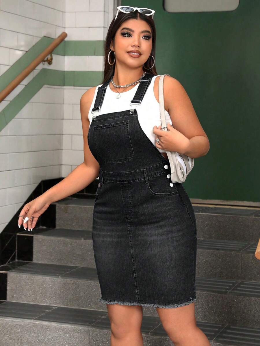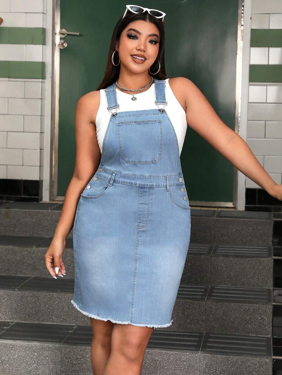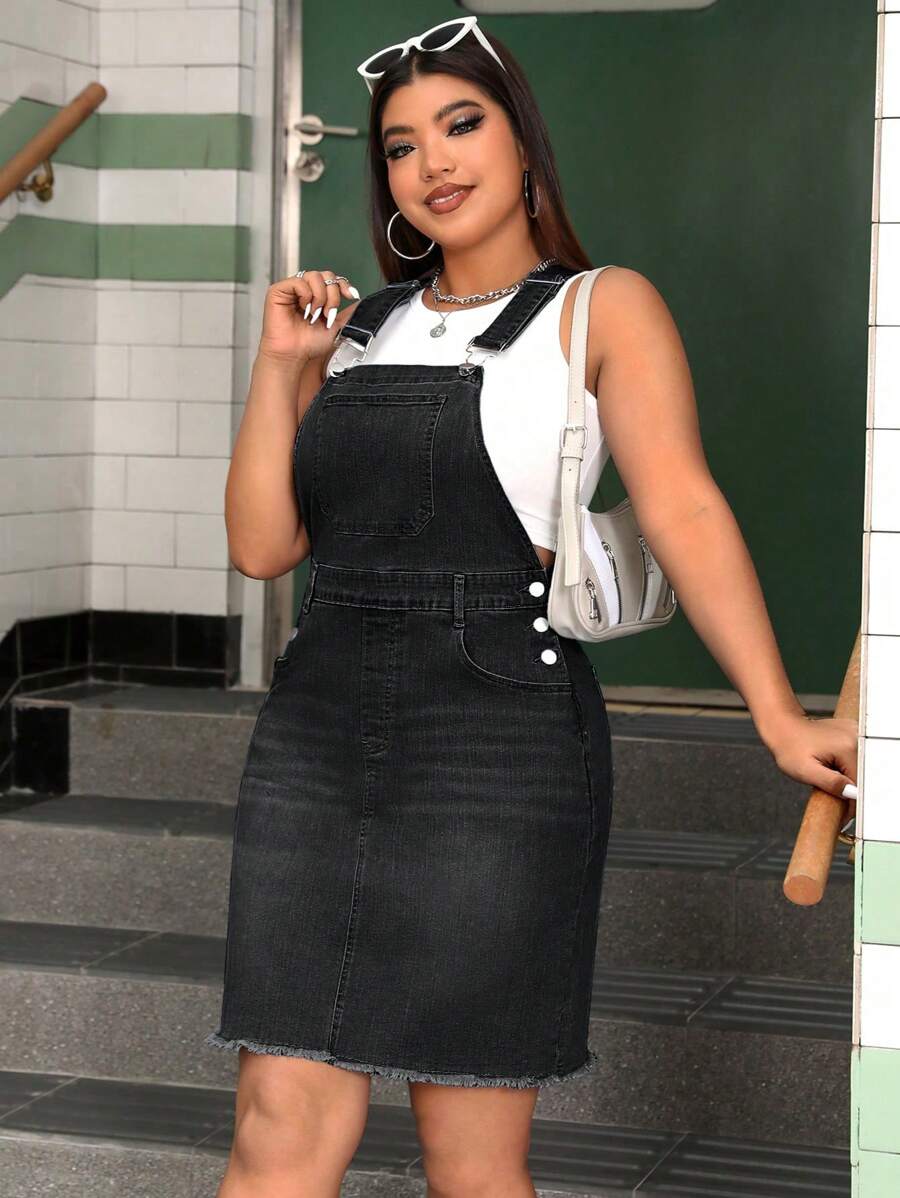 Vestido peto de mezclilla con borde deshilachado para mujer de talla grande, estilo escolar casual