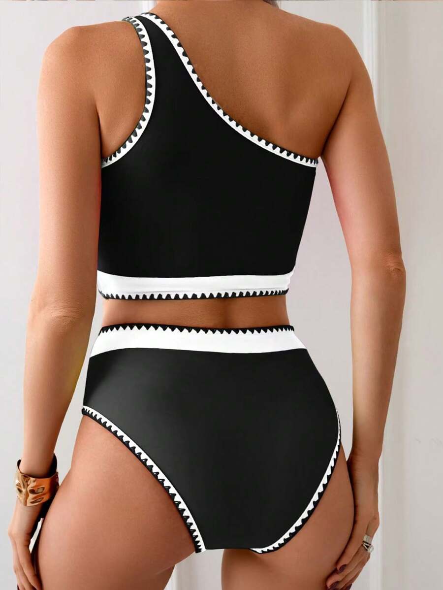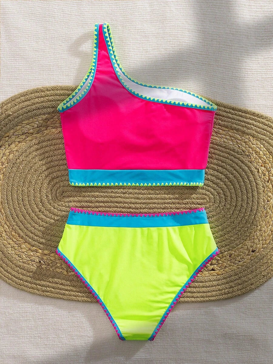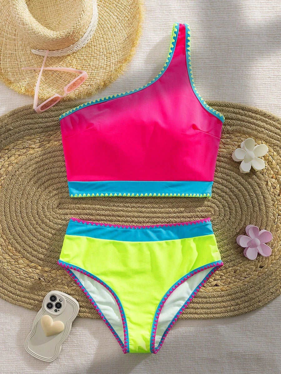 2 piezas traje de bano de colores contrastantes, bikini de un hombro con cintura alta de colores vibrantes