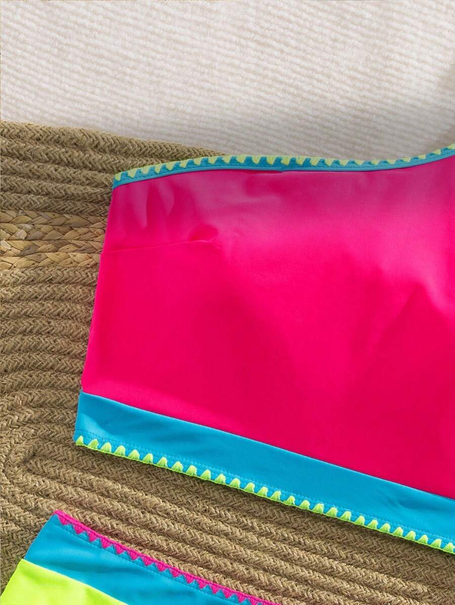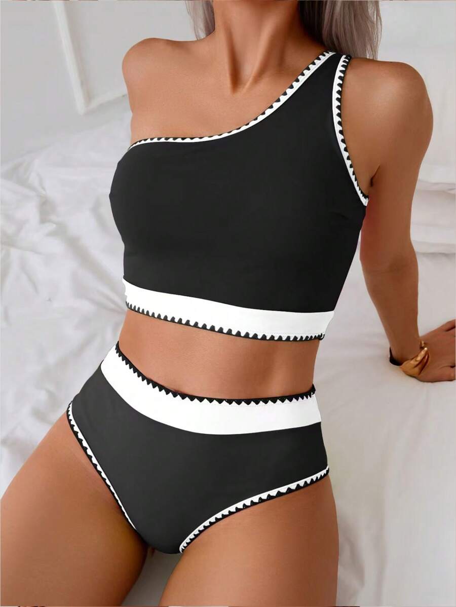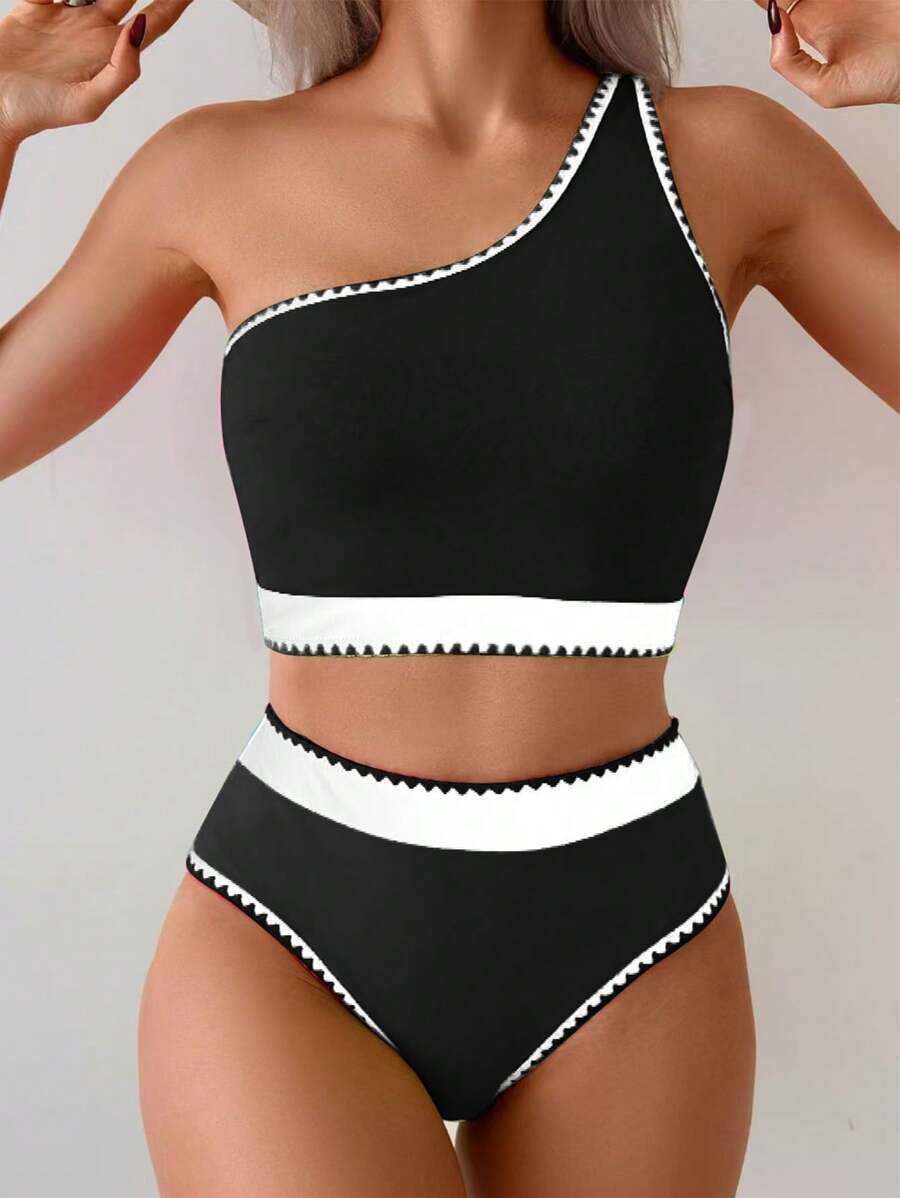 2 piezas traje de bano de colores contrastantes, bikini de un hombro con cintura alta de colores vibrantes