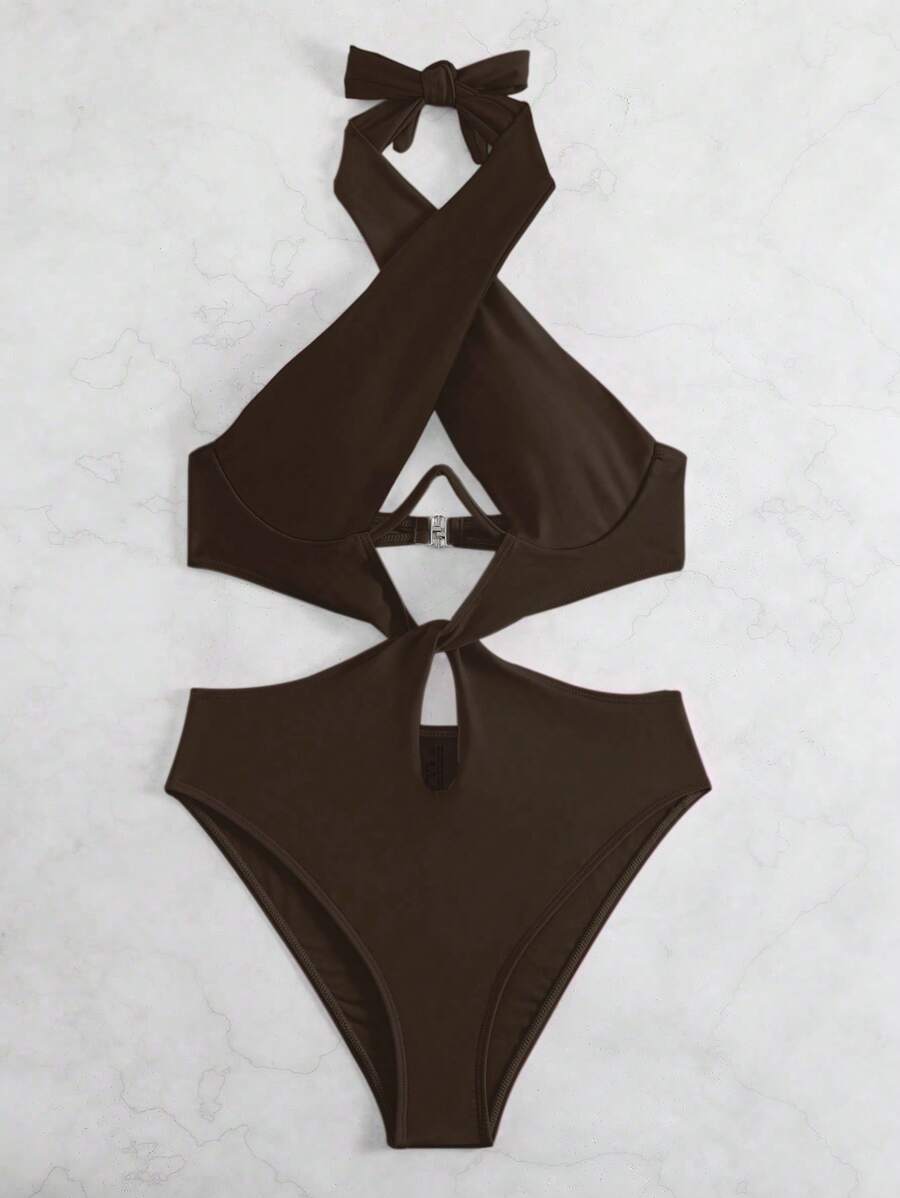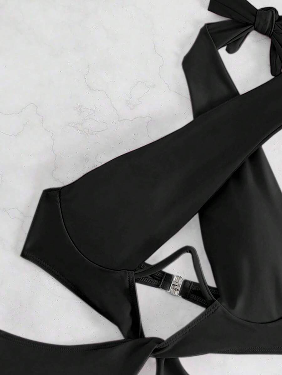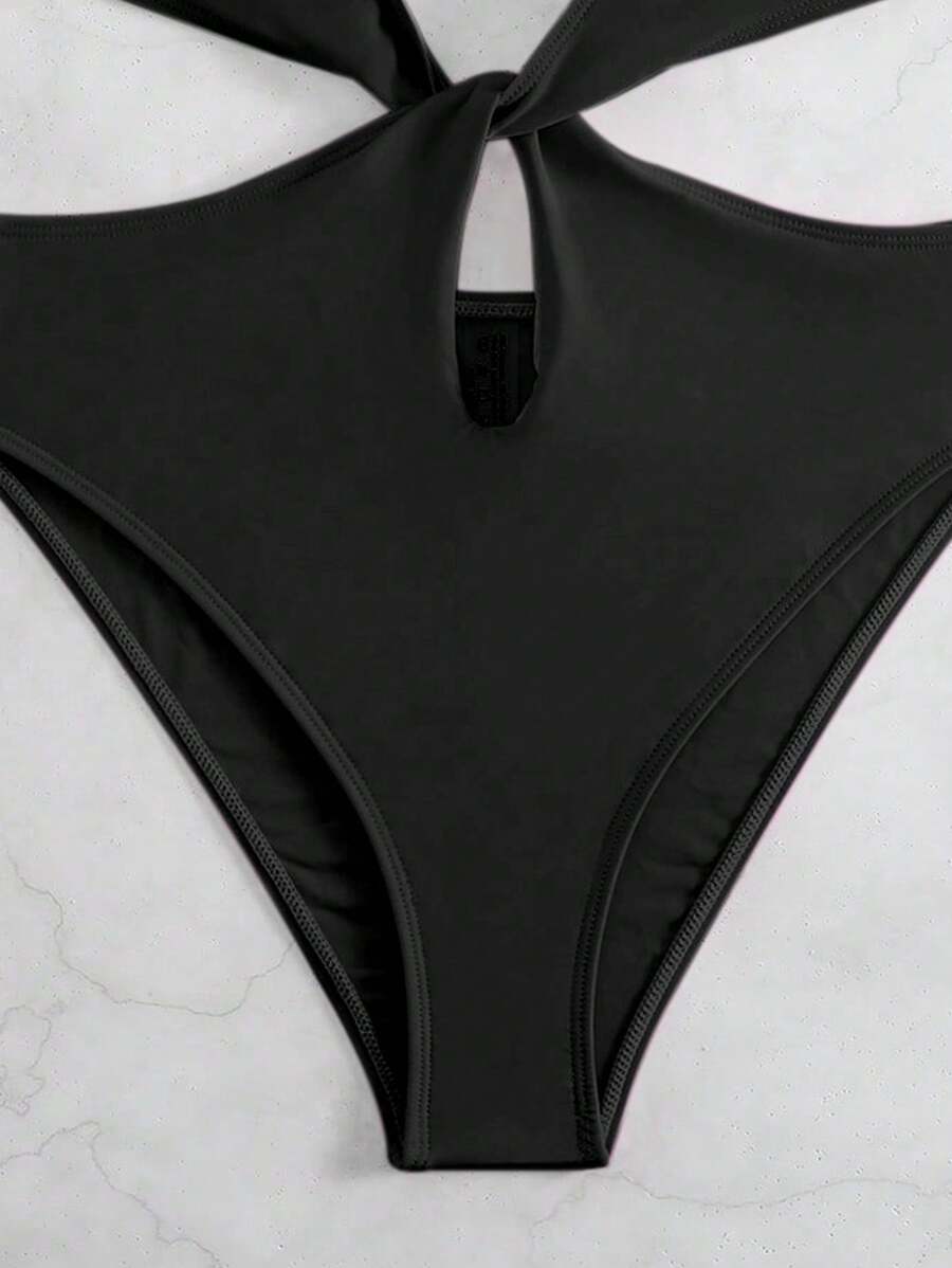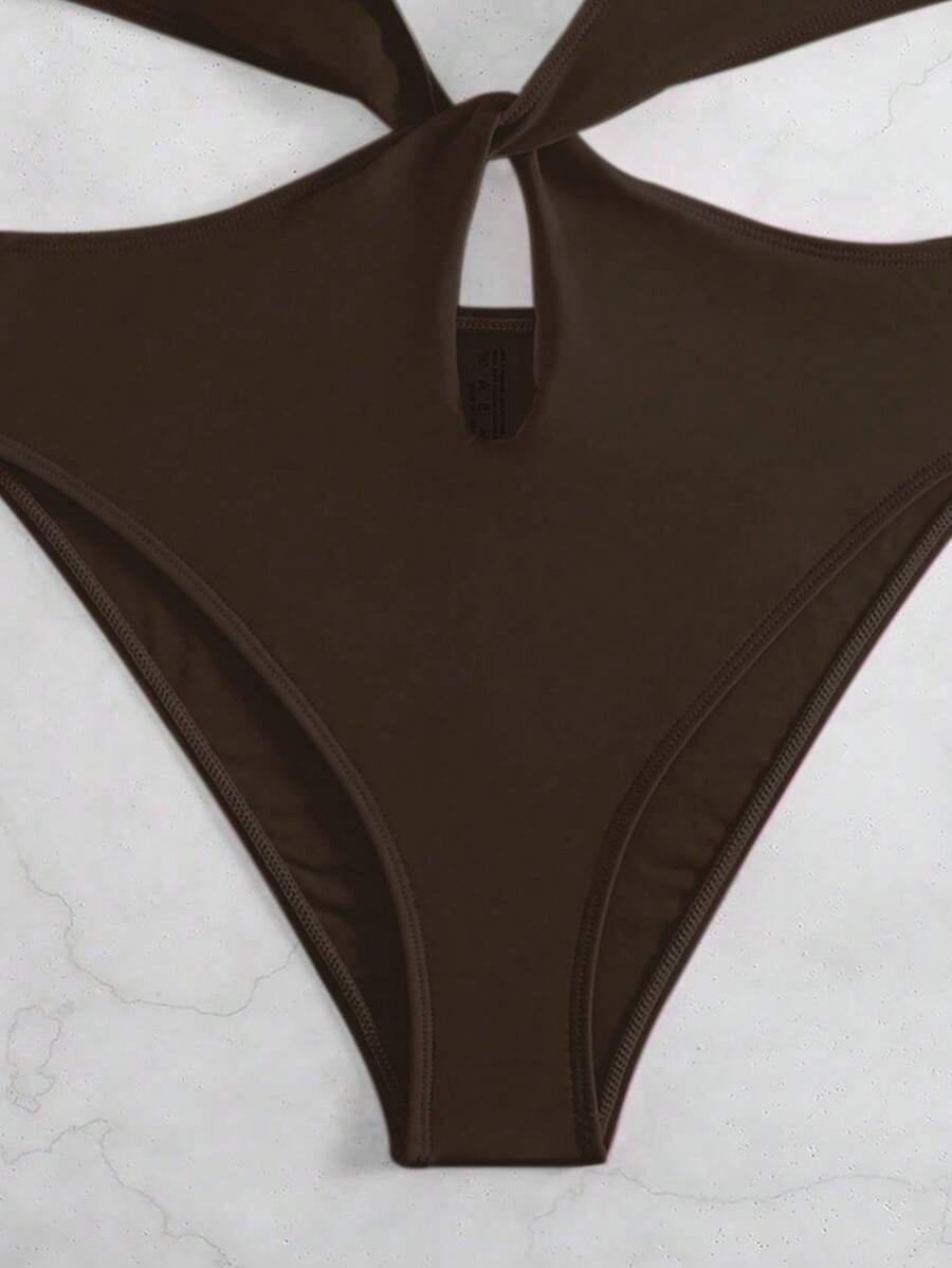 1 pieza traje de bano de un solo color con cuello de halter y aros, sin efecto push up