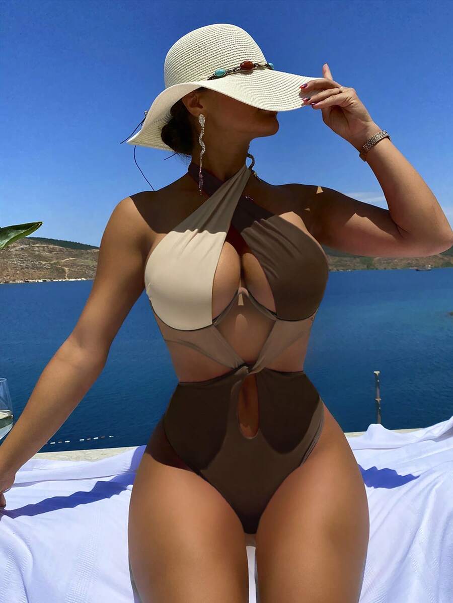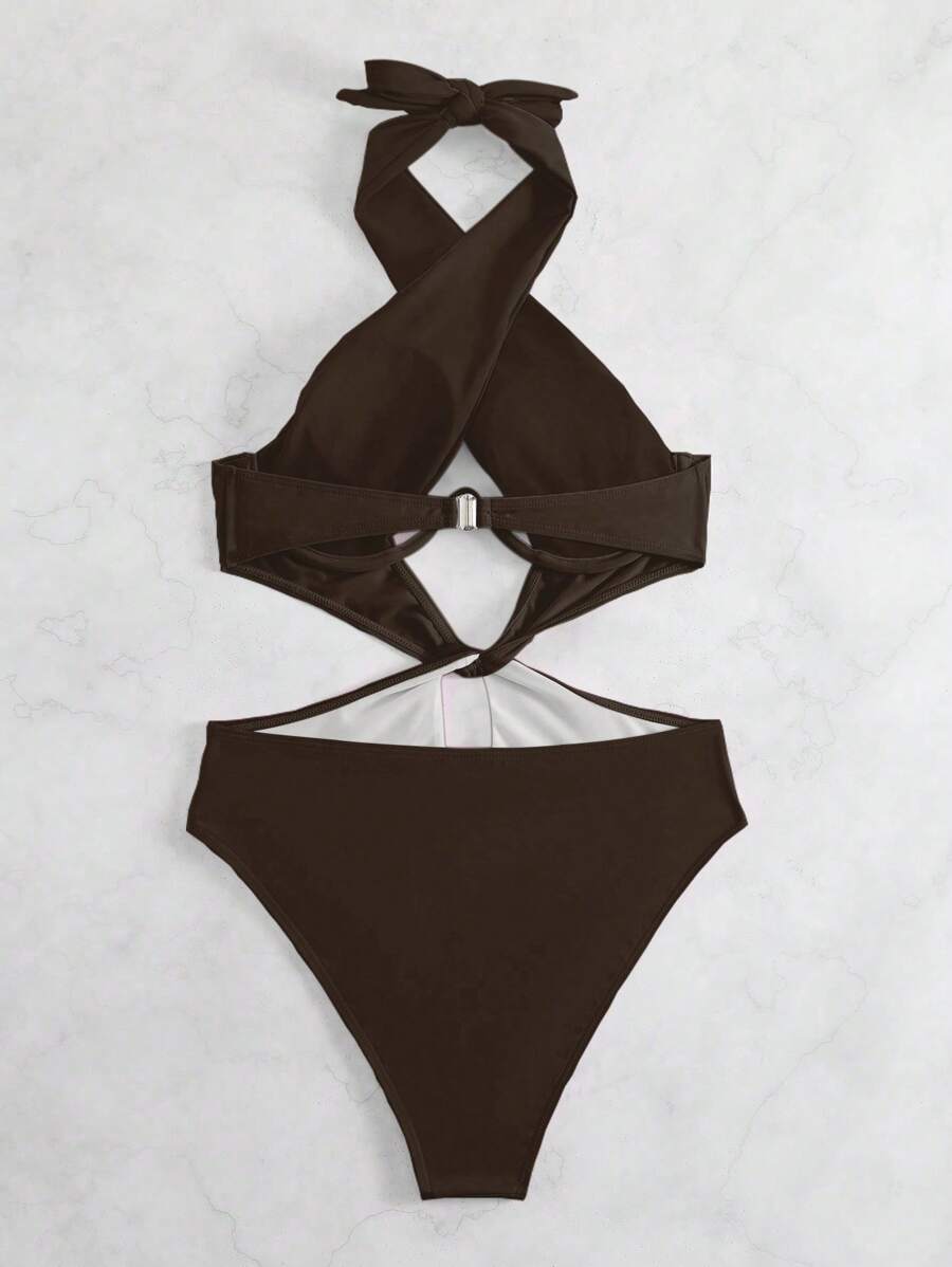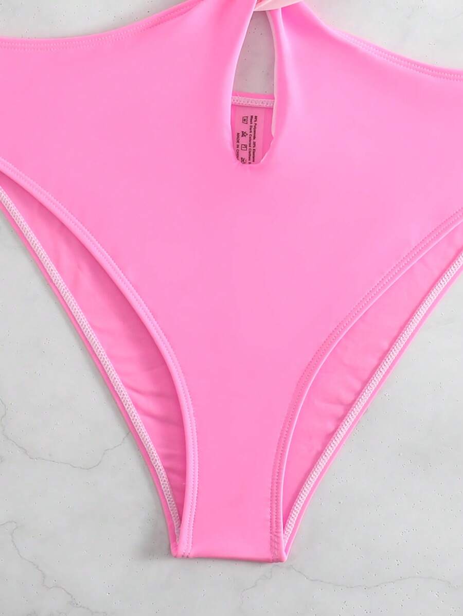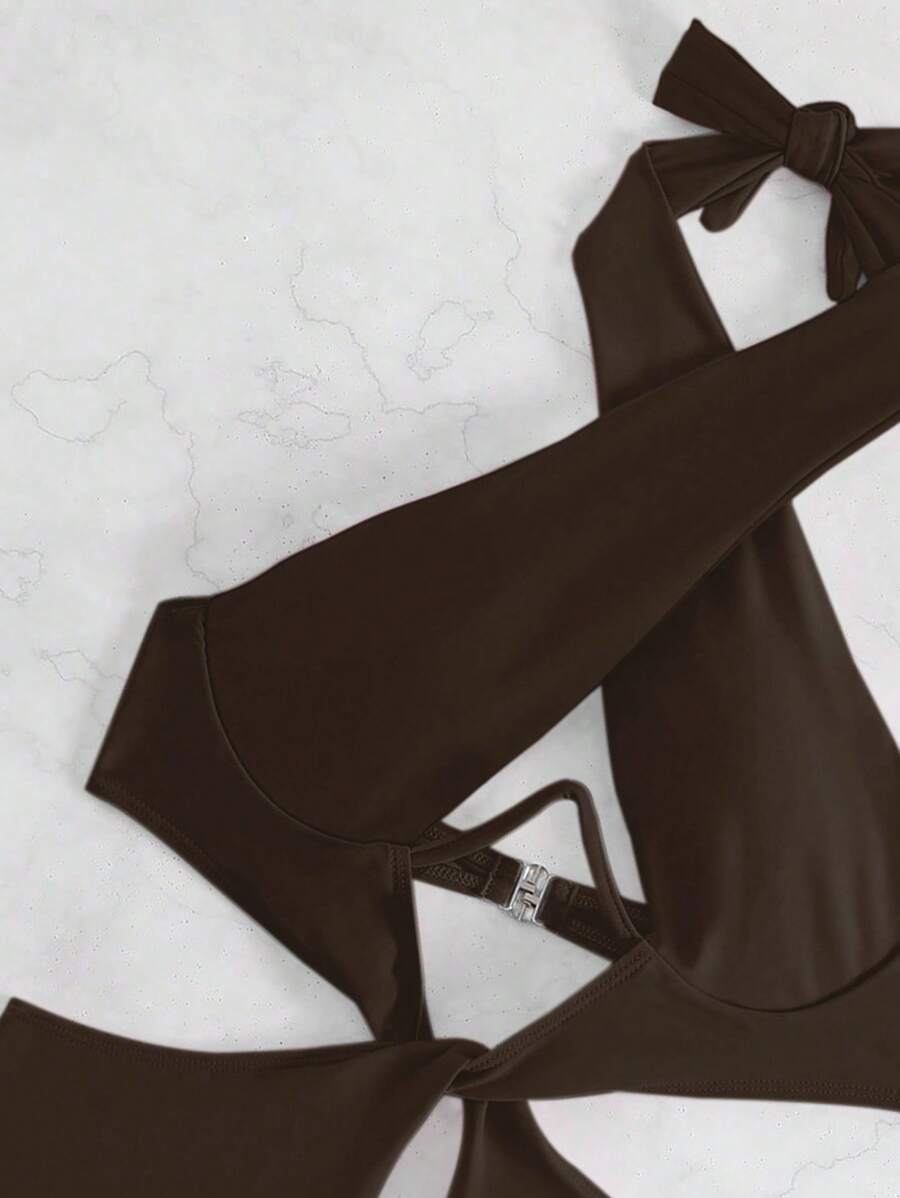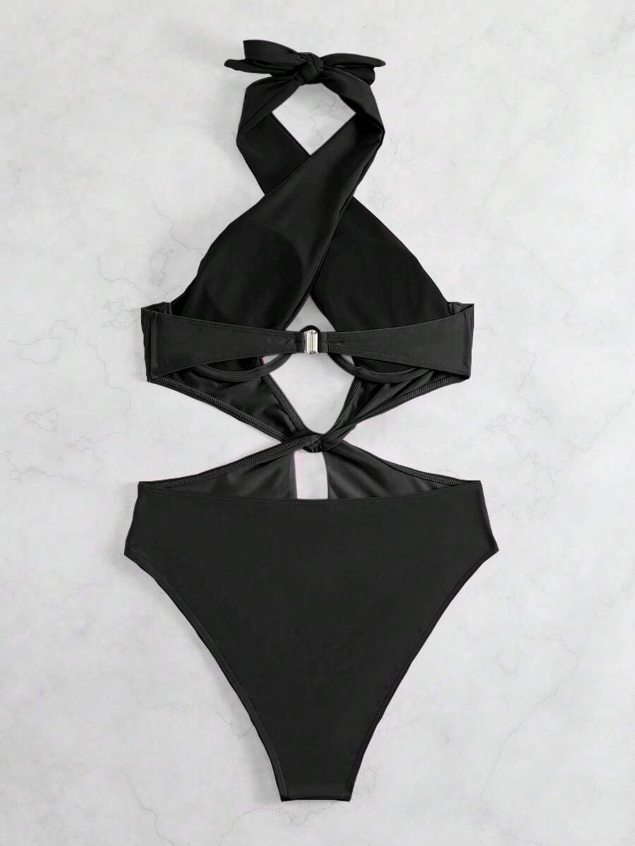 1 pieza traje de bano de un solo color con cuello de halter y aros, sin efecto push up