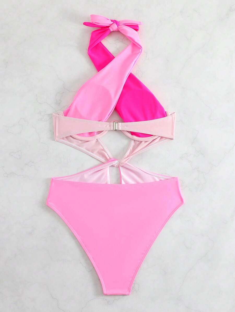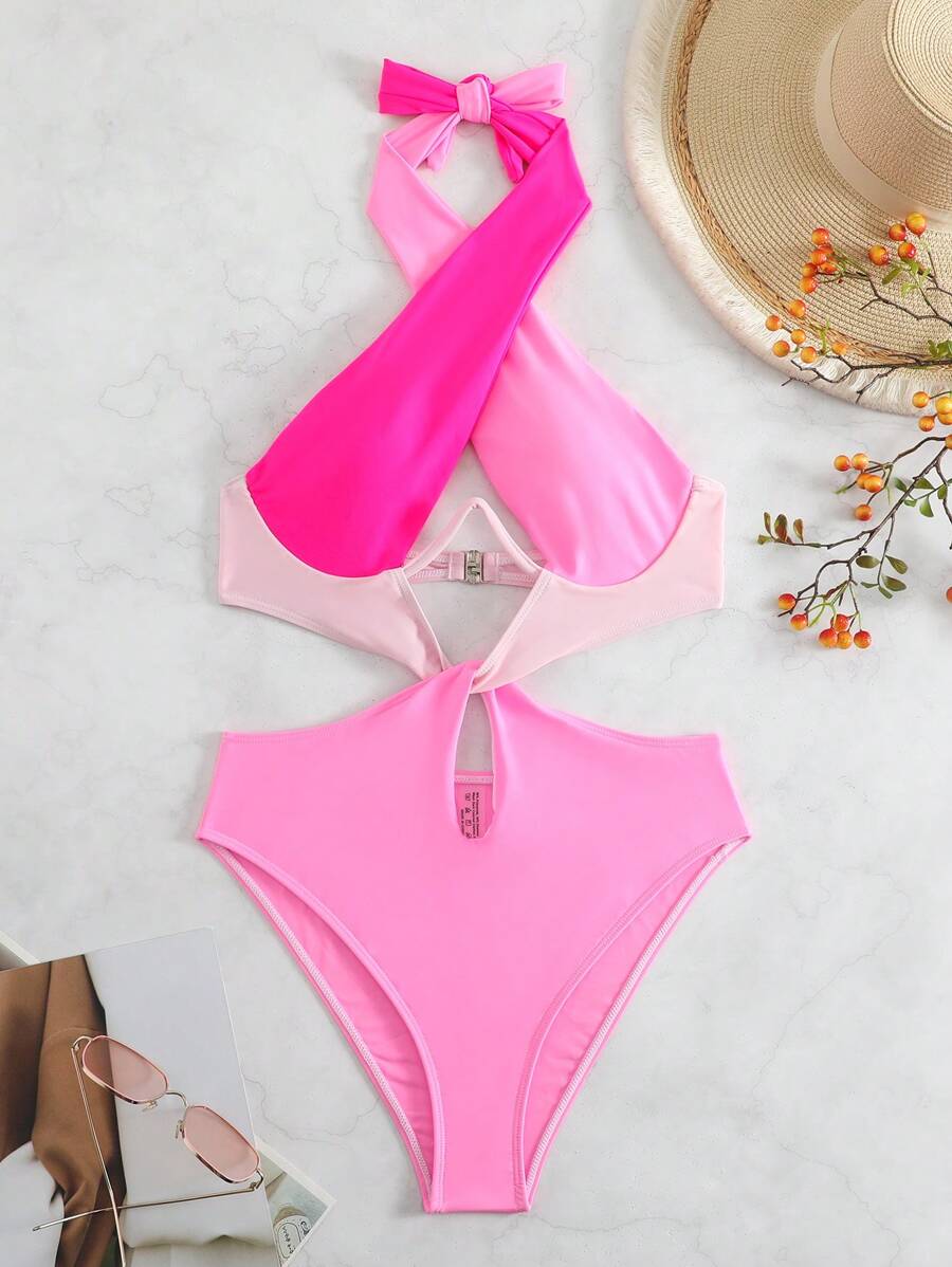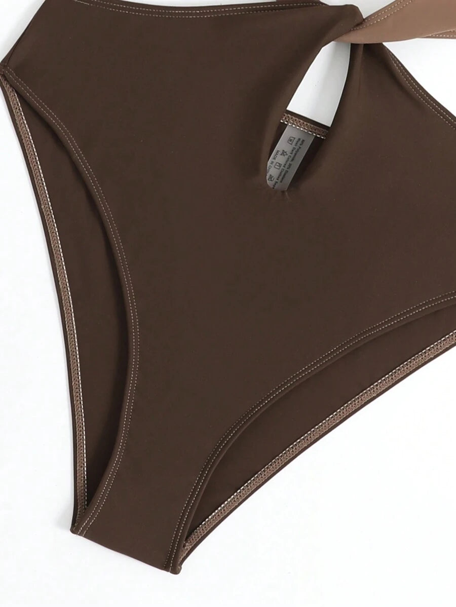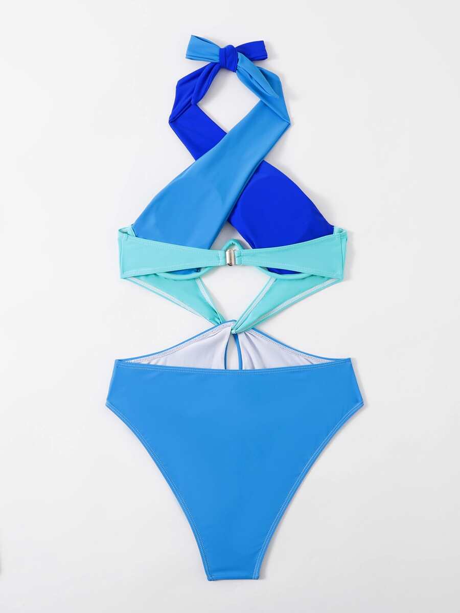 1 pieza traje de bano de un solo color con cuello de halter y aros, sin efecto push up