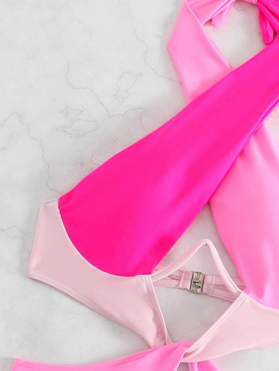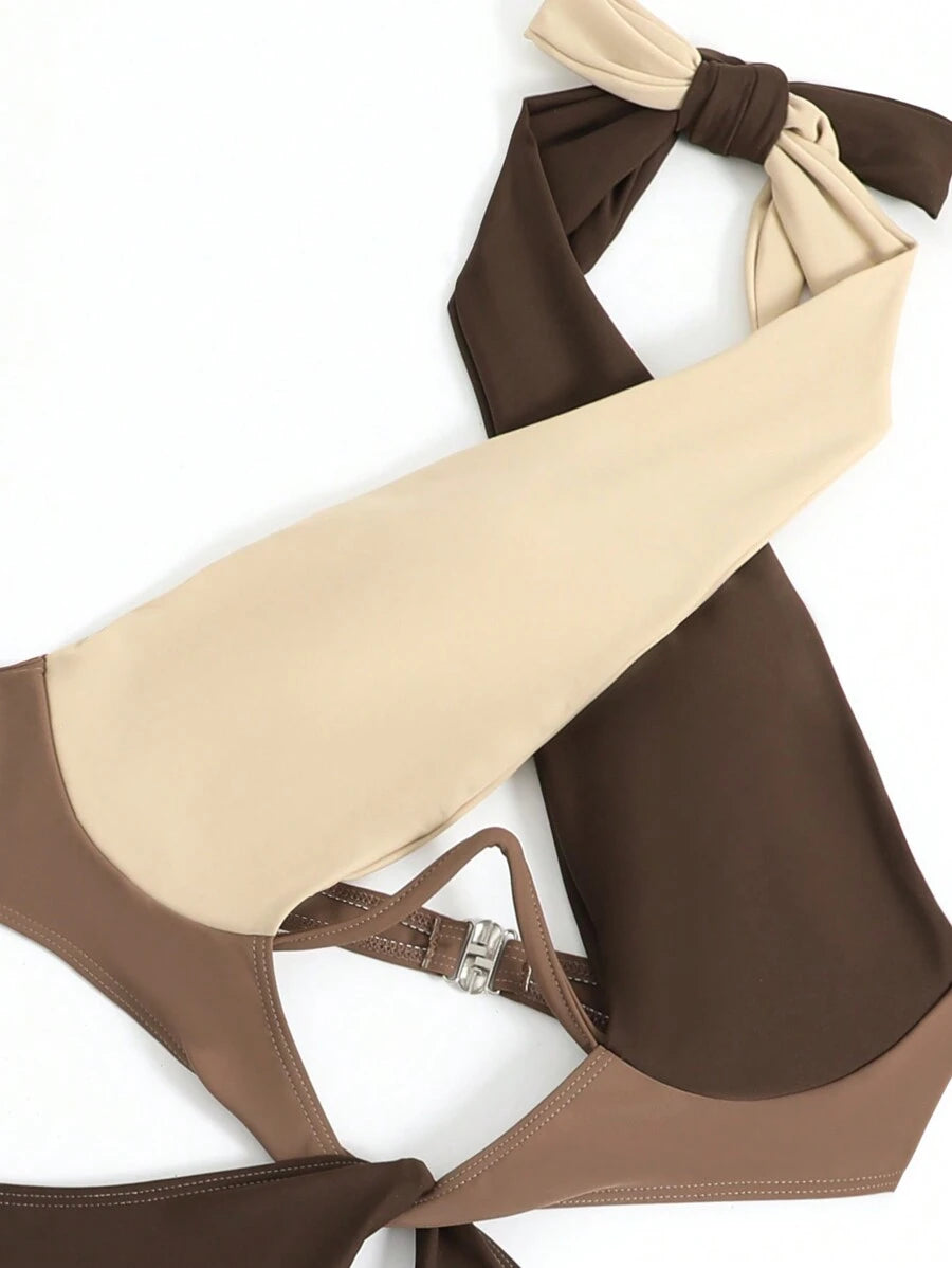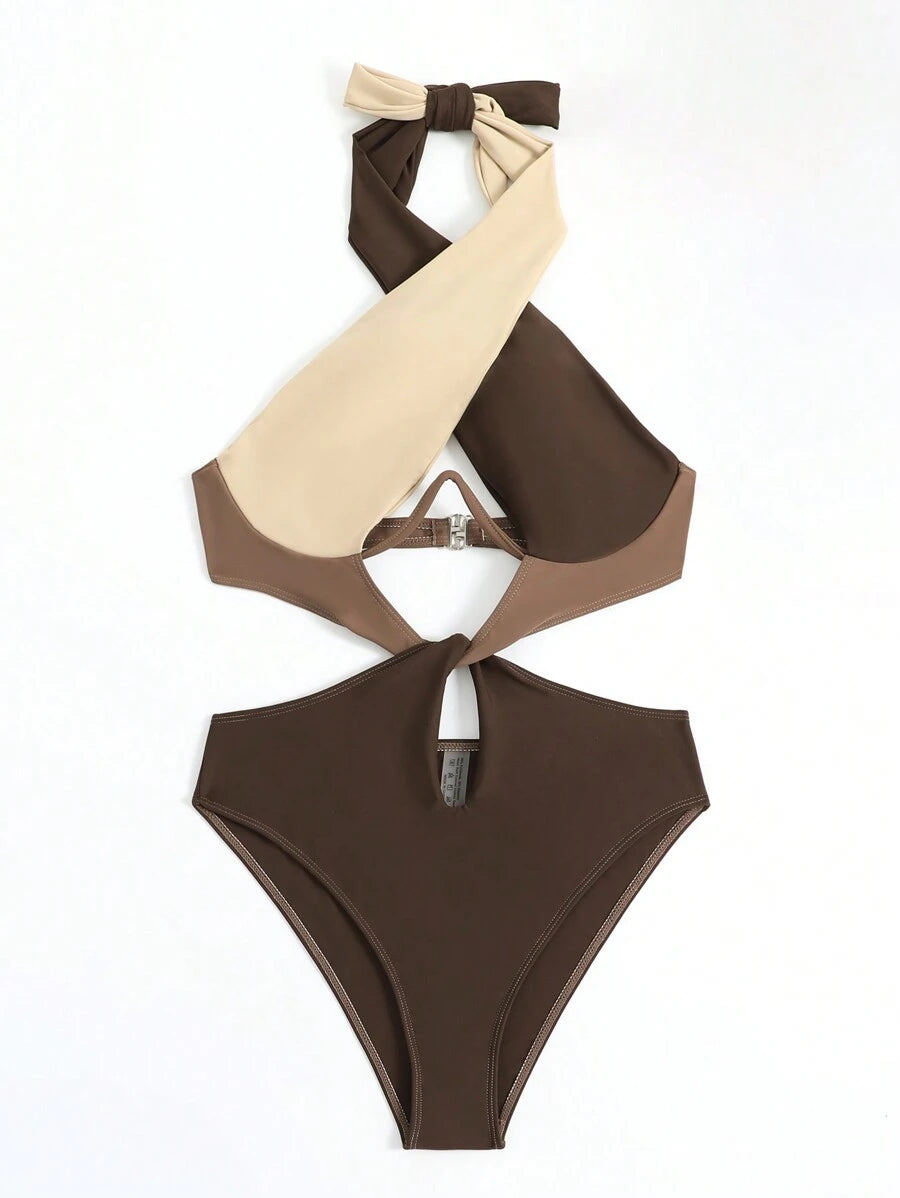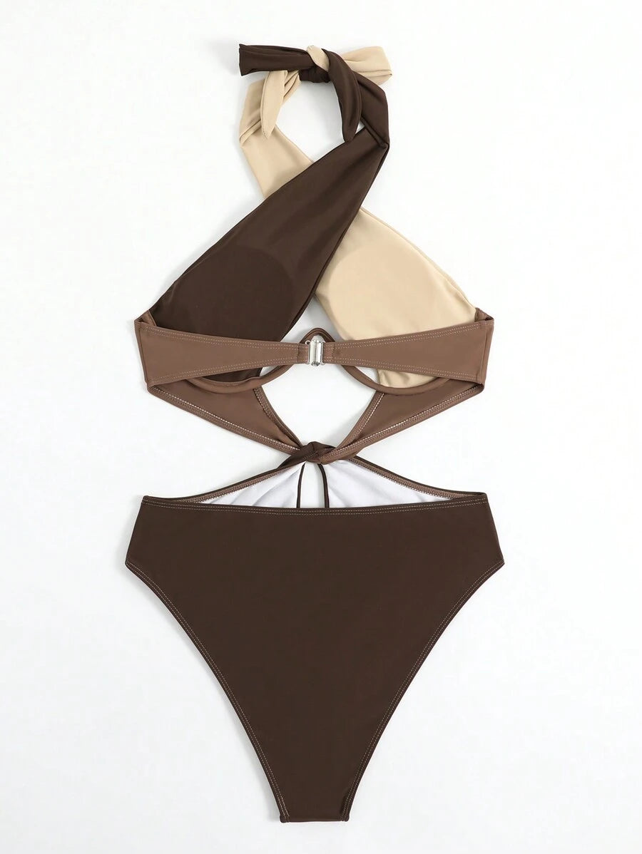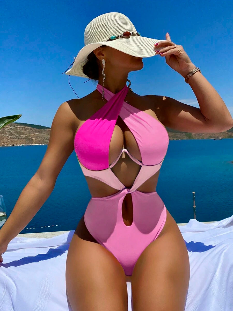 1 pieza traje de bano de un solo color con cuello de halter y aros, sin efecto push up