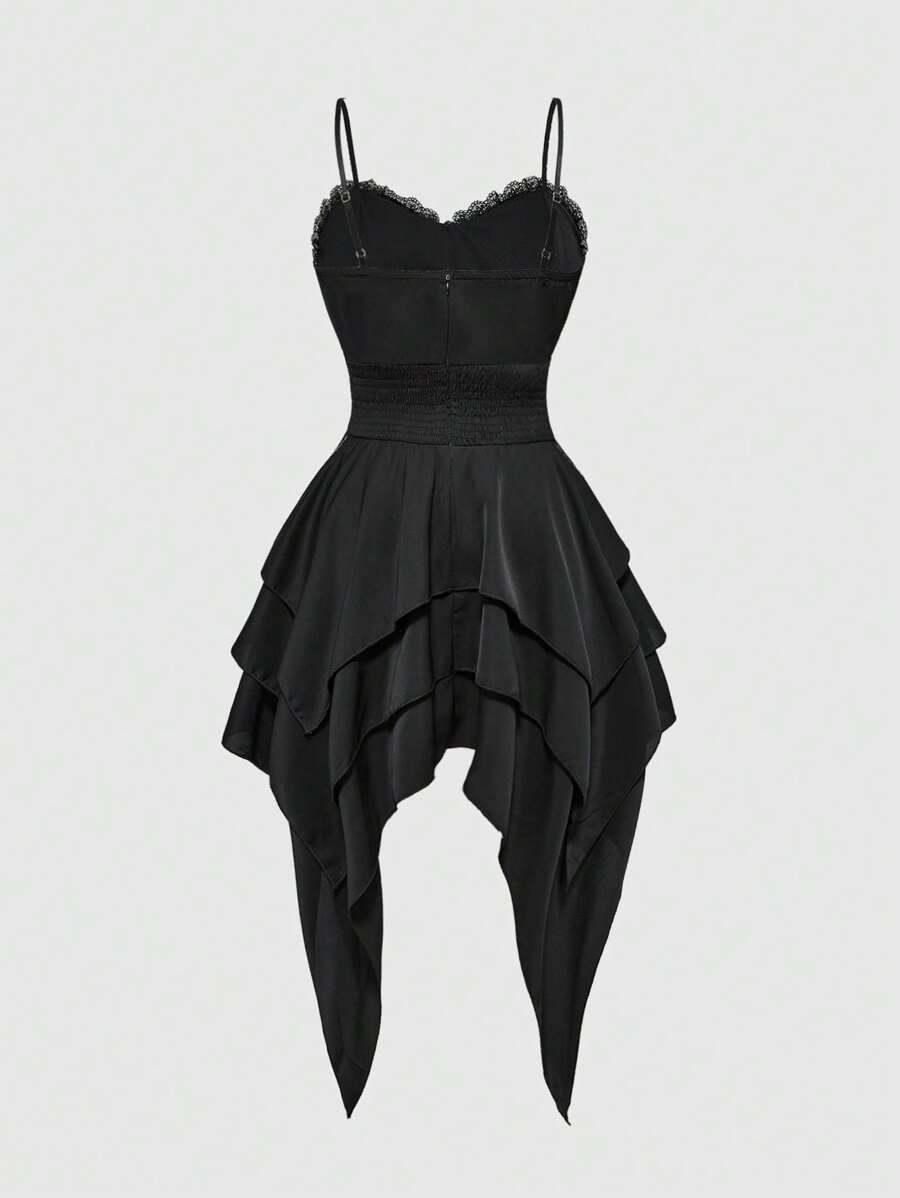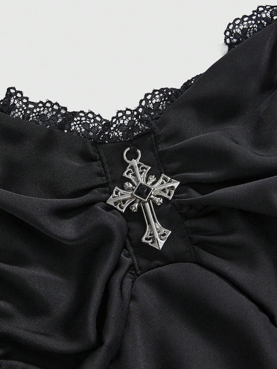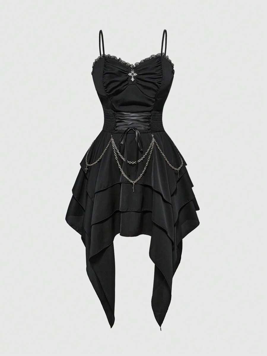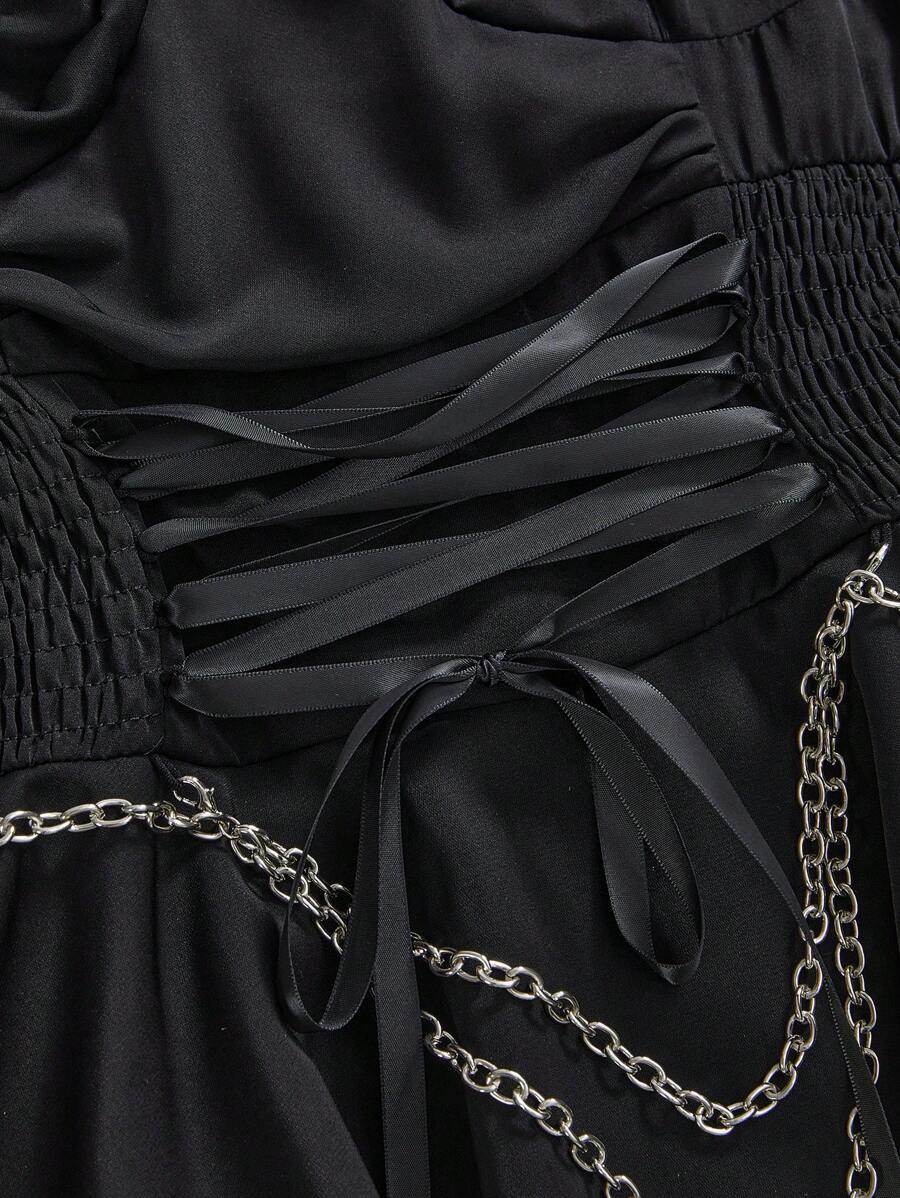 Vestido de mujer con cadena de metal extraible, cordones en la cintura, corte asimetrico y bajo con volantes en estilo vintage gotico palaciego