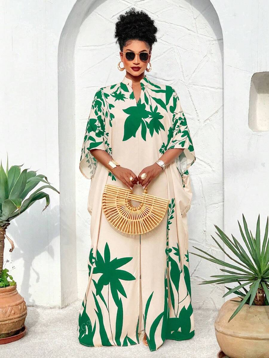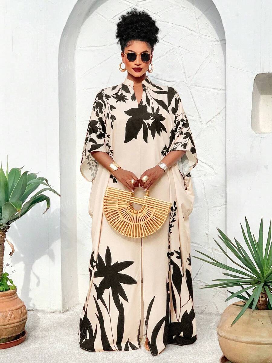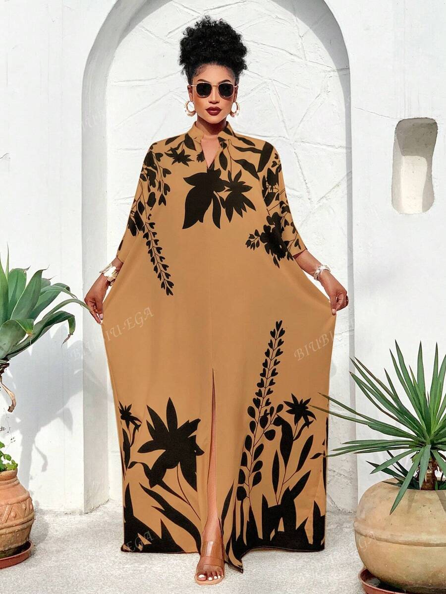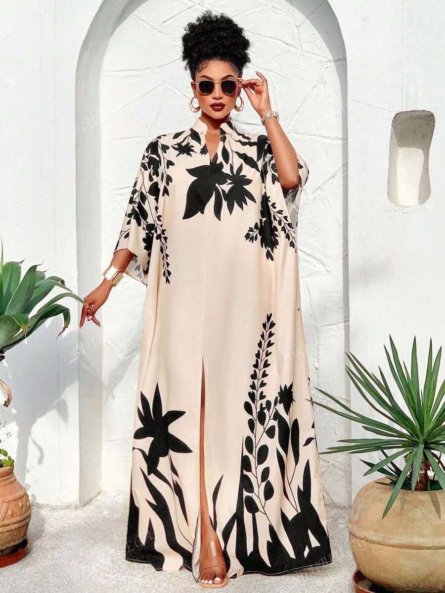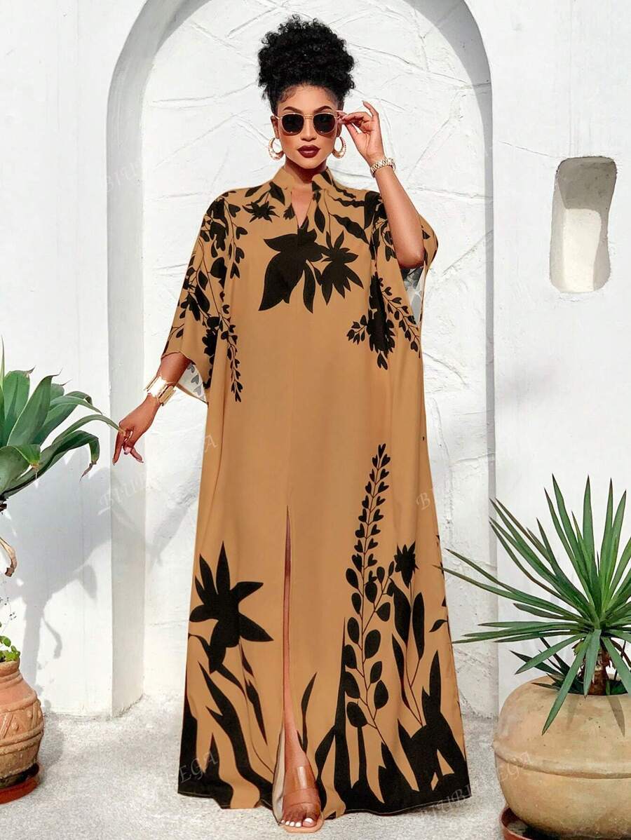 Falda larga con abertura media frontal arabe, holgada, estampada con elementos de sol/planta, una importante prenda de moda para el verano y las vacaciones de primavera, para mujer talla grande
