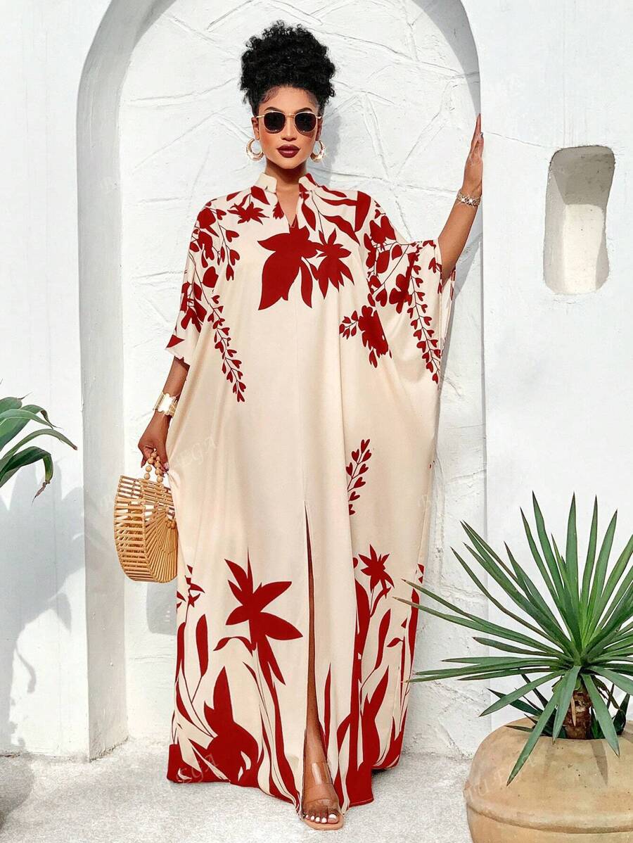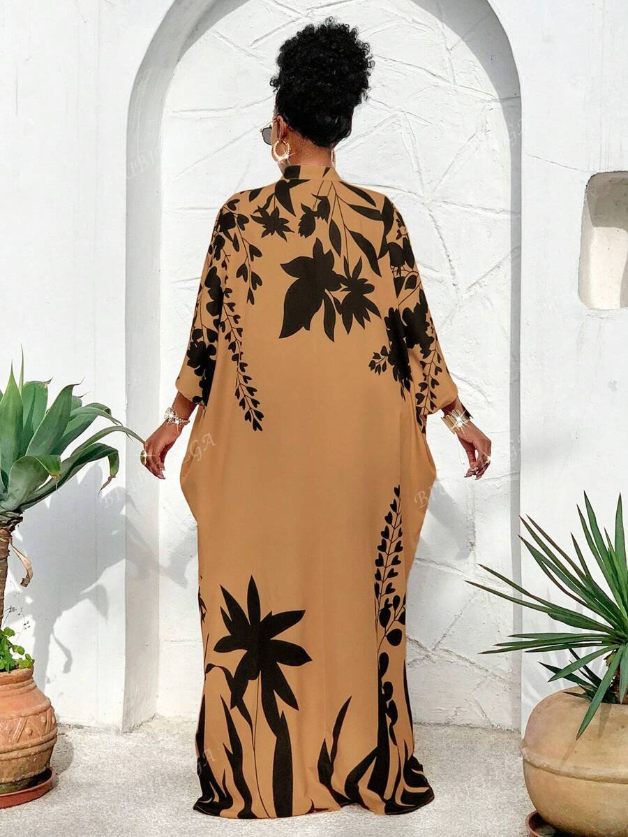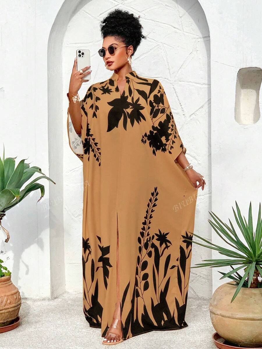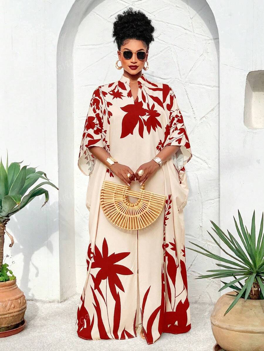 Falda larga con abertura media frontal arabe, holgada, estampada con elementos de sol/planta, una importante prenda de moda para el verano y las vacaciones de primavera, para mujer talla grande
