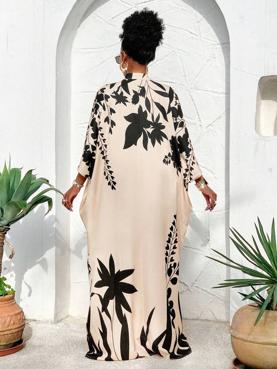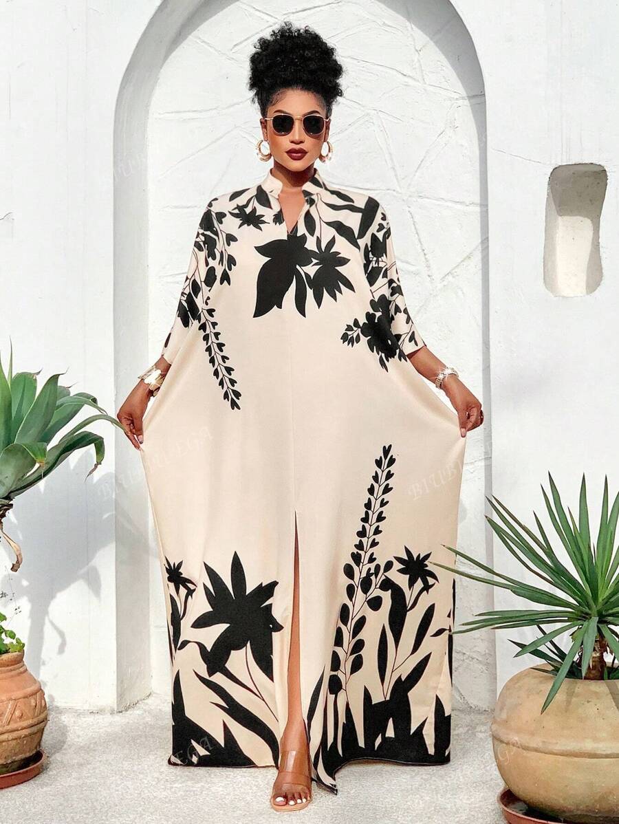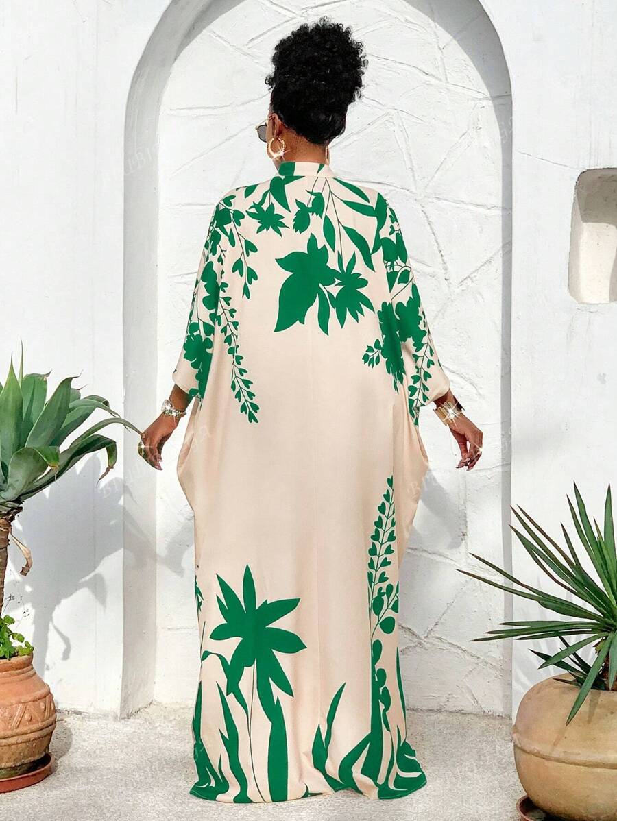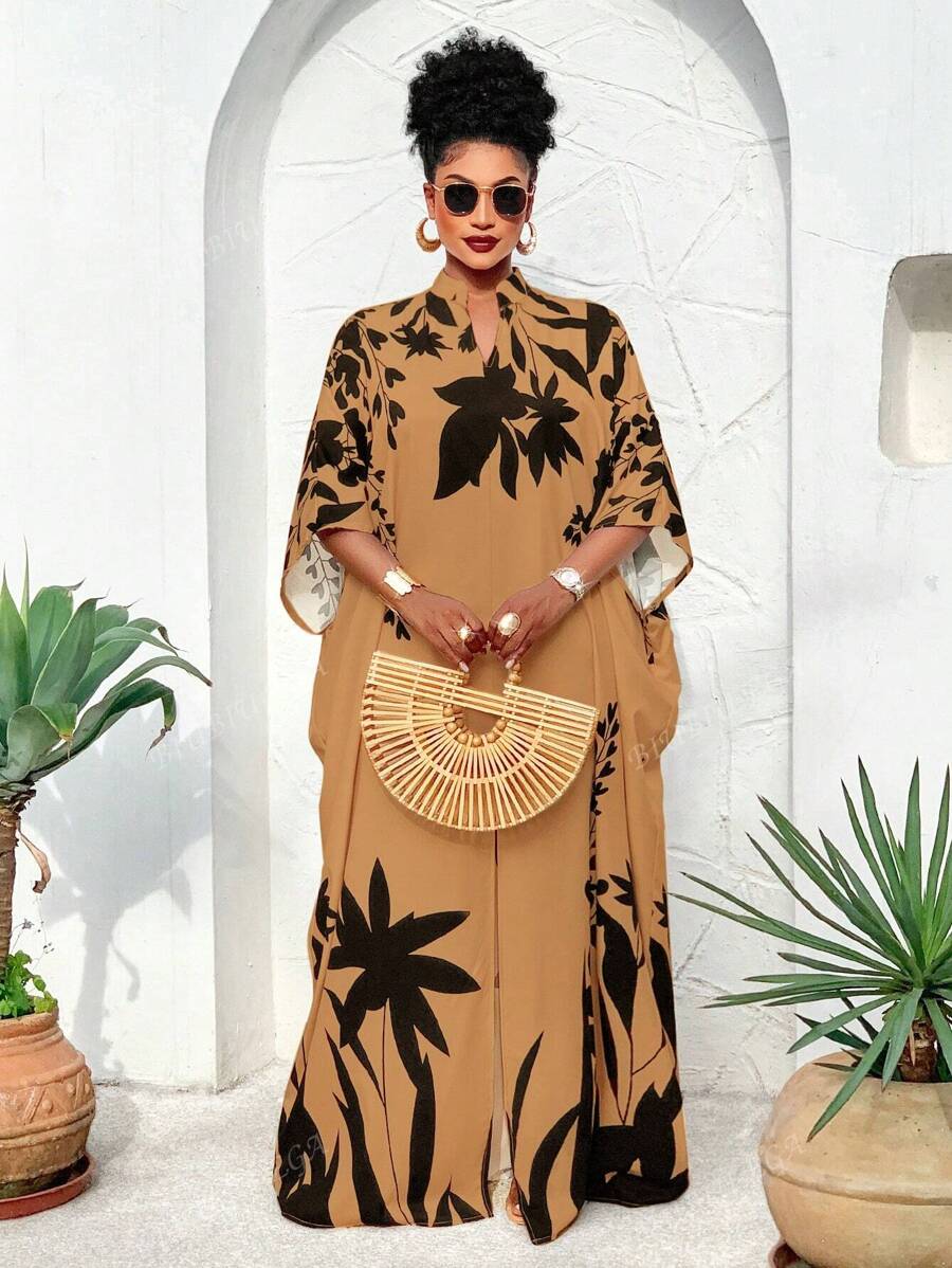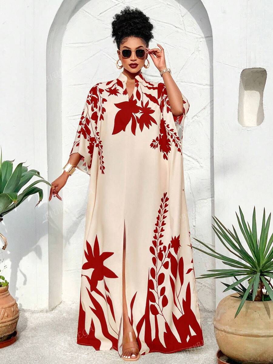 Falda larga con abertura media frontal arabe, holgada, estampada con elementos de sol/planta, una importante prenda de moda para el verano y las vacaciones de primavera, para mujer talla grande