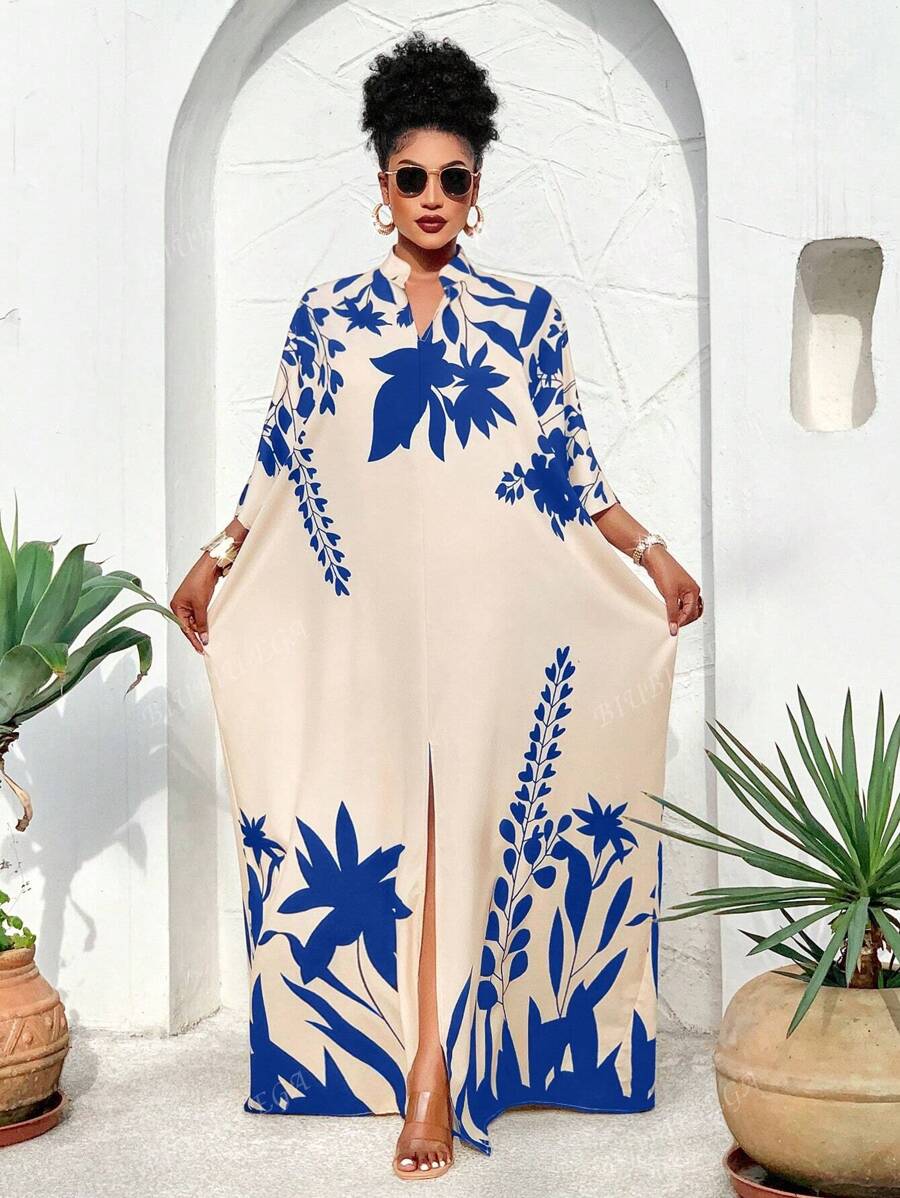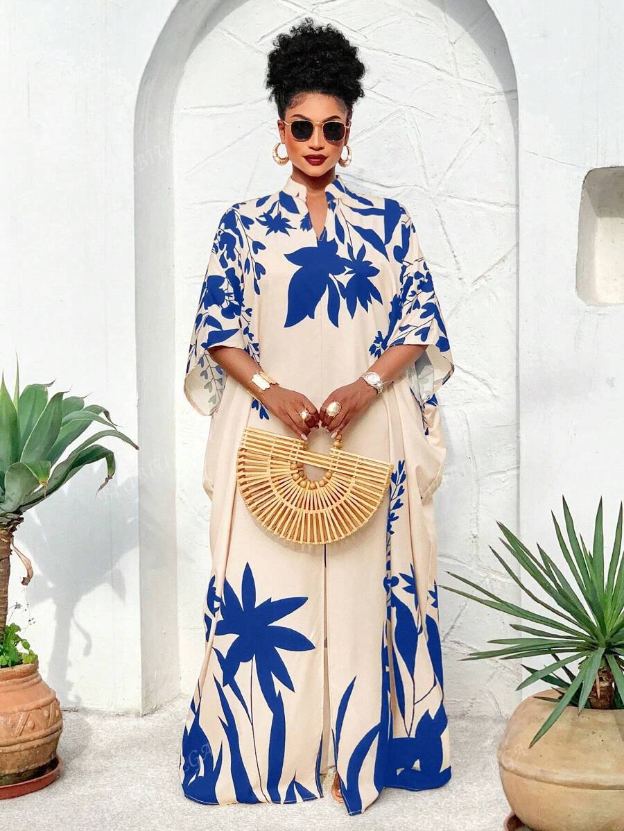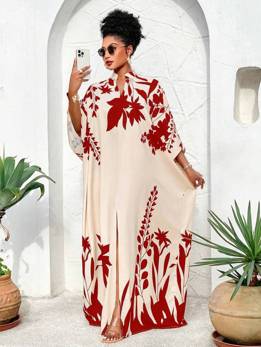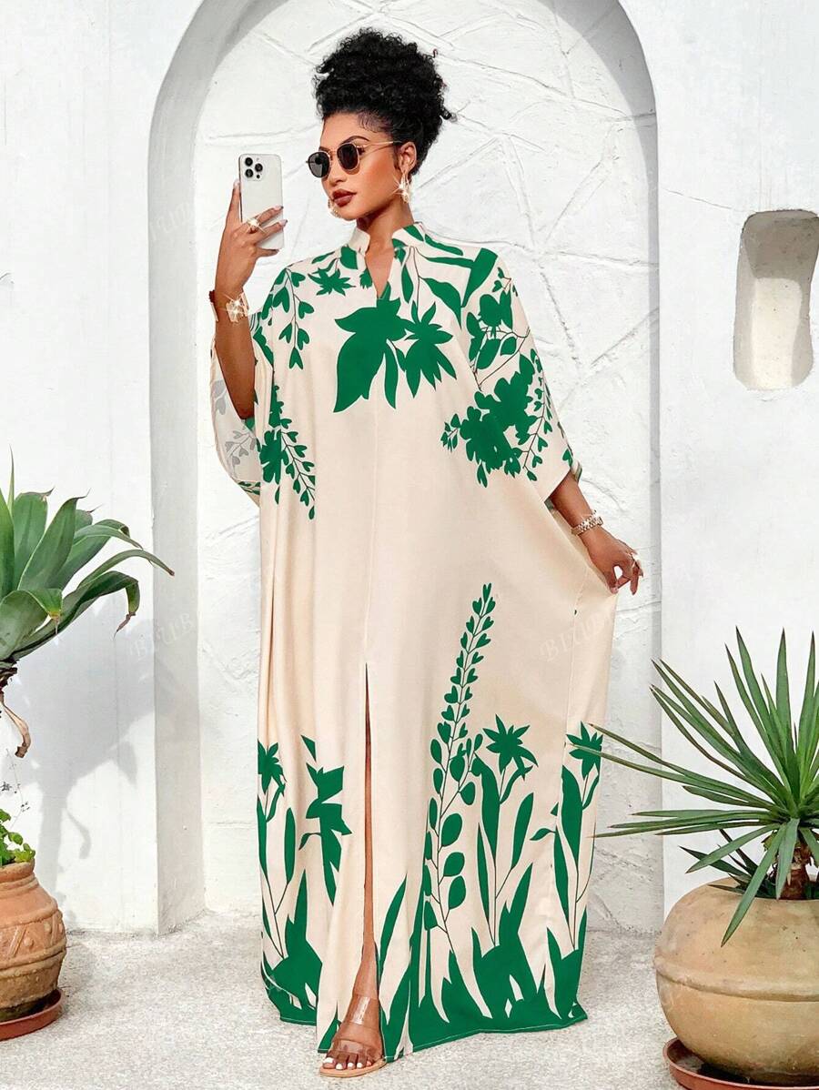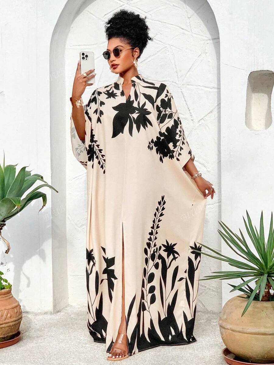 Falda larga con abertura media frontal arabe, holgada, estampada con elementos de sol/planta, una importante prenda de moda para el verano y las vacaciones de primavera, para mujer talla grande