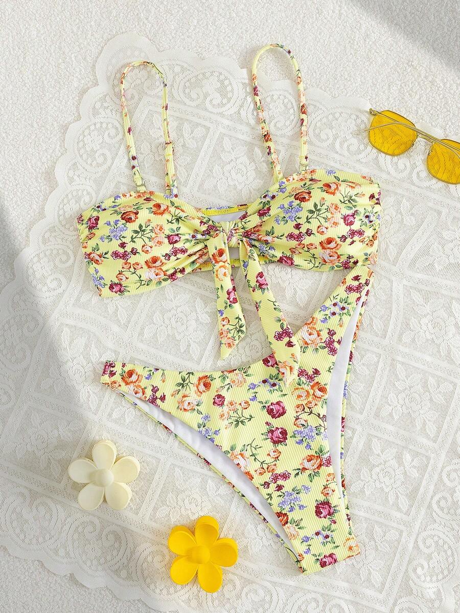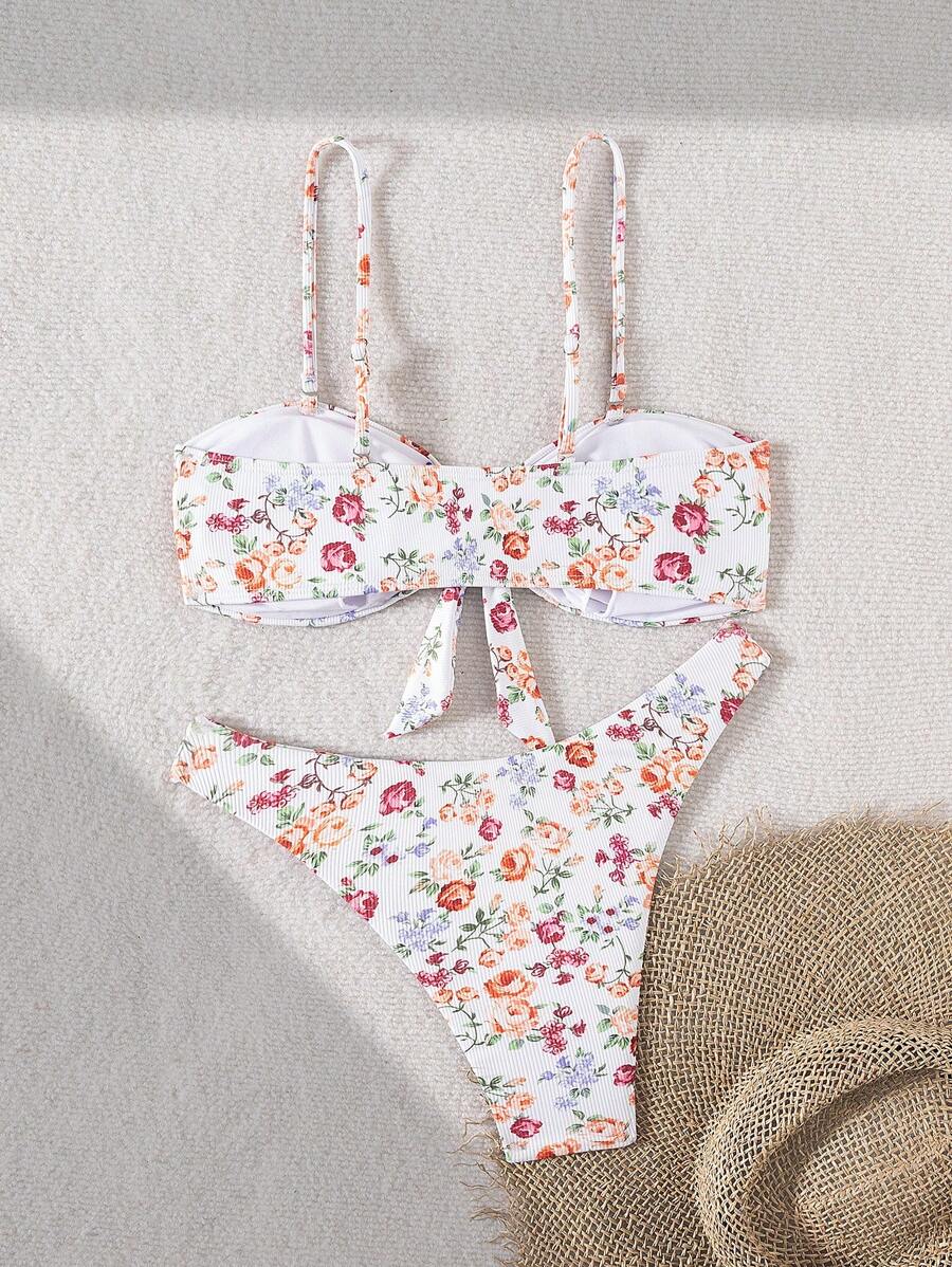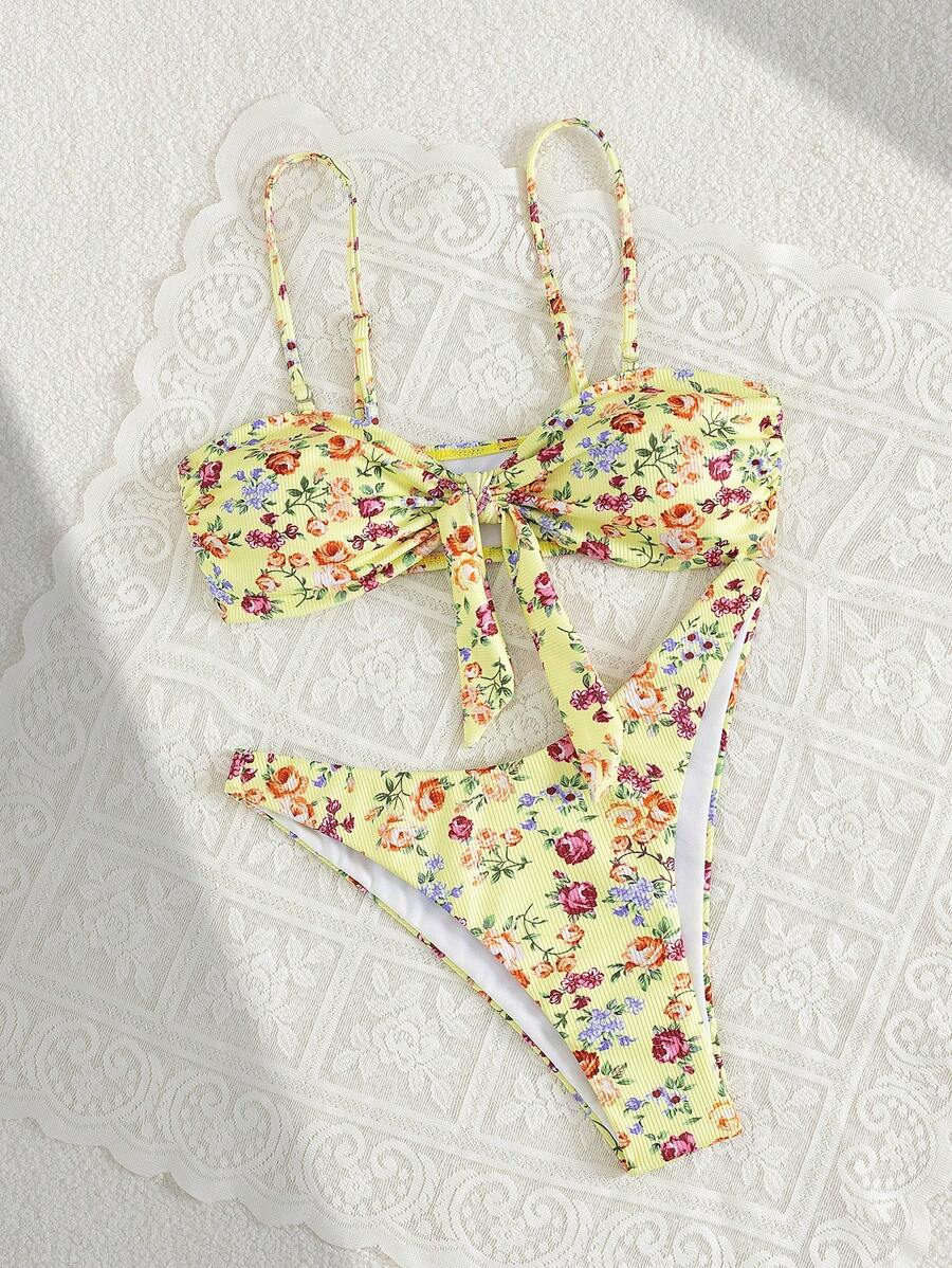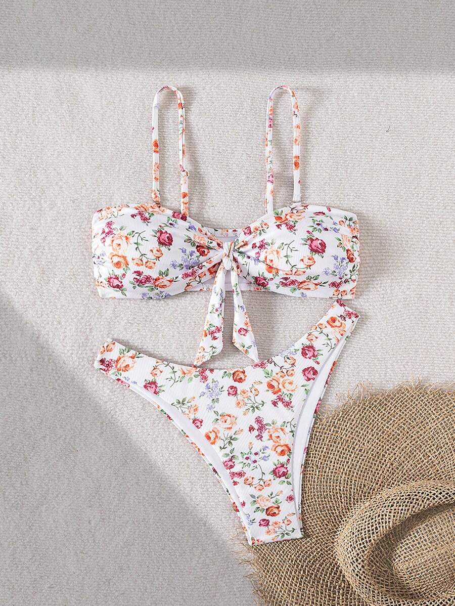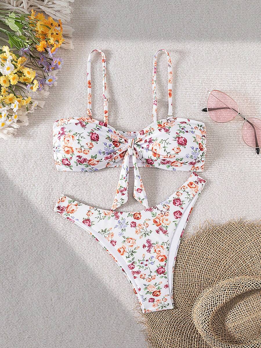 2 piezas conjuntos de ropa de verano para playa para mujer, top de tirantes con estampado floral y conjunto de bikini lindo con lazos a los lados