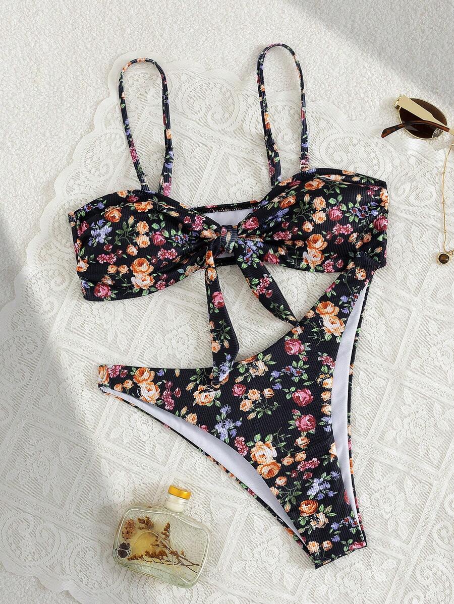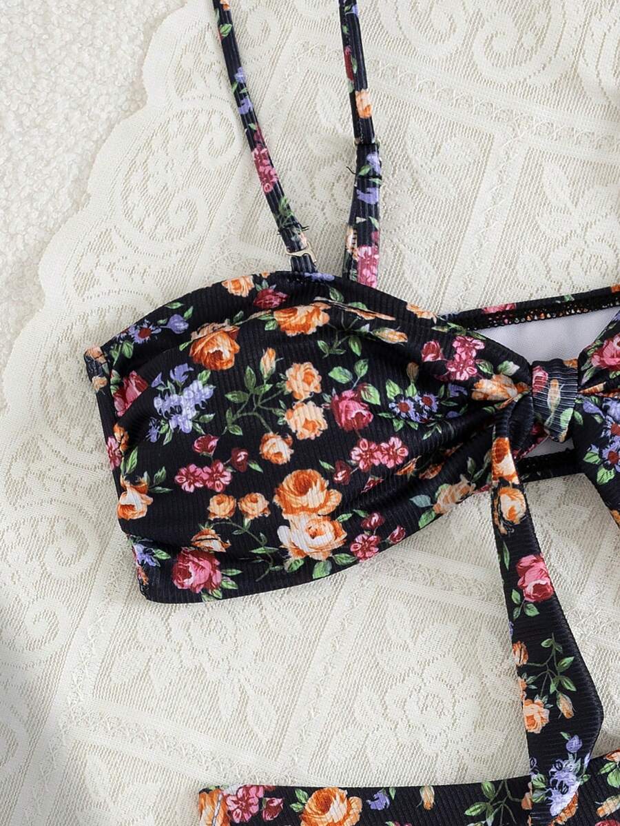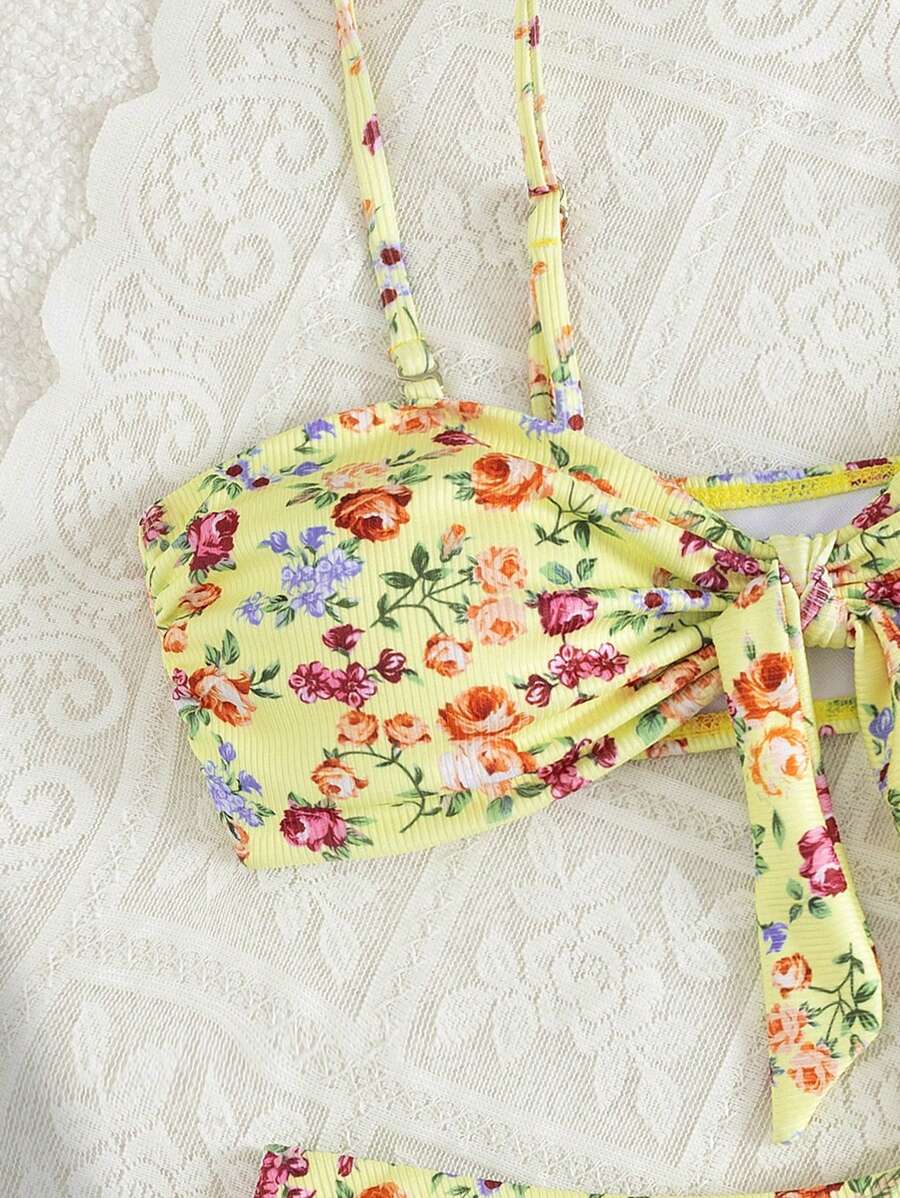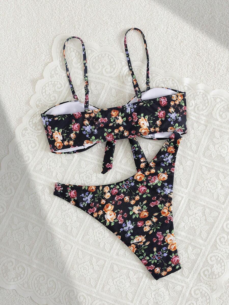 2 piezas conjuntos de ropa de verano para playa para mujer, top de tirantes con estampado floral y conjunto de bikini lindo con lazos a los lados
