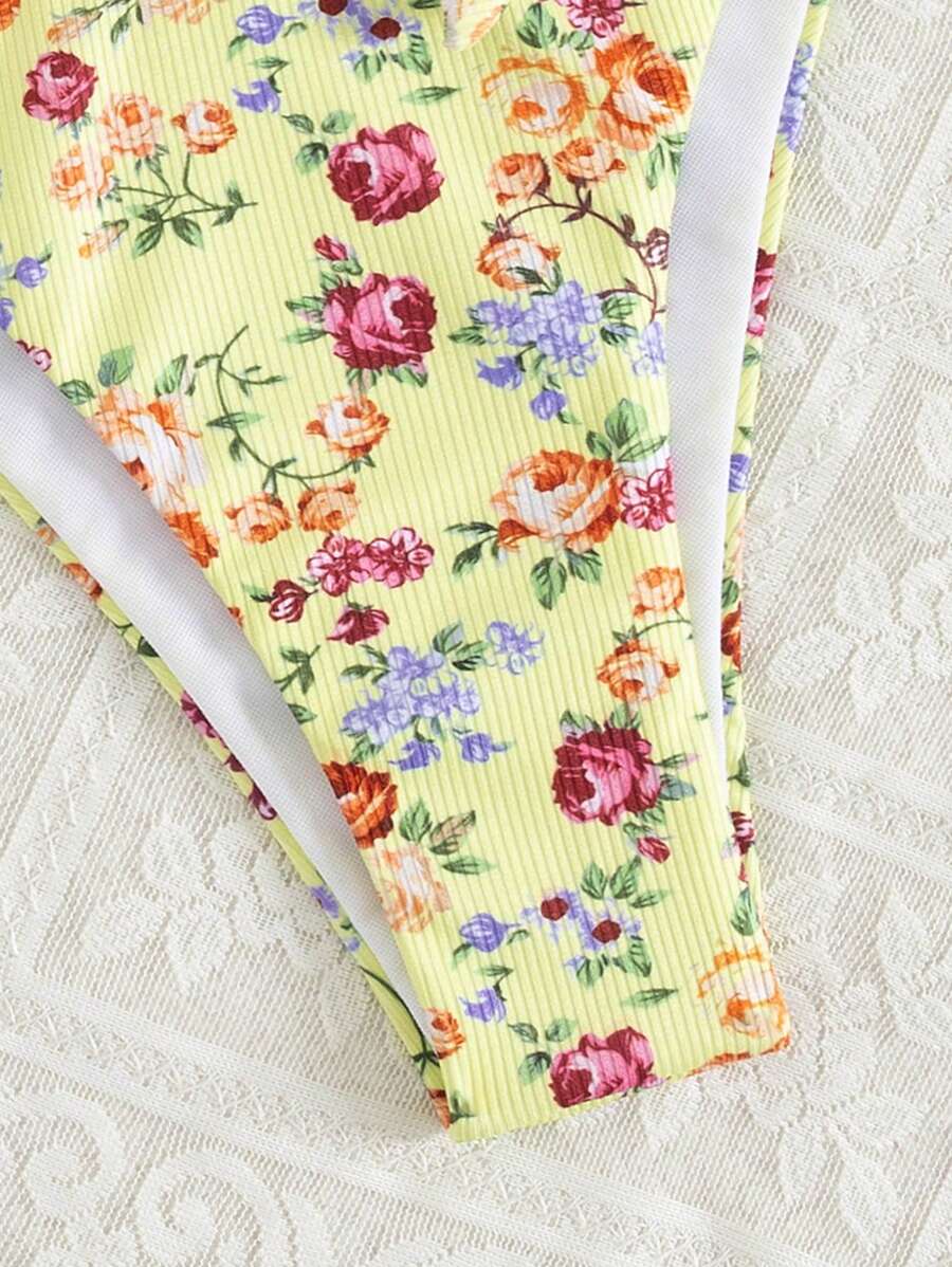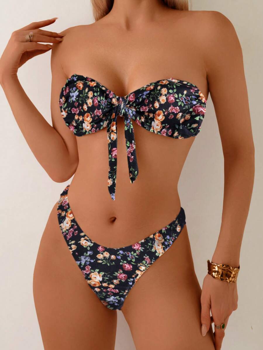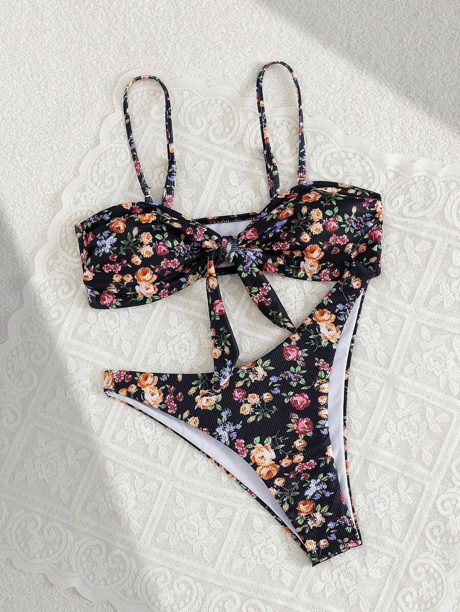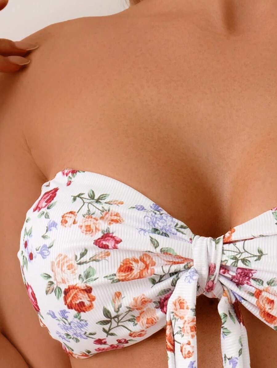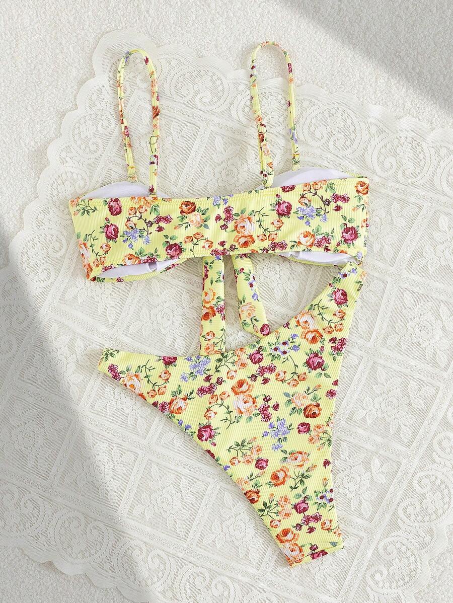 2 piezas conjuntos de ropa de verano para playa para mujer, top de tirantes con estampado floral y conjunto de bikini lindo con lazos a los lados