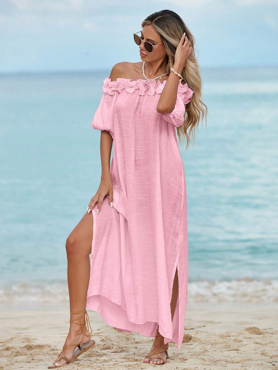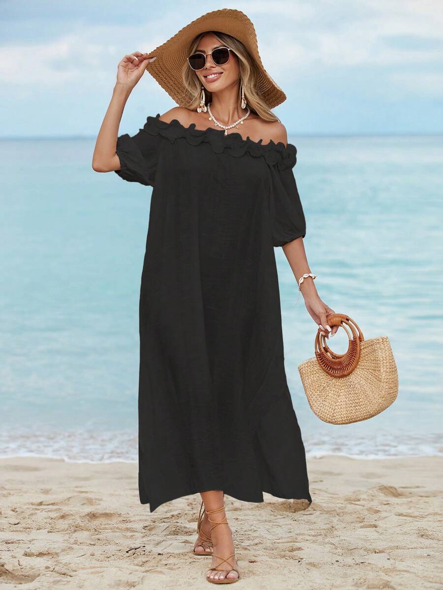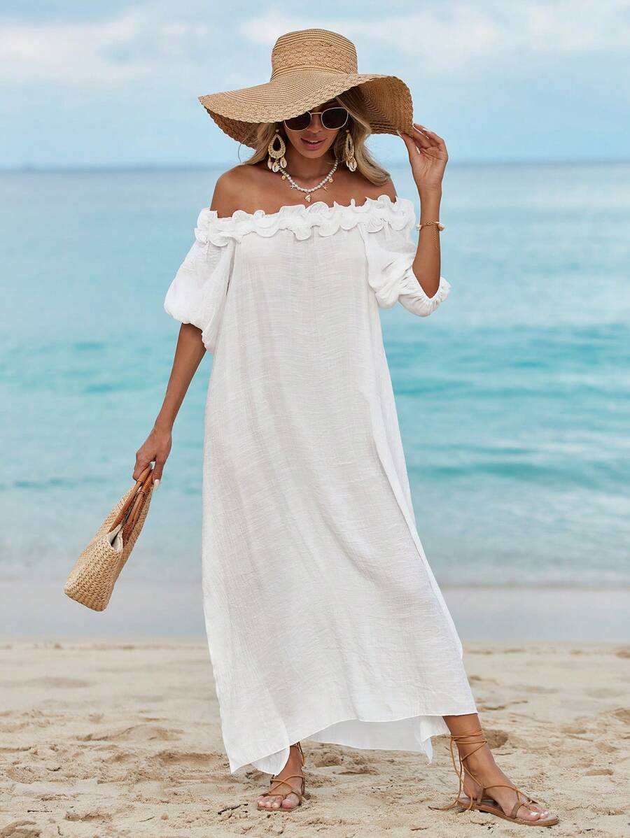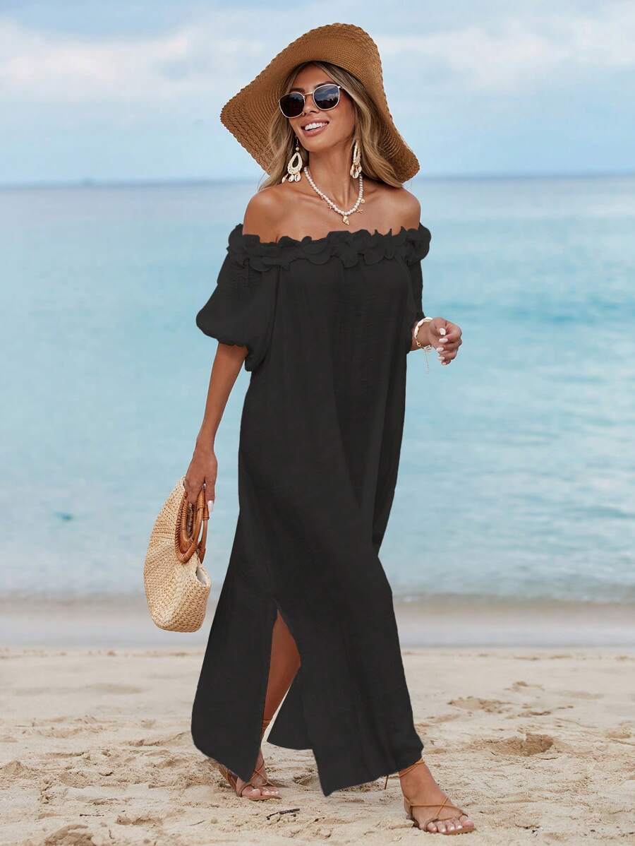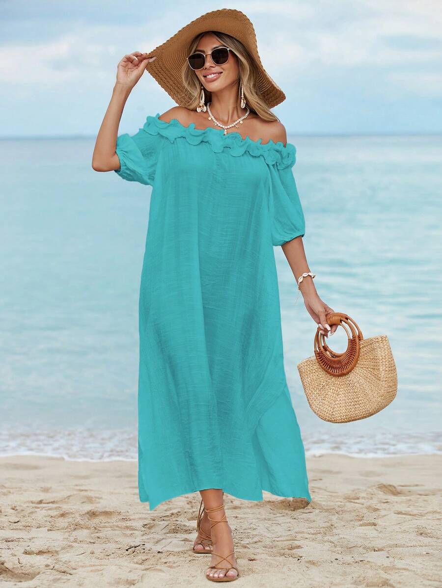 Vestido de playa midi con volantes y hombros descubiertos para mujer, ropa de playa sexy, vestido de invitada de boda con mangas farol y abertura, vestido fluido