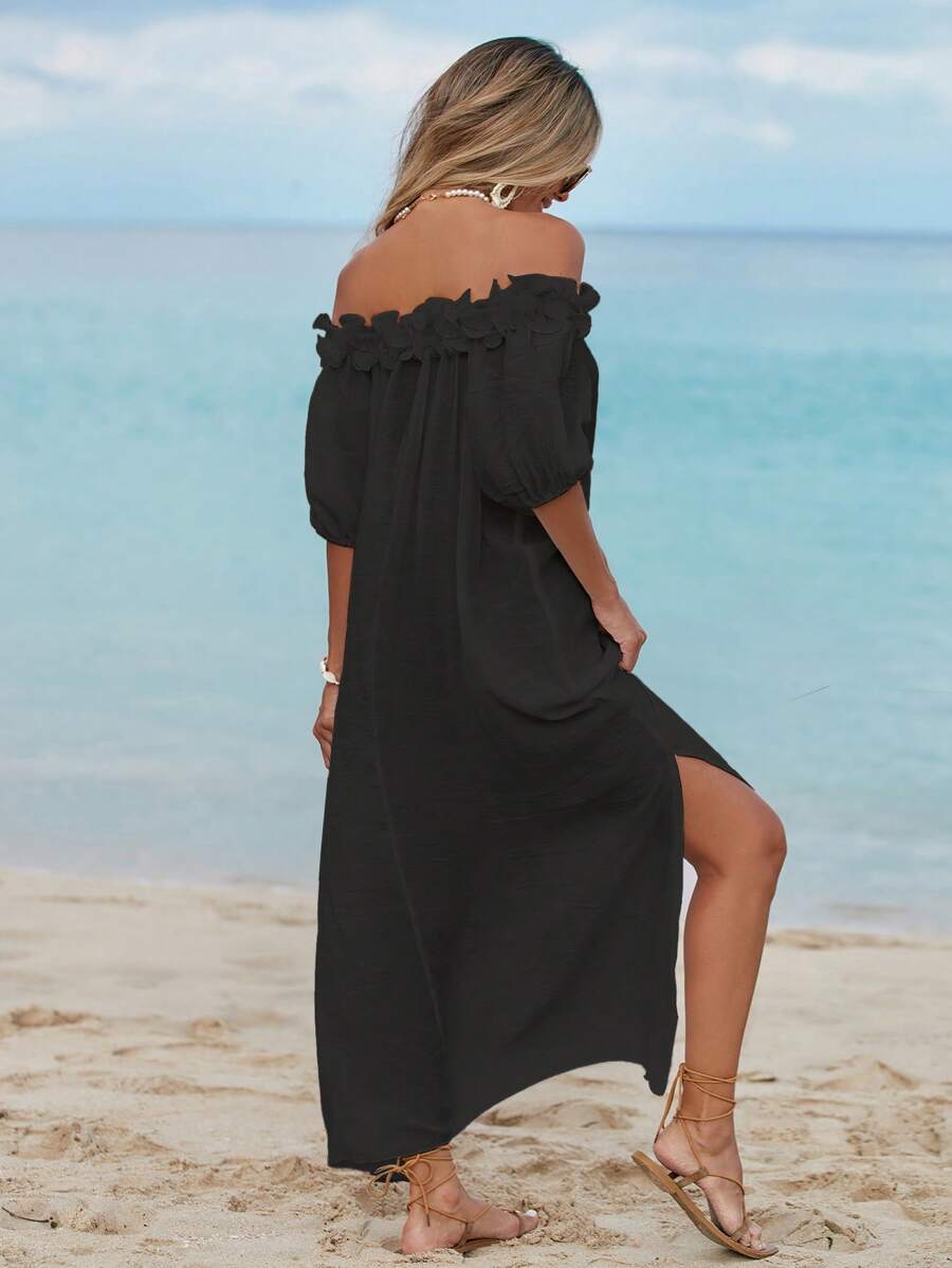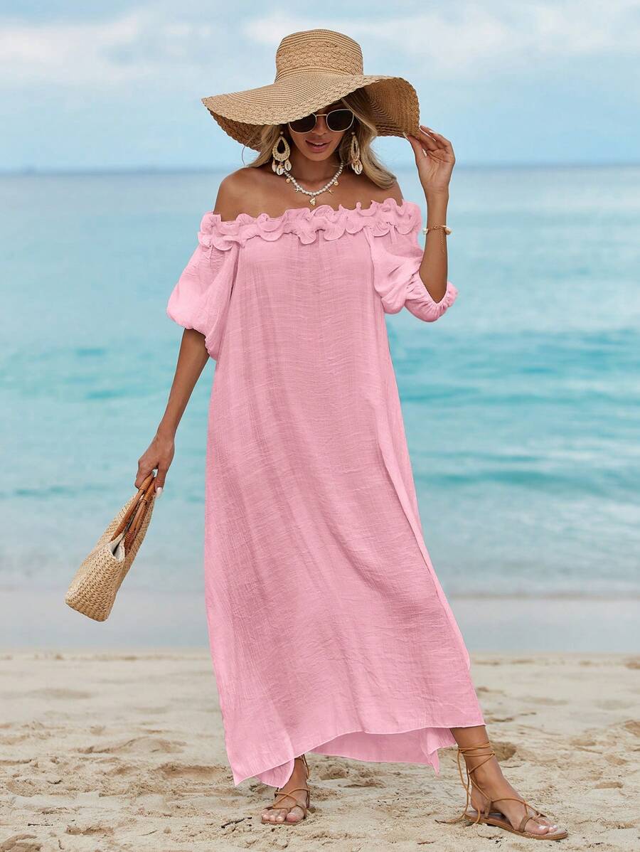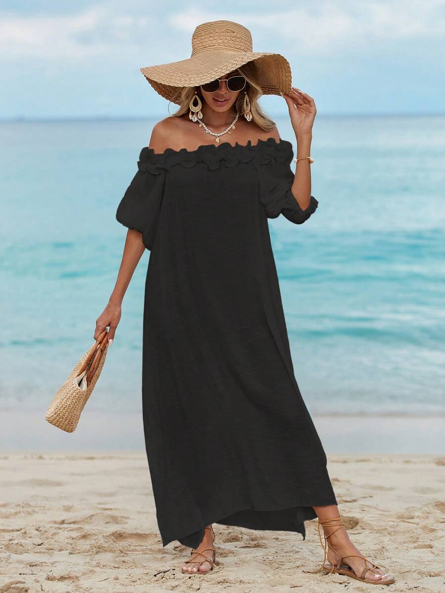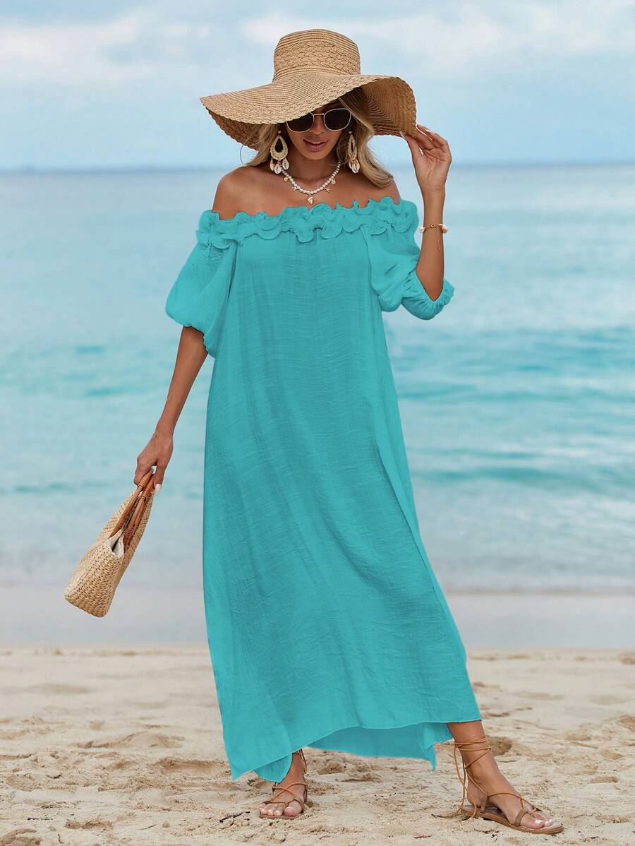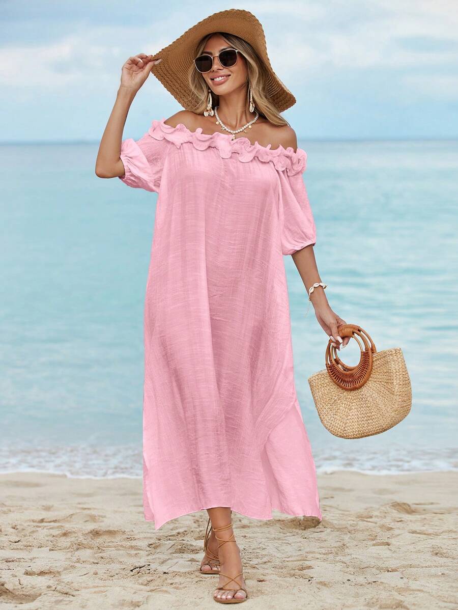 Vestido de playa midi con volantes y hombros descubiertos para mujer, ropa de playa sexy, vestido de invitada de boda con mangas farol y abertura, vestido fluido
