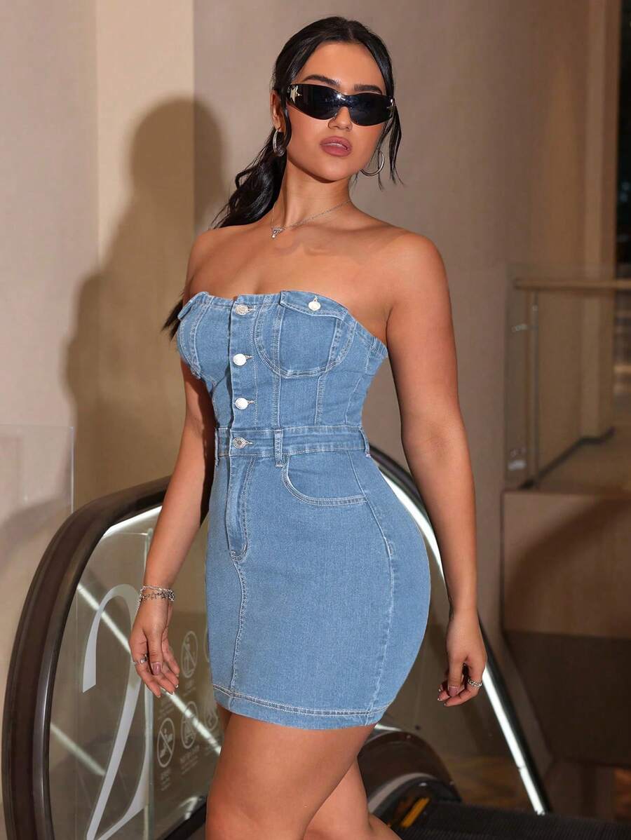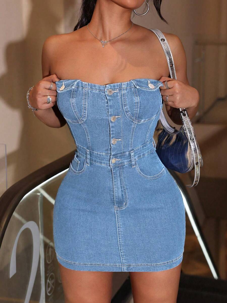 Vestido de tubo ajustado de tela vaquera con un solo botonadura y elastico, talla grande, para el verano