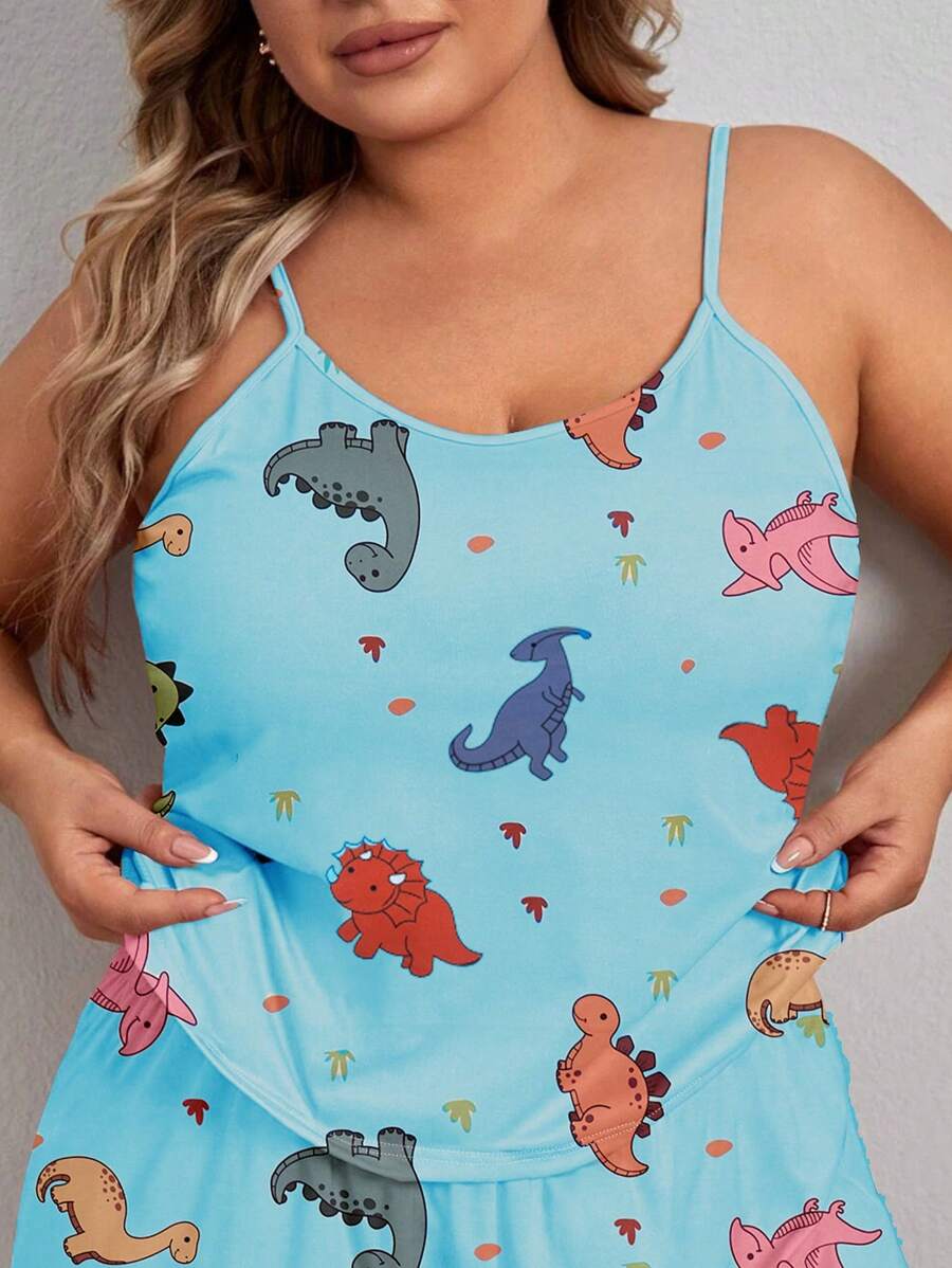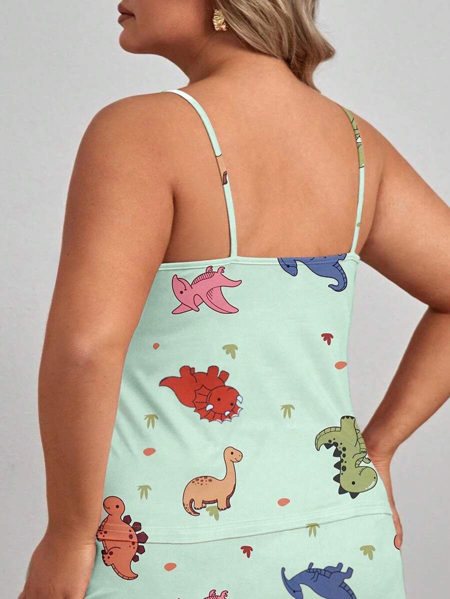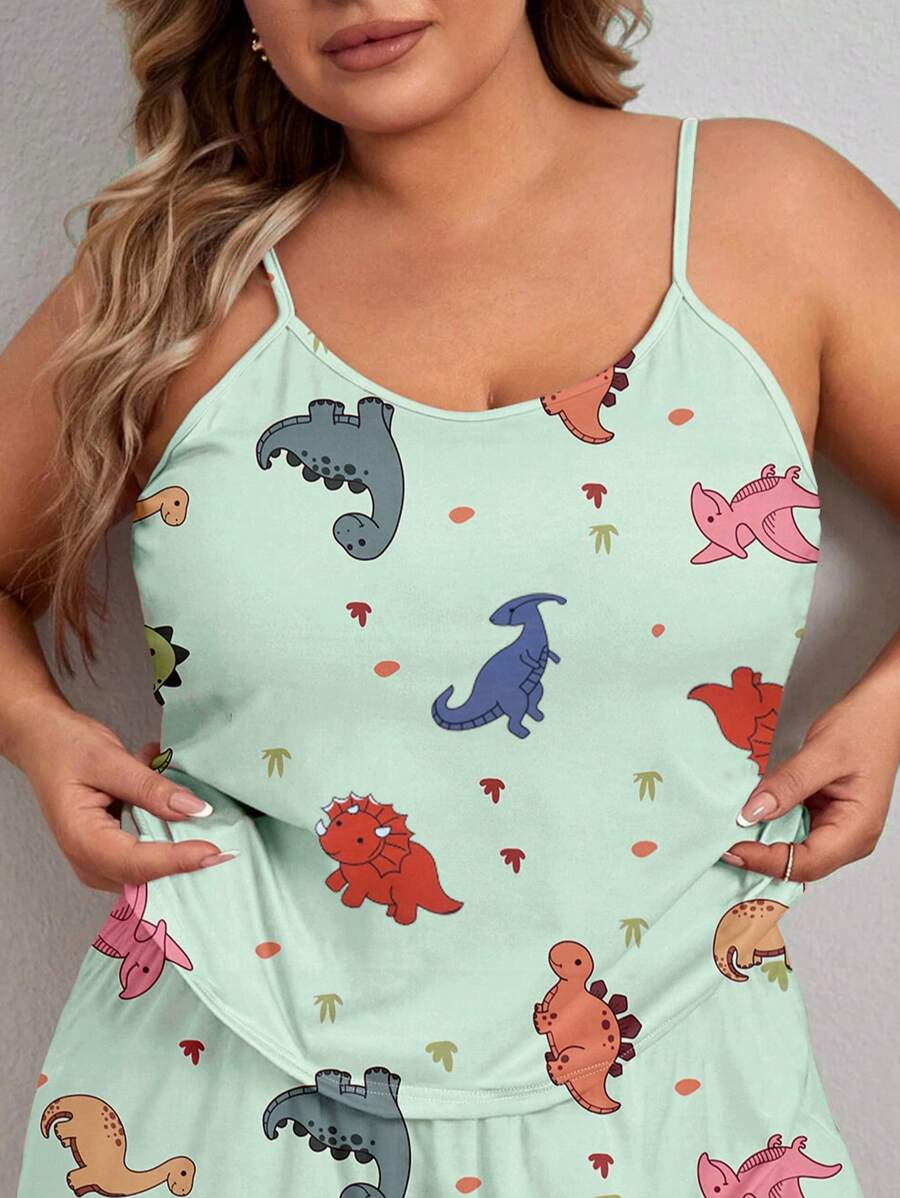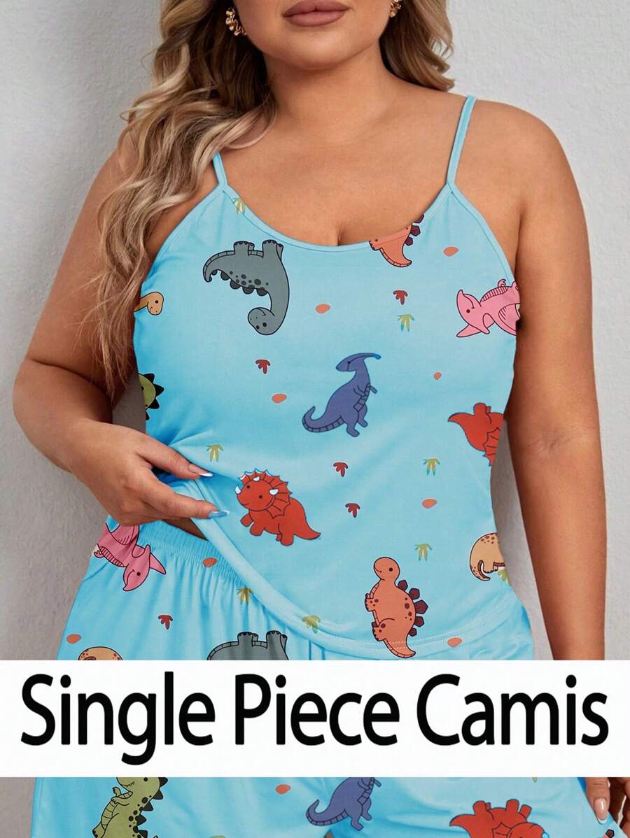 1 pieza camiseta sin mangas para mujer talla grande, parte superior con tirantes finos y escote redondo con estampado de dinosaurio lindo, primavera/verano