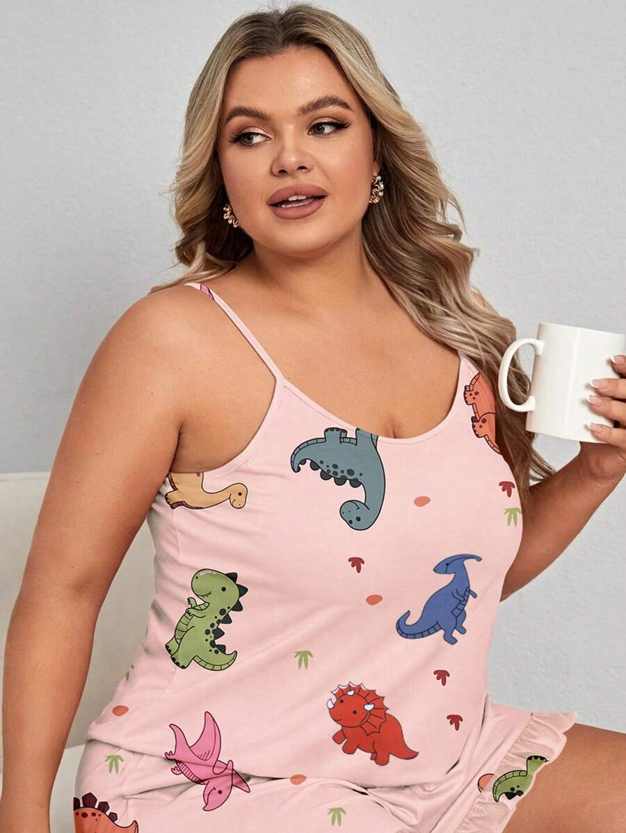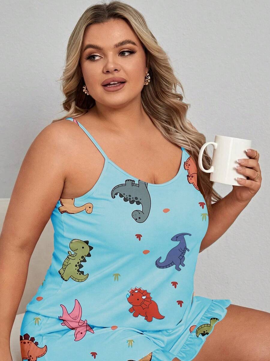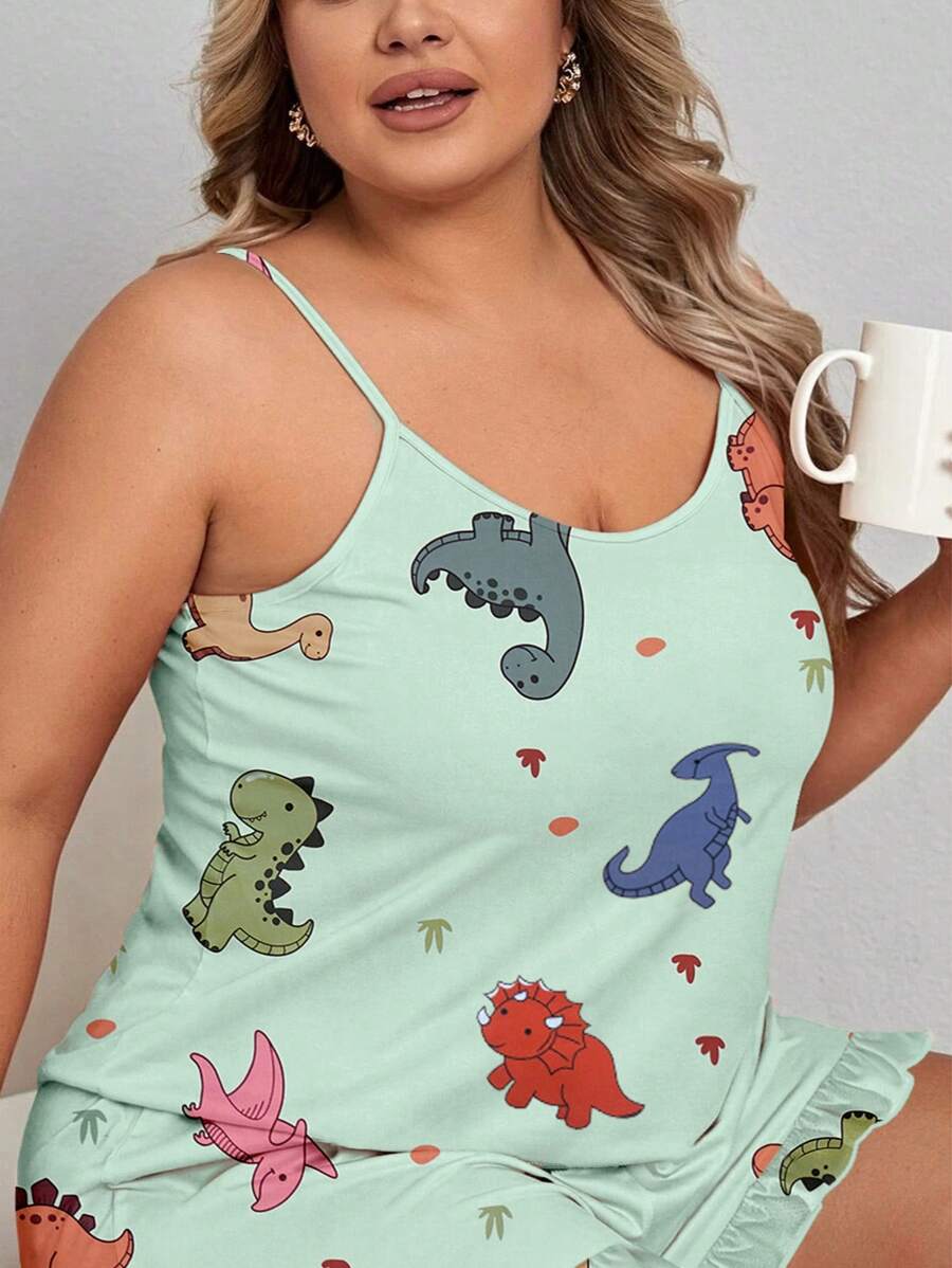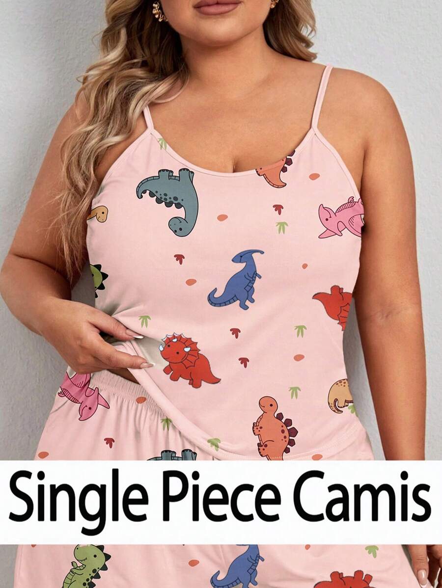 1 pieza camiseta sin mangas para mujer talla grande, parte superior con tirantes finos y escote redondo con estampado de dinosaurio lindo, primavera/verano